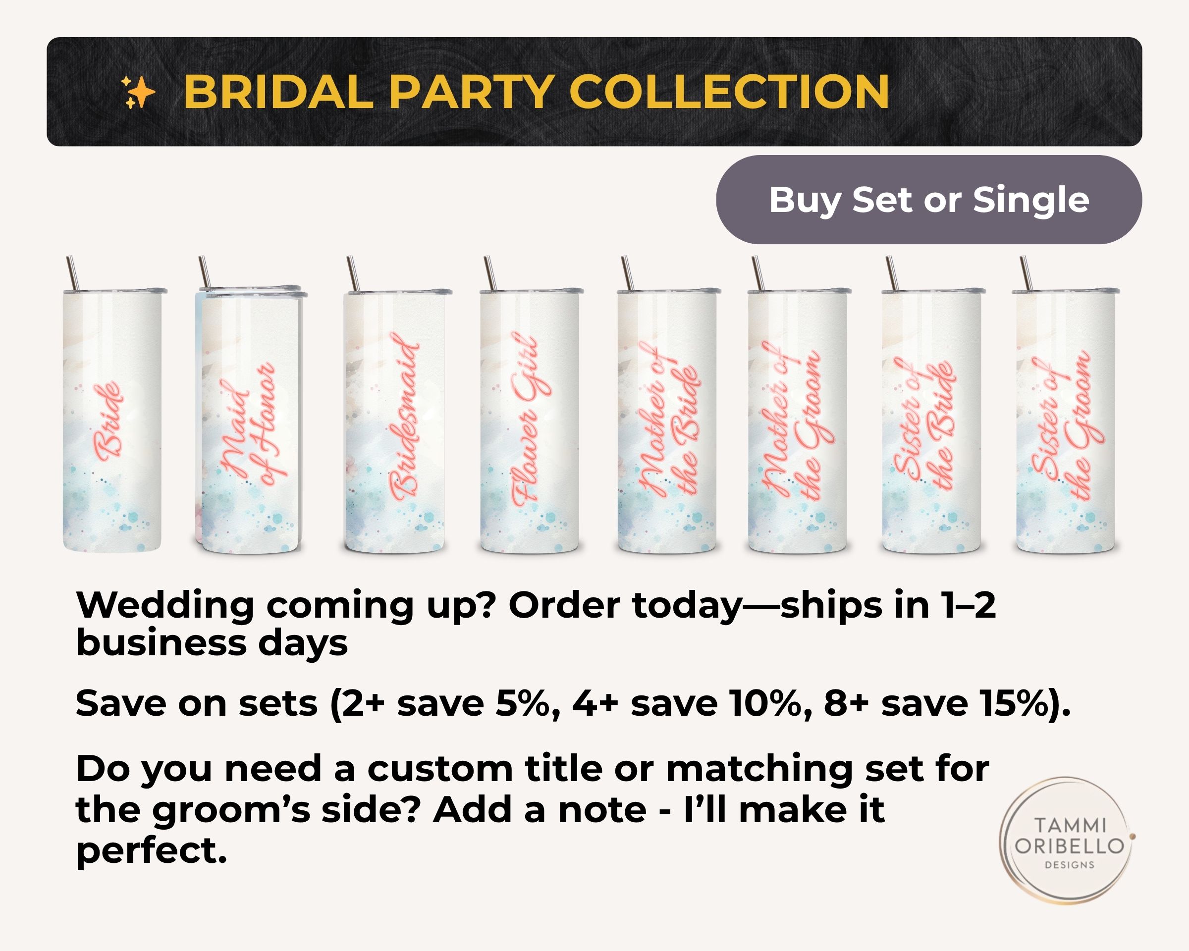 A pretty pastel flower watercolor design with coordinated script creates a timeless bridal party gift. Choose any role (Bridesmaid, Maid of Honor, Flower Girl, Moms, Sisters) as single cups or build a matching set. Add a name to make it personal and wedding-day ready.