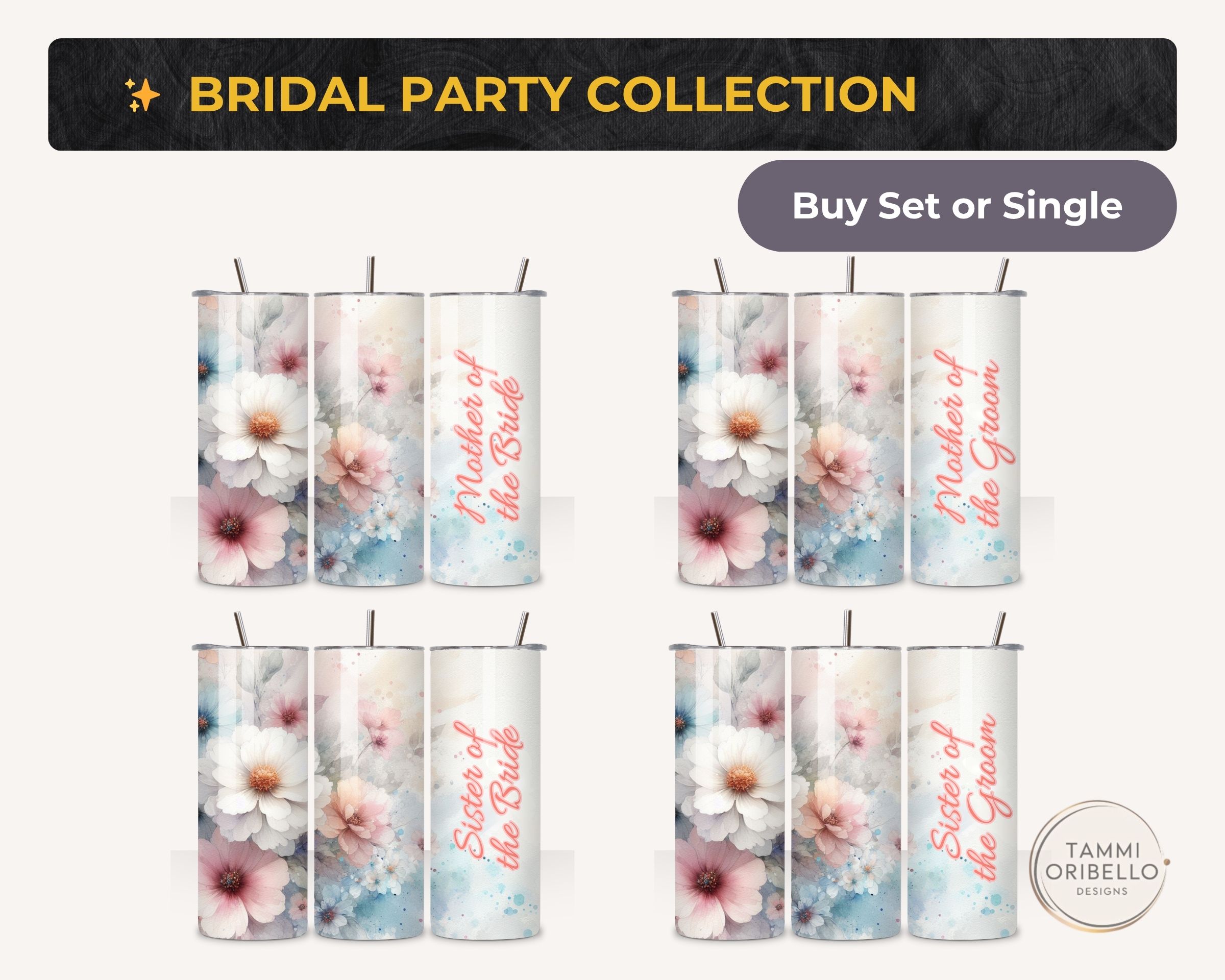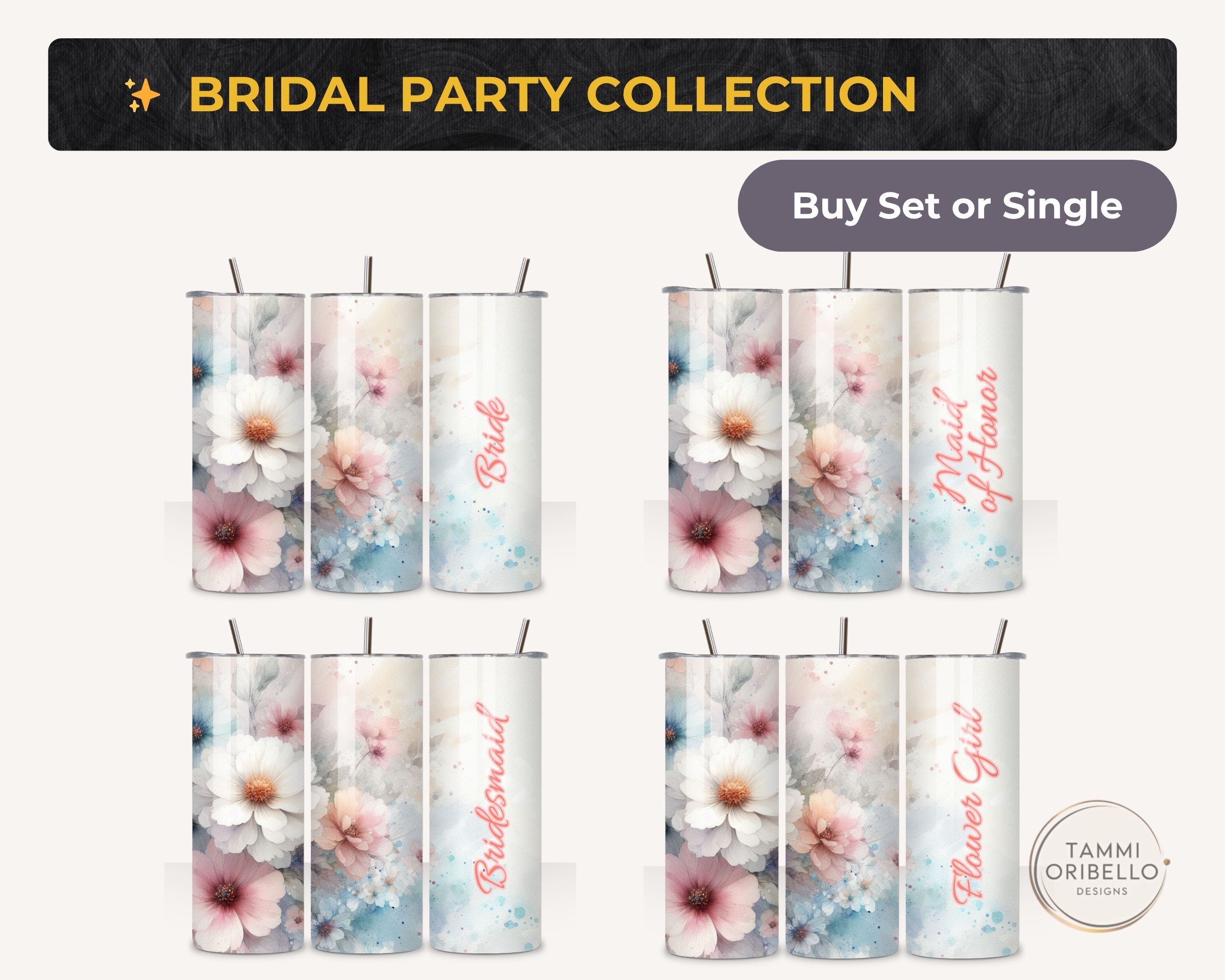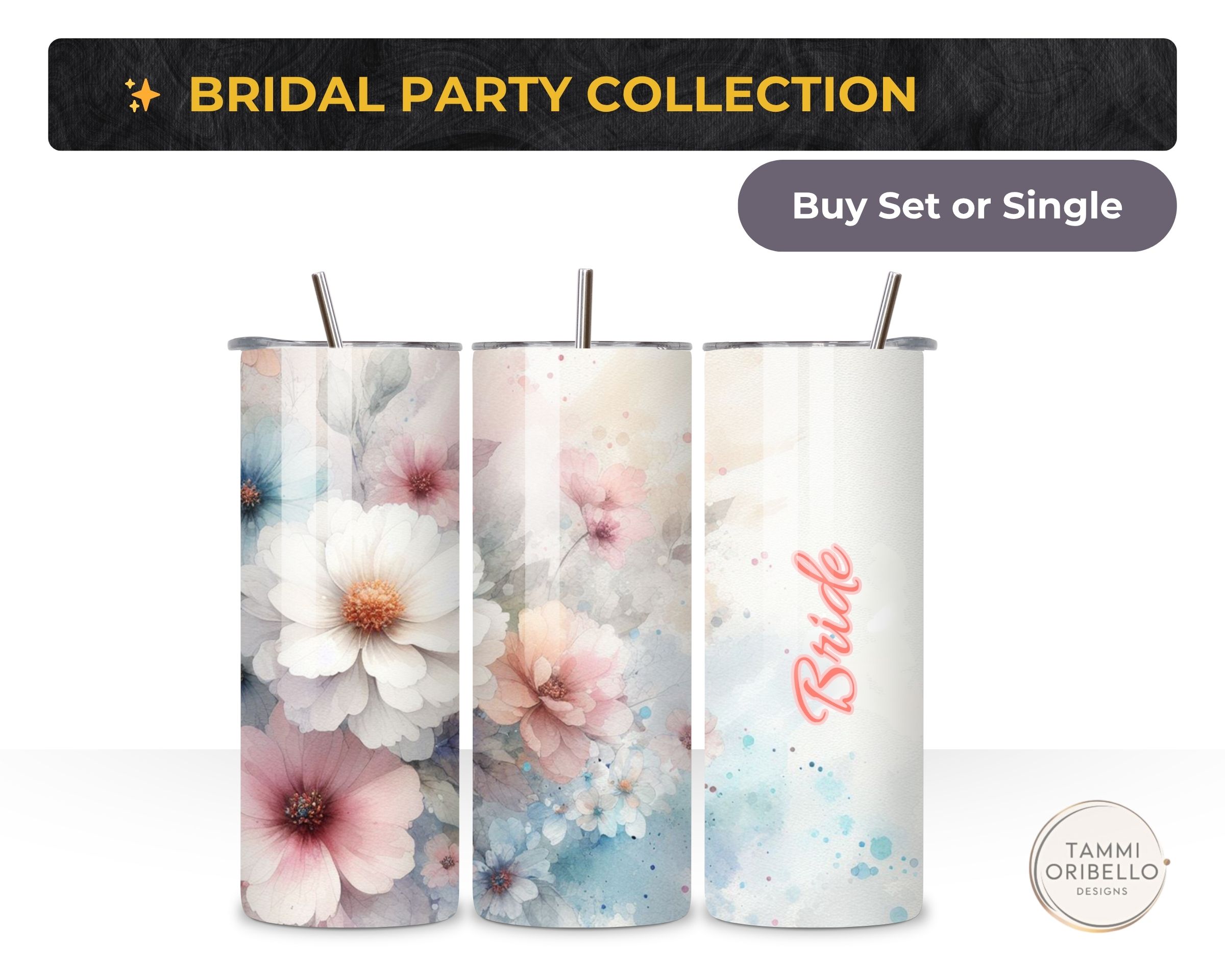 Soft pastel flower design on 20 oz stainless tumblers for the bridal party. Buy one or build a set. Optional names. Gift-ready. Ships in 1–2 days.