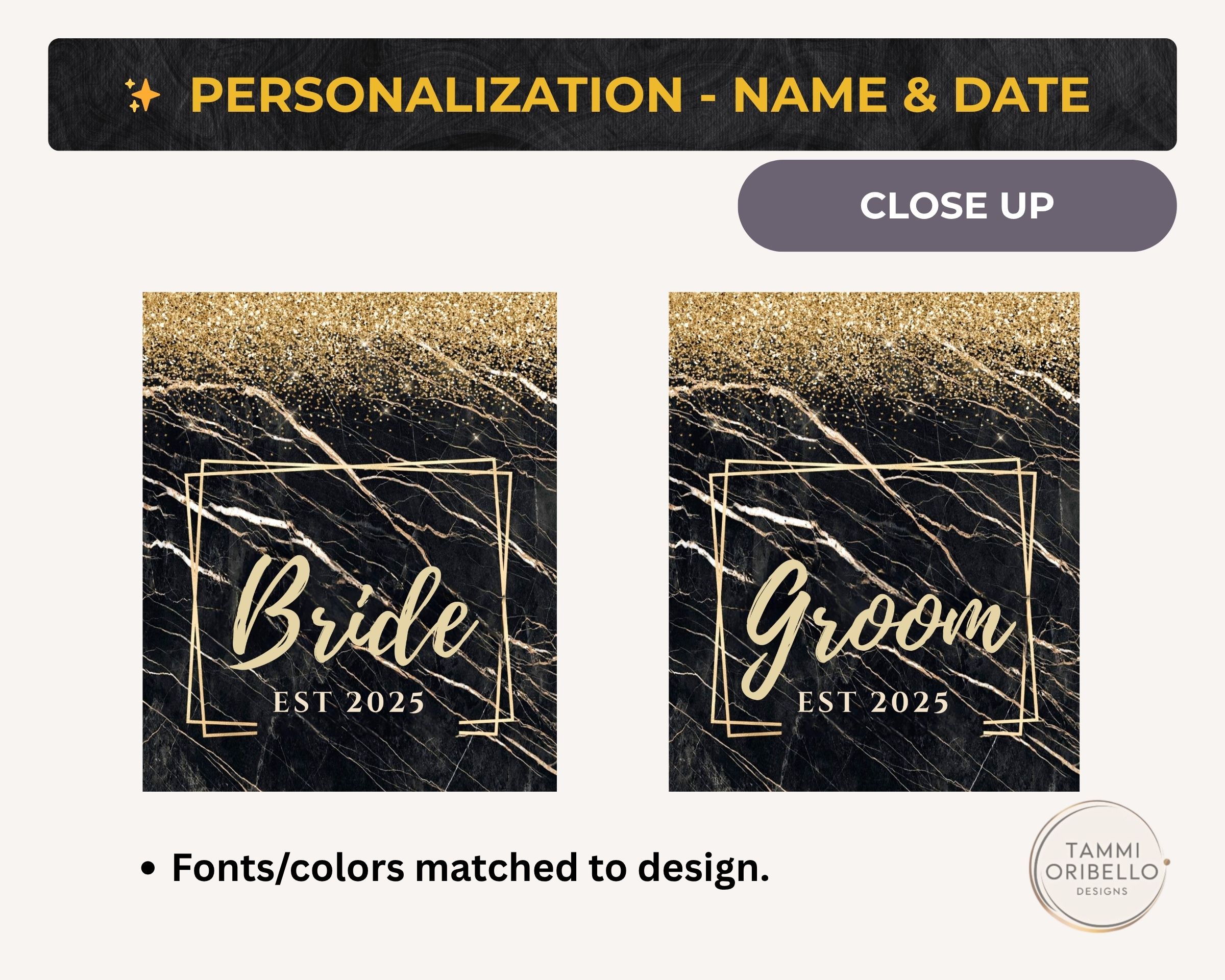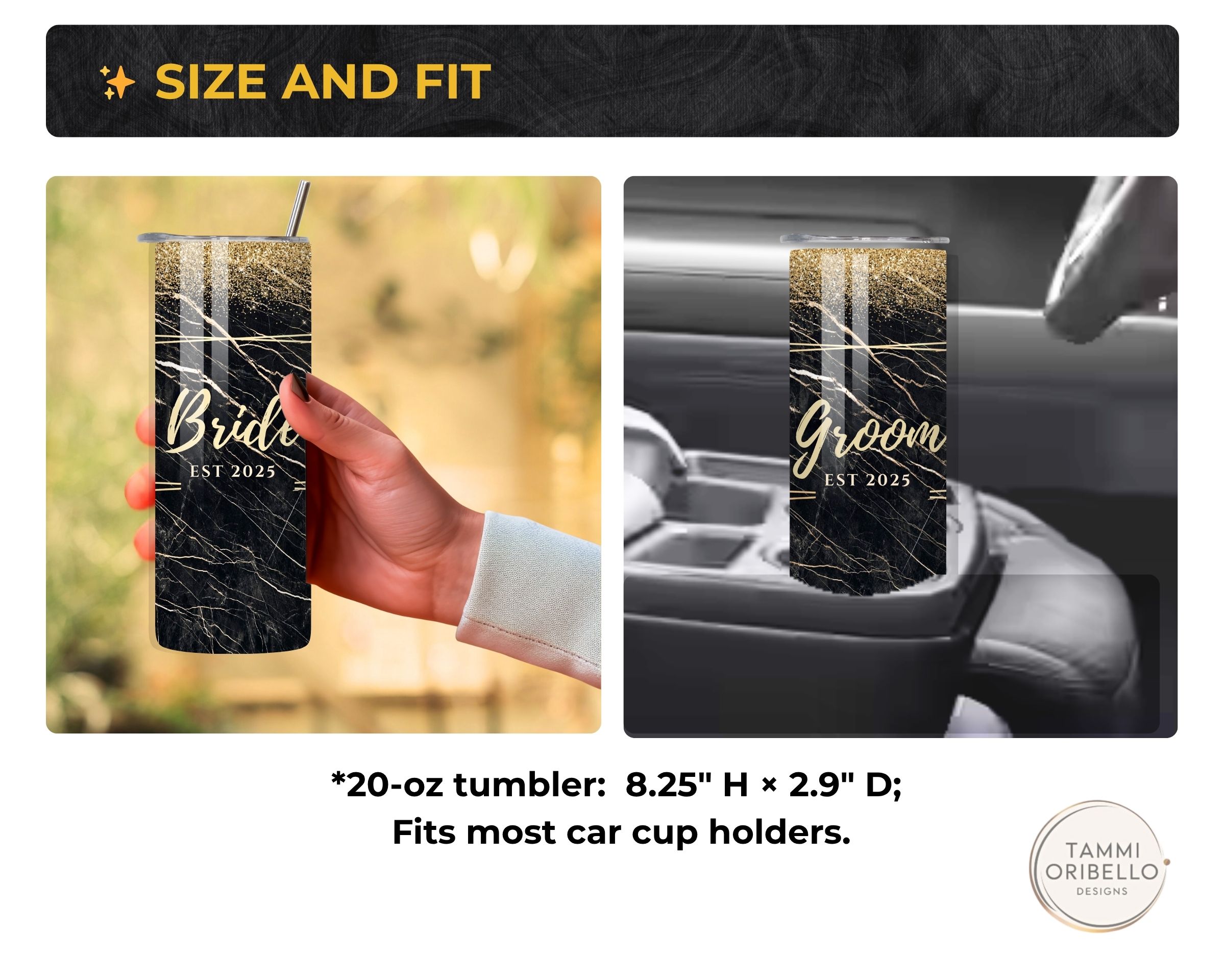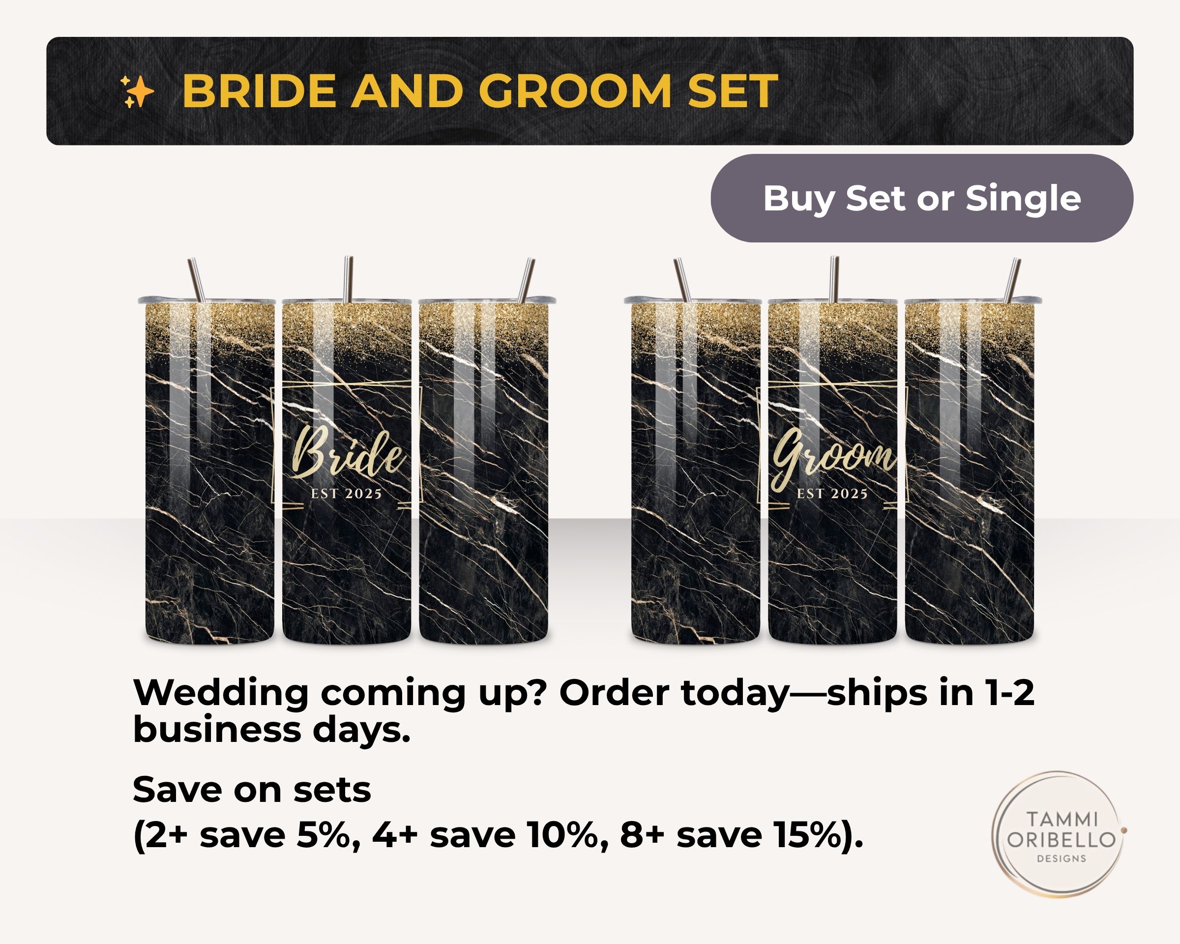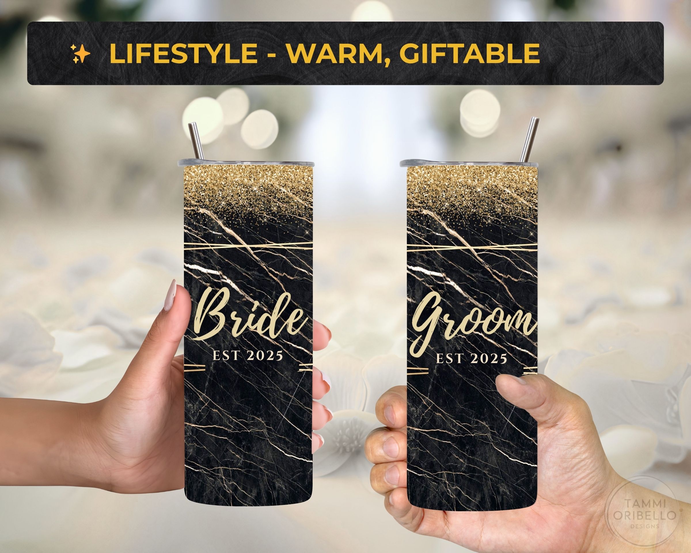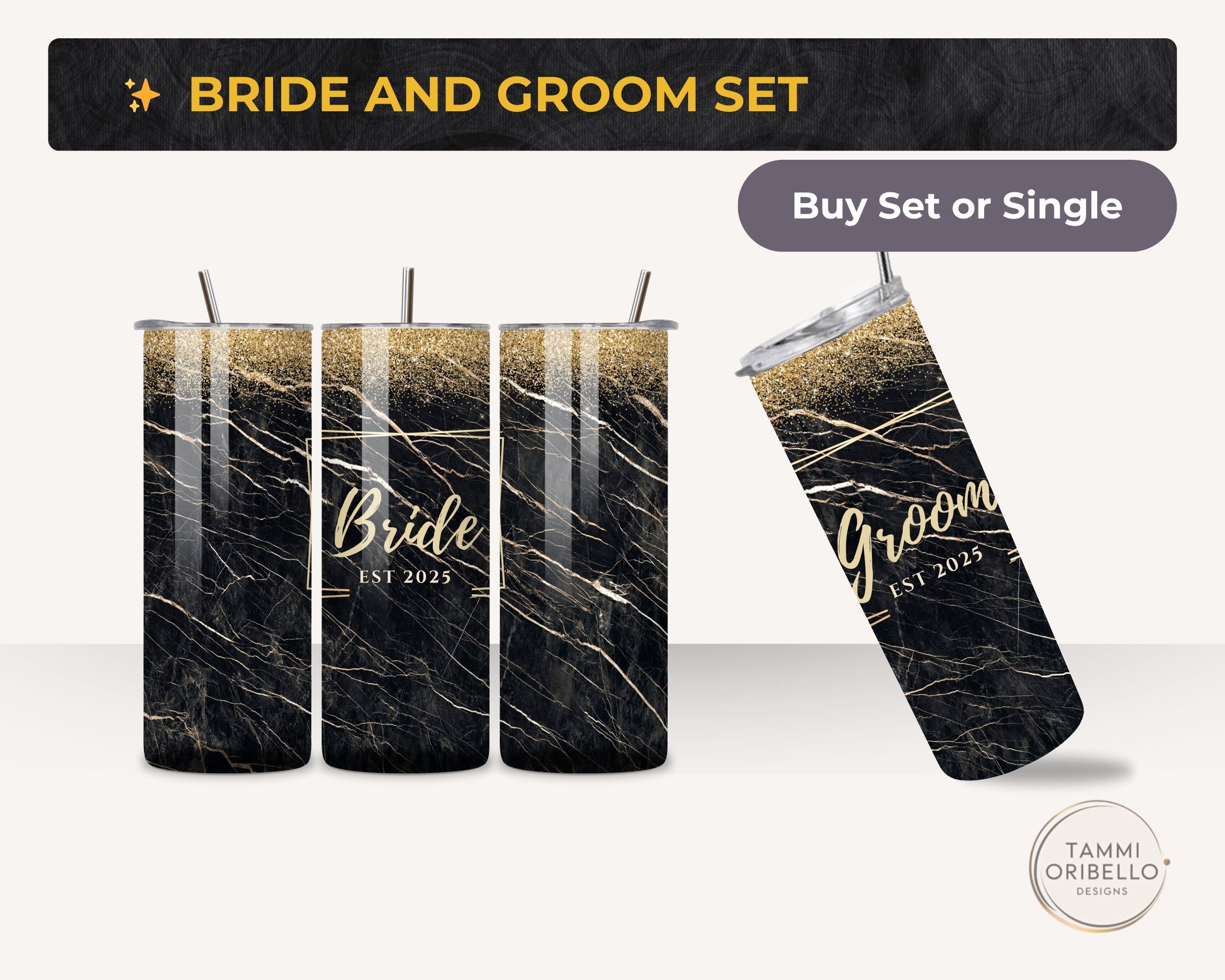 Bride and Groom Black Marble Tumbler with Gold Glitter Look Design Set or Single – 20 oz Stainless Steel – Optional Name and Date