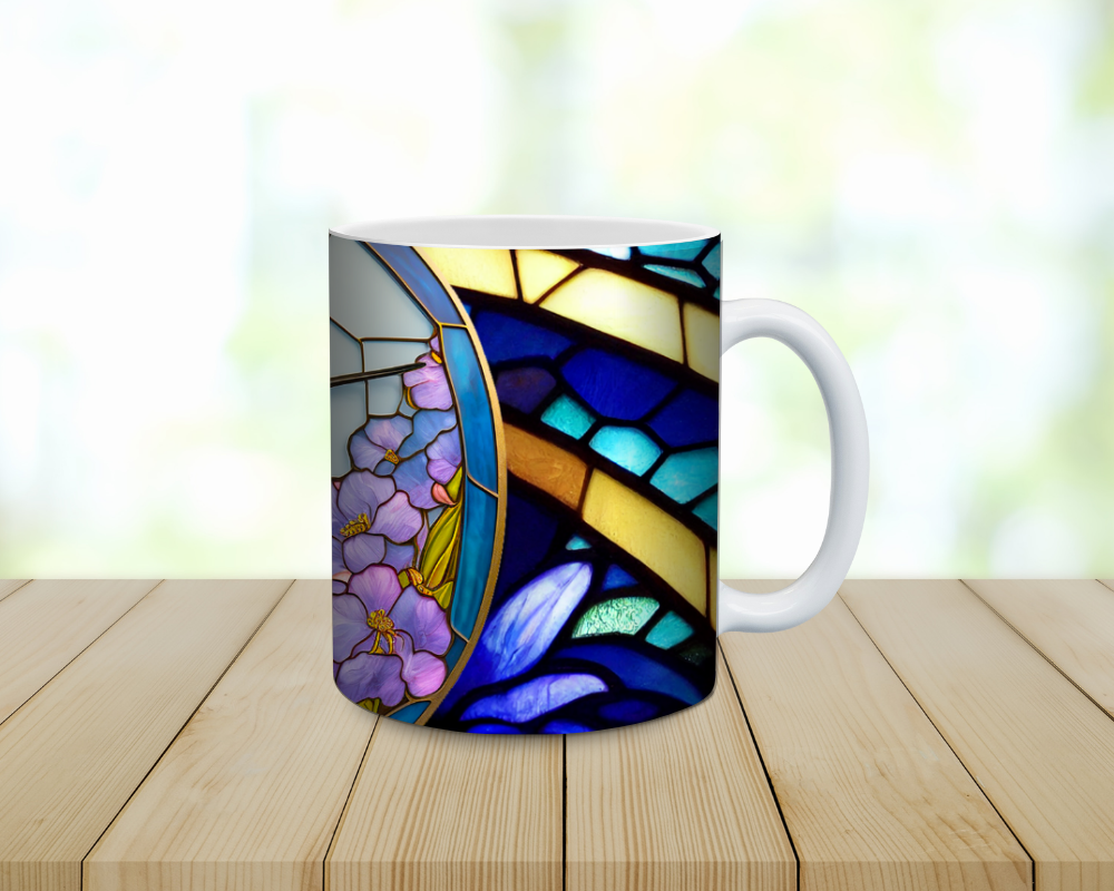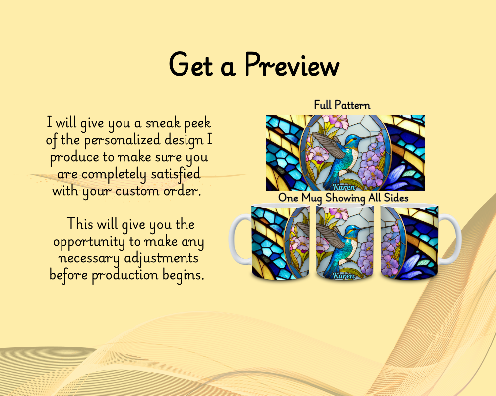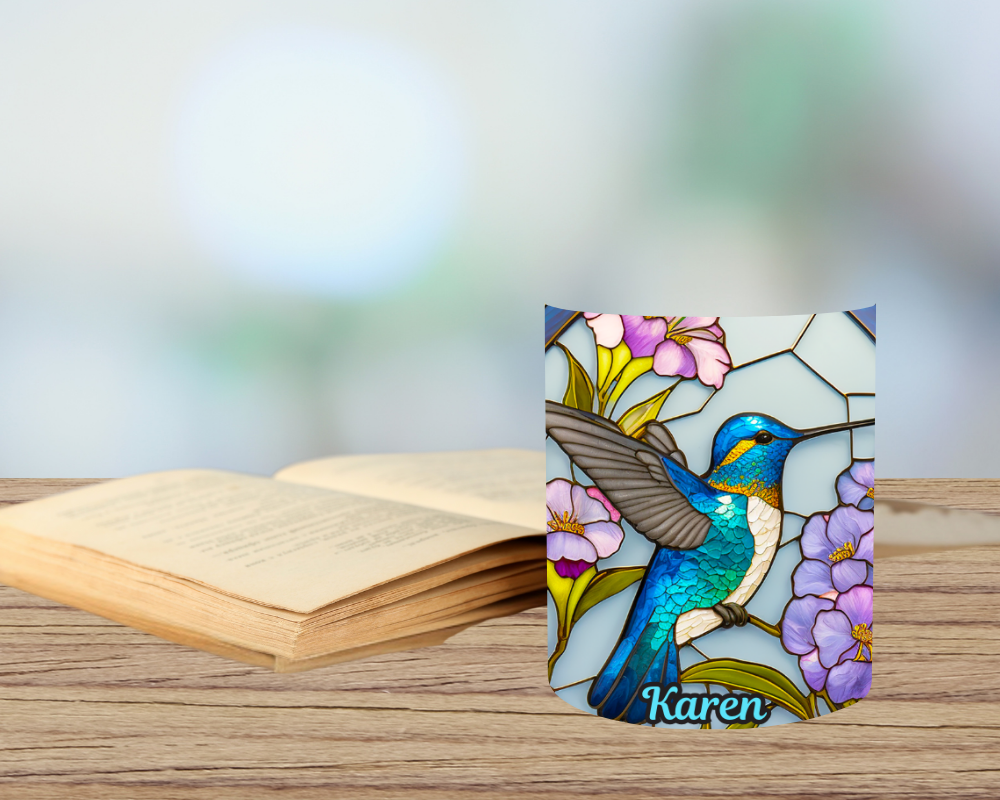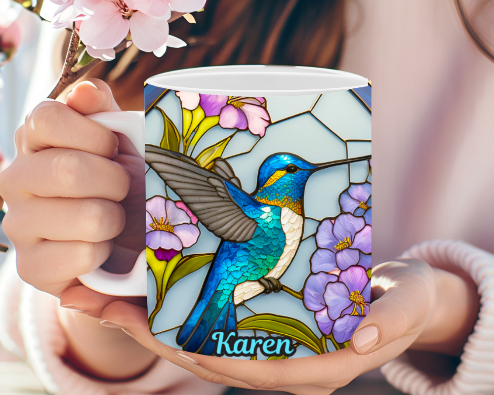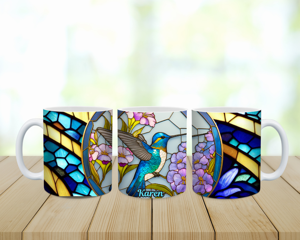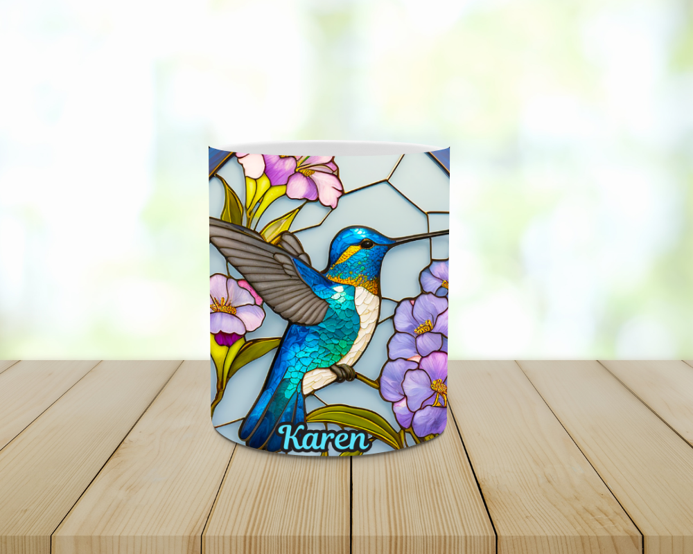 Bring garden joy to your coffee. This faux stained glass style hummingbird glows with purple flowers and a blue bird in the center. Add your name or a sweet phrase.