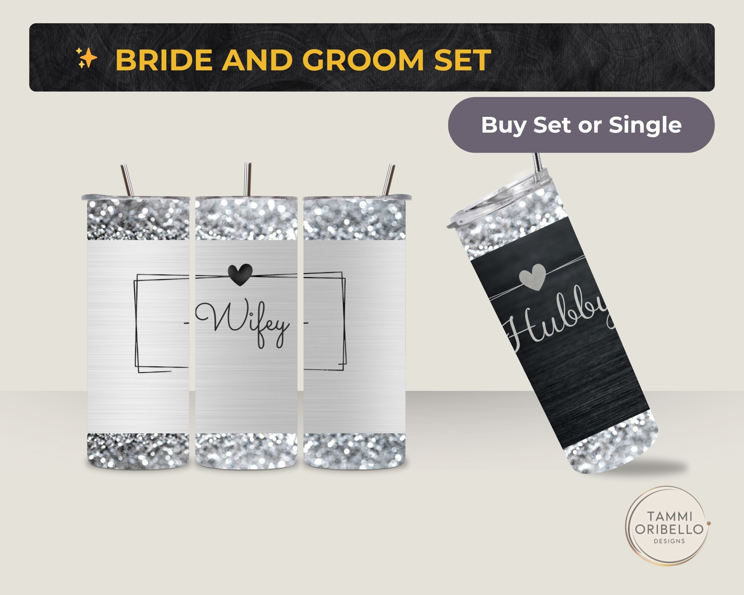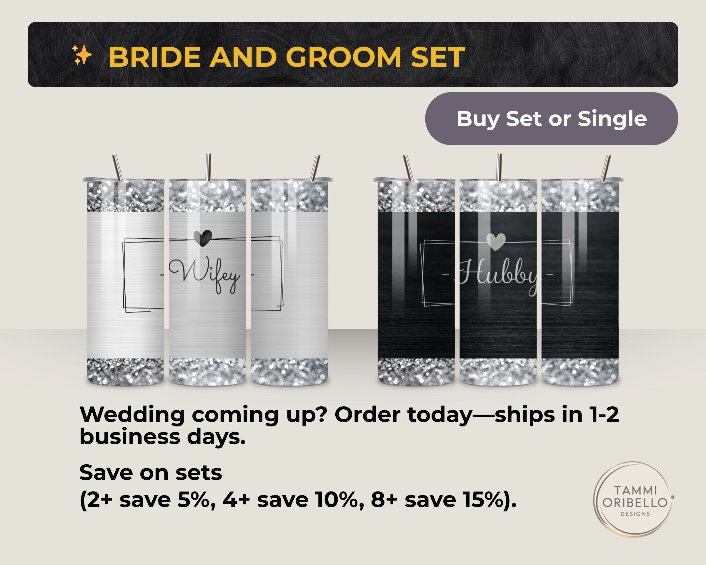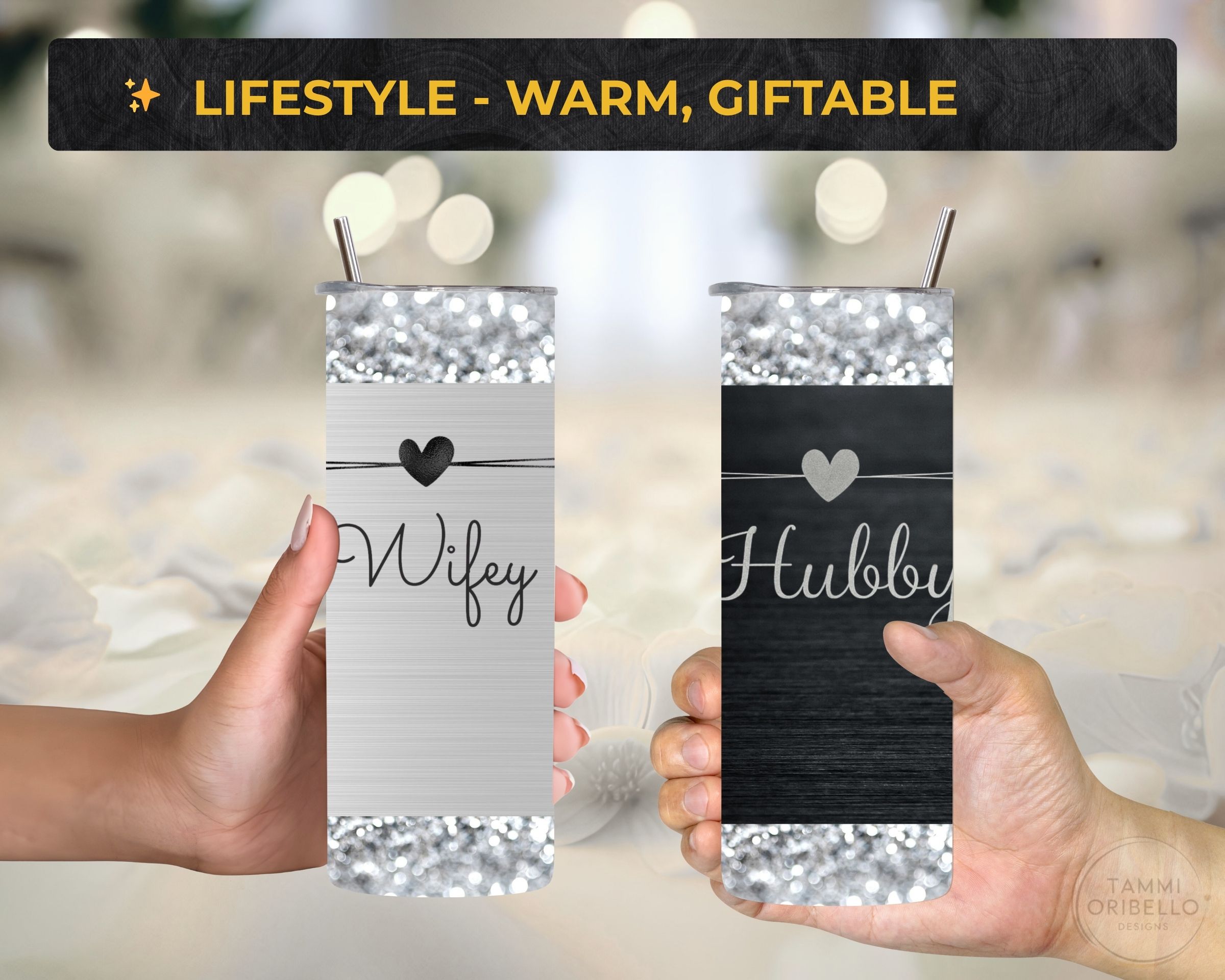 Brushed silver Wifey and brushed black Hubby tumblers with silver faux glitter look trim. Set or single. 20 oz stainless steel, optional names, gift ready, ships in 1-2 business days.