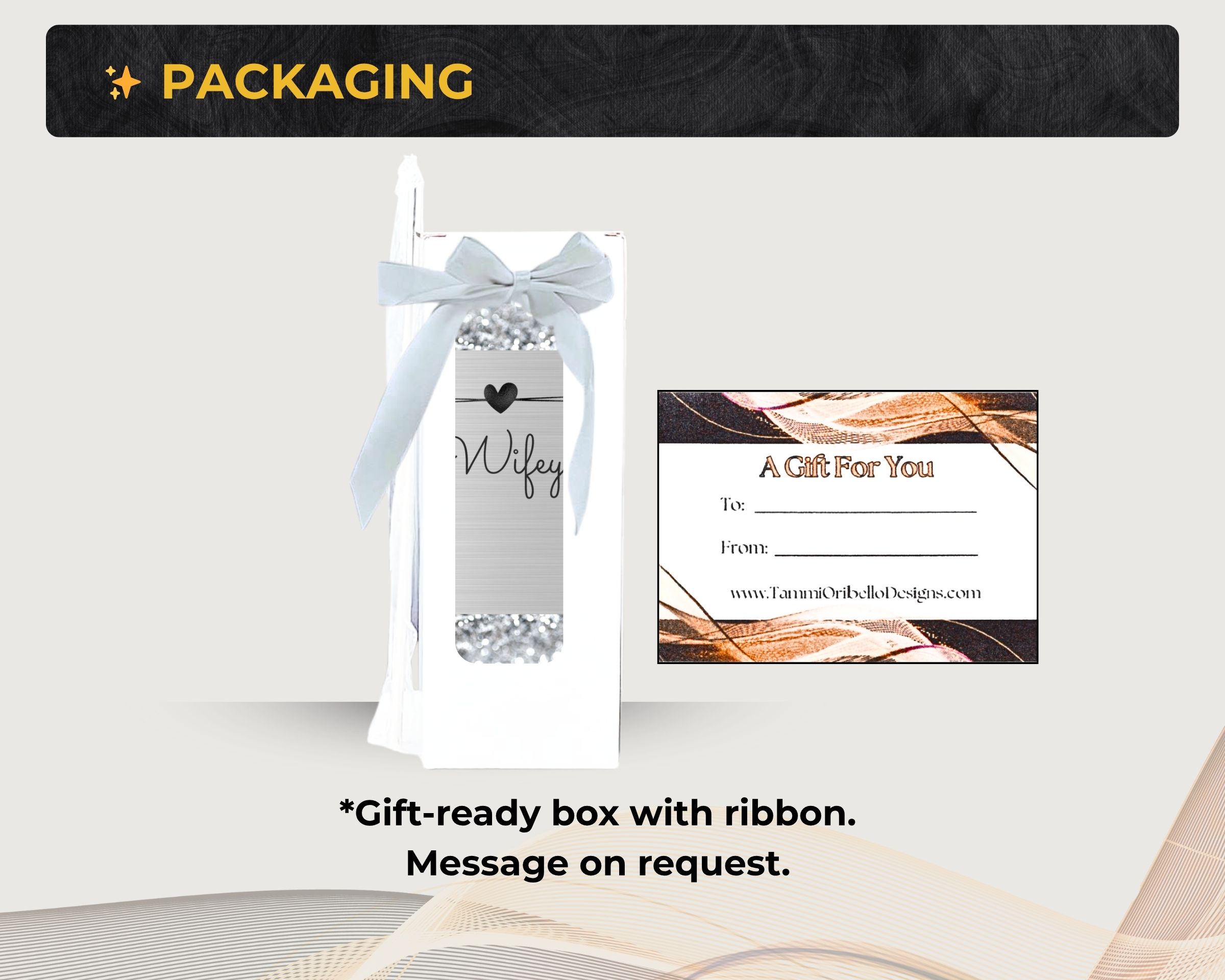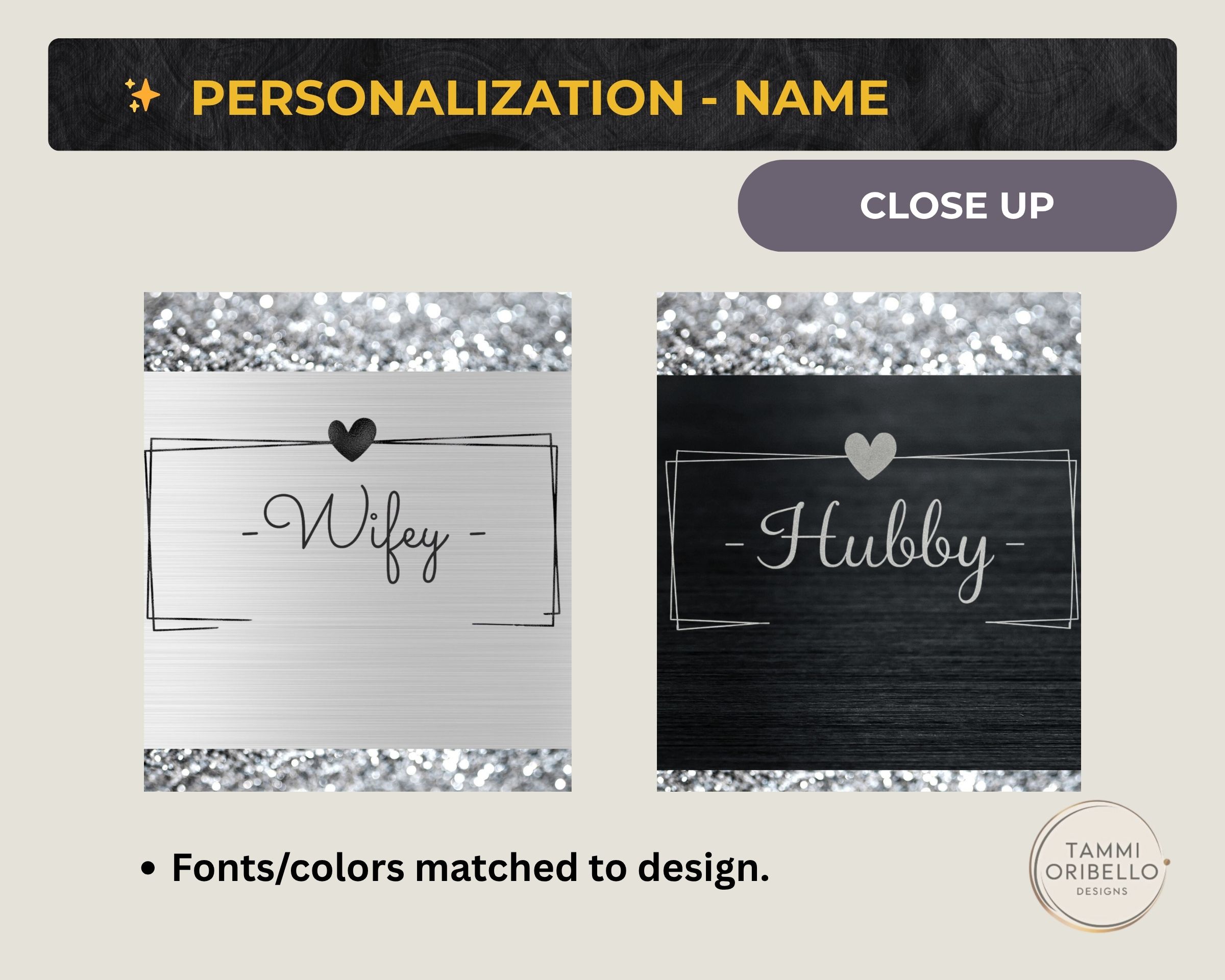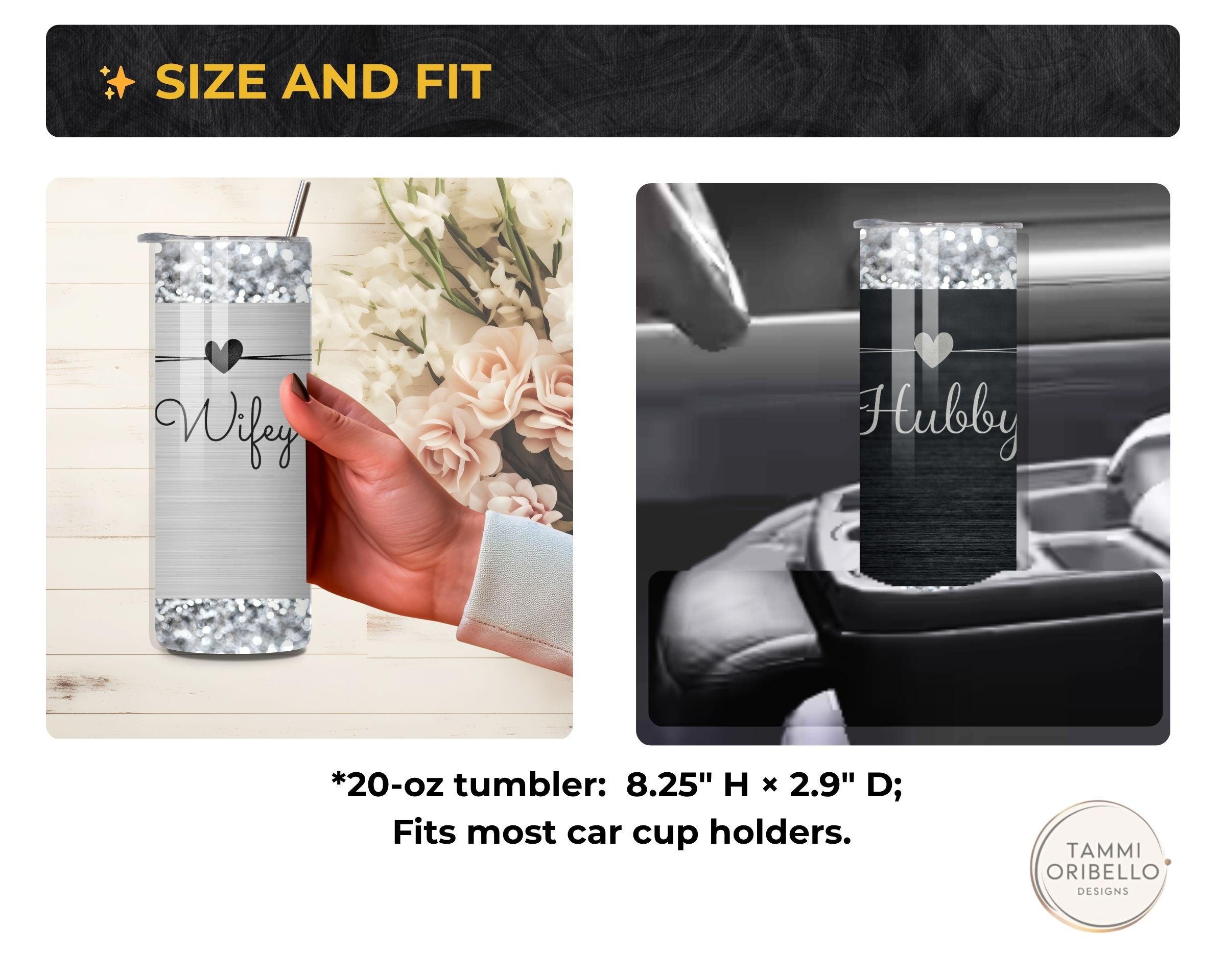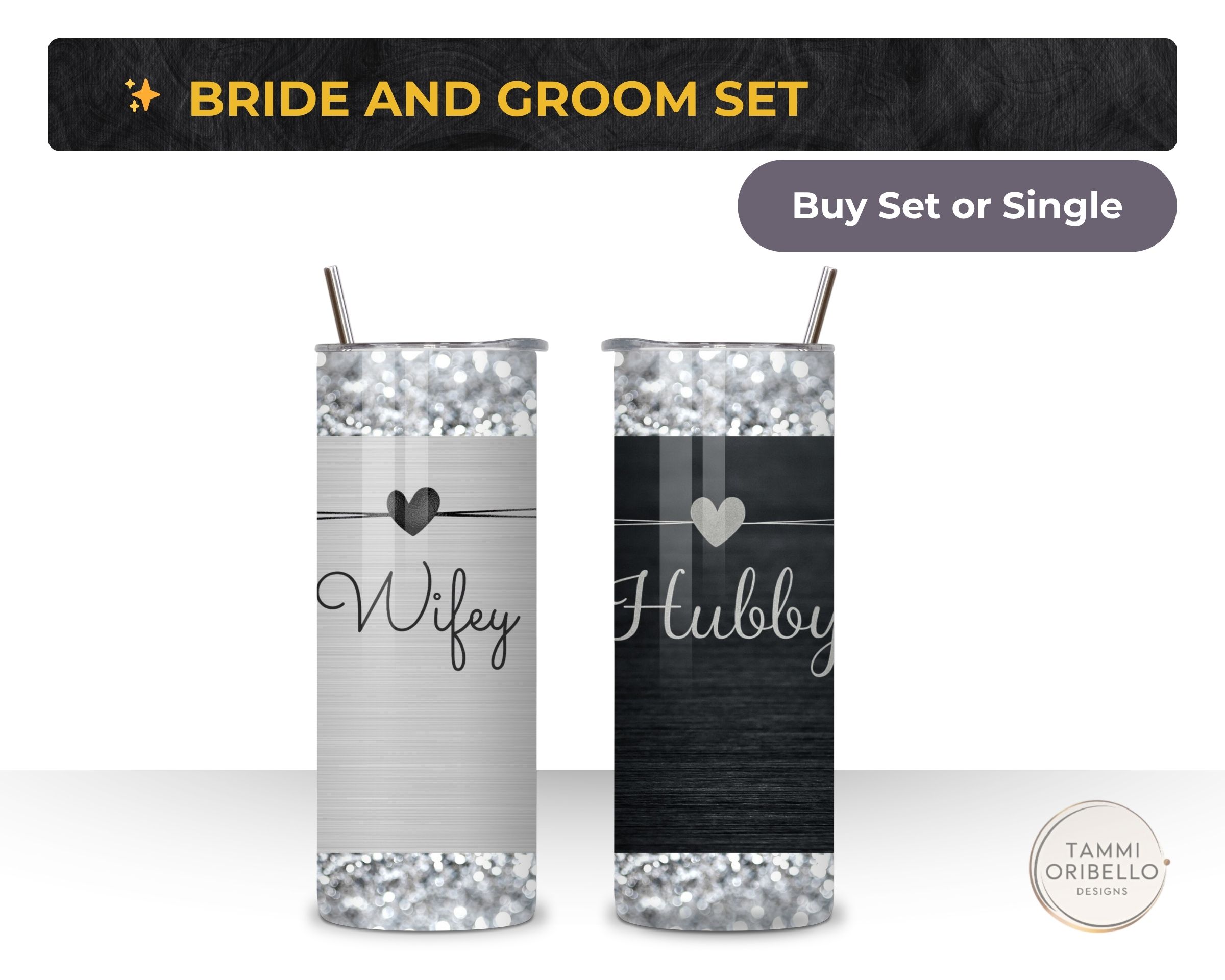 Brushed silver Wifey and brushed black Hubby tumblers with silver faux glitter look trim. Set or single. 20 oz stainless steel, optional names, gift ready, ships in 1-2 business days.