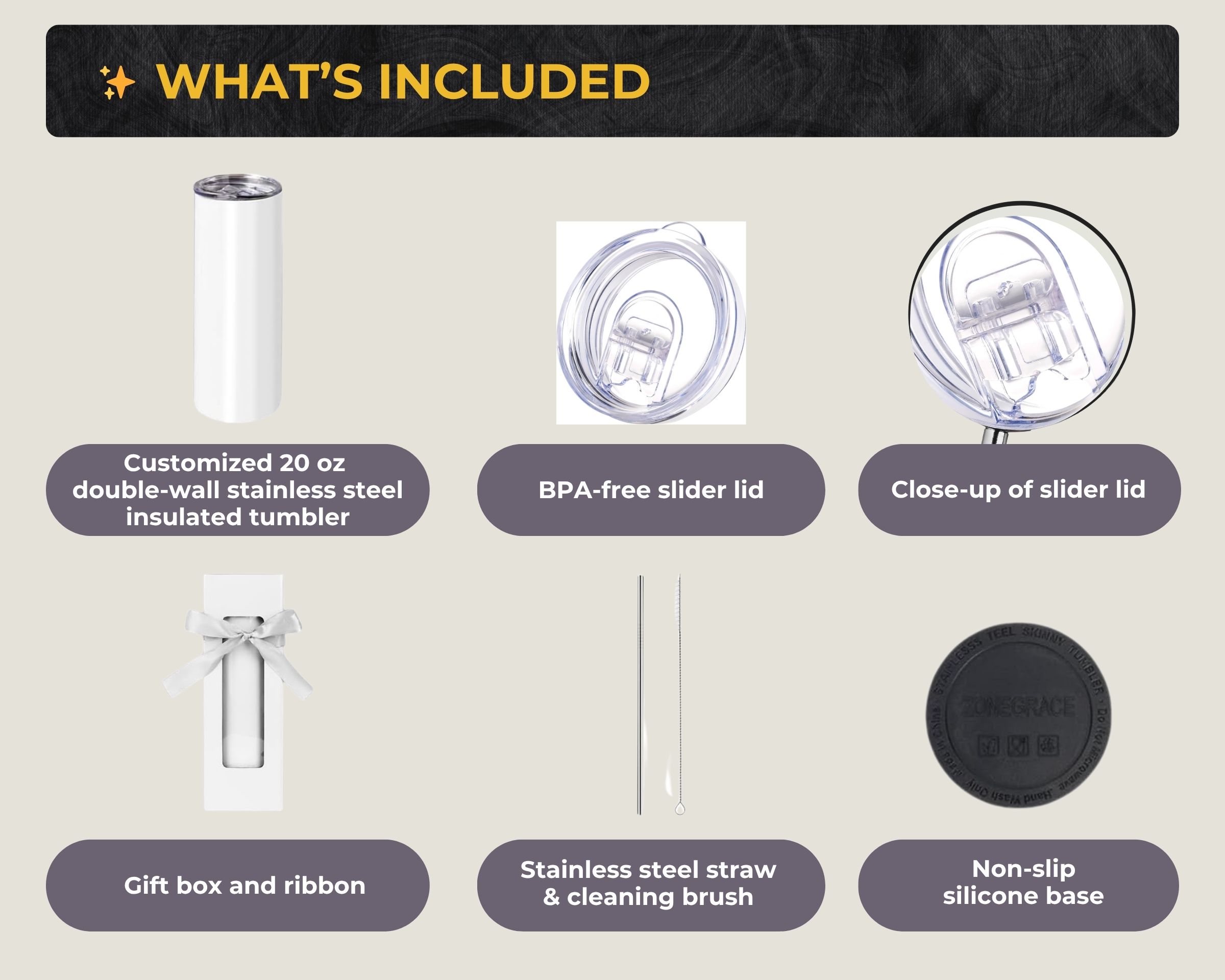 Each tumbler includes: 20 oz stainless insulated cup, BPA-free sliding splash-resistant lid, stainless steel straw, cleaning brush, non-slip silicone base, gift box, care card. Sets include two complete tumblers.
