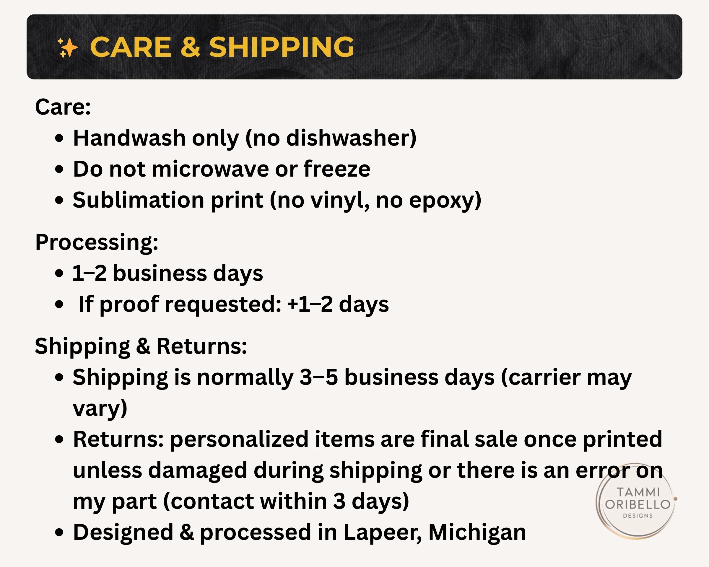Personalized items cannot be returned. If anything arrives damaged in transit or there is an error on my end, contact me within 3 days with photos for a replacement or refund. Please double-check spellings before placing your order.