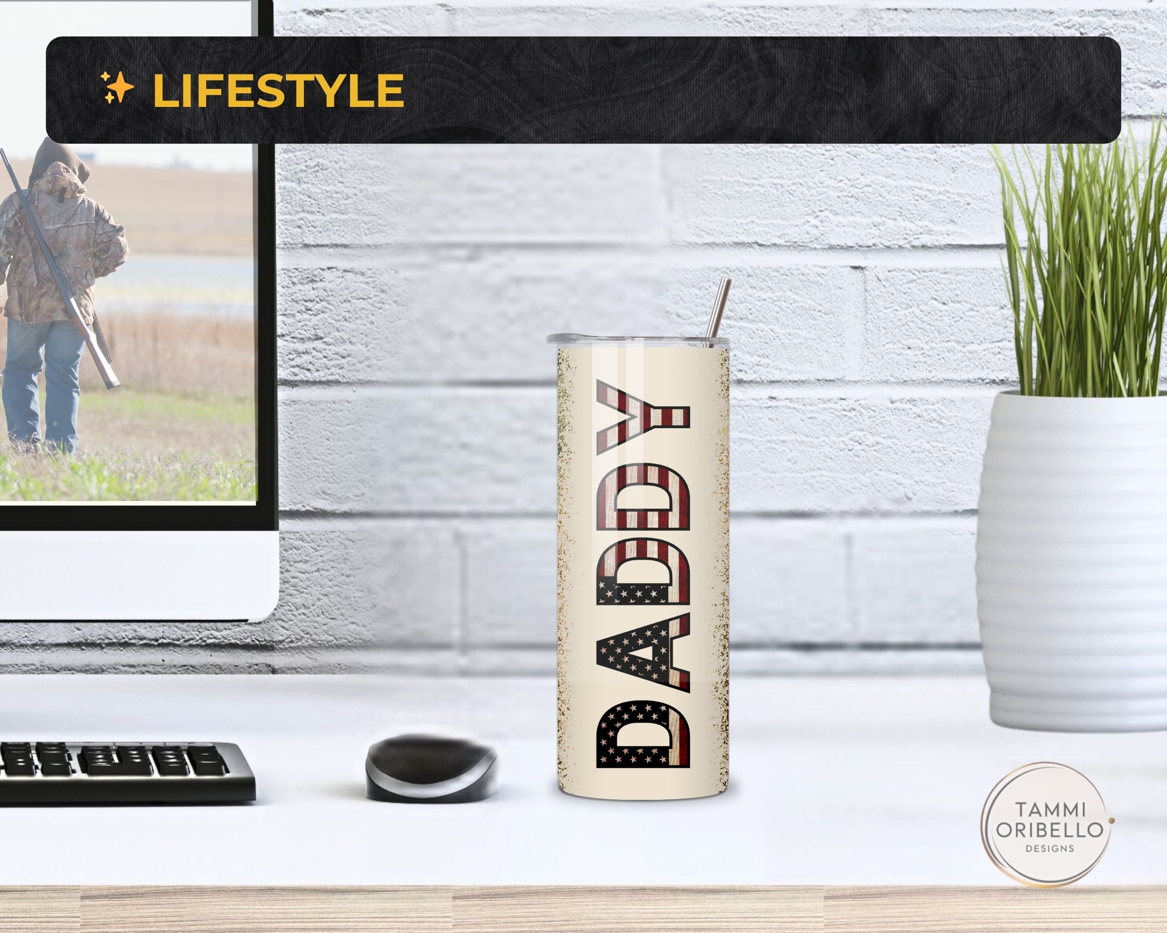 Personalized 20oz stainless steel tumbler with patriotic deer art. Choose Daddy, Dad, Papa, Grandpa—or a custom name. Buy single or set and save.
