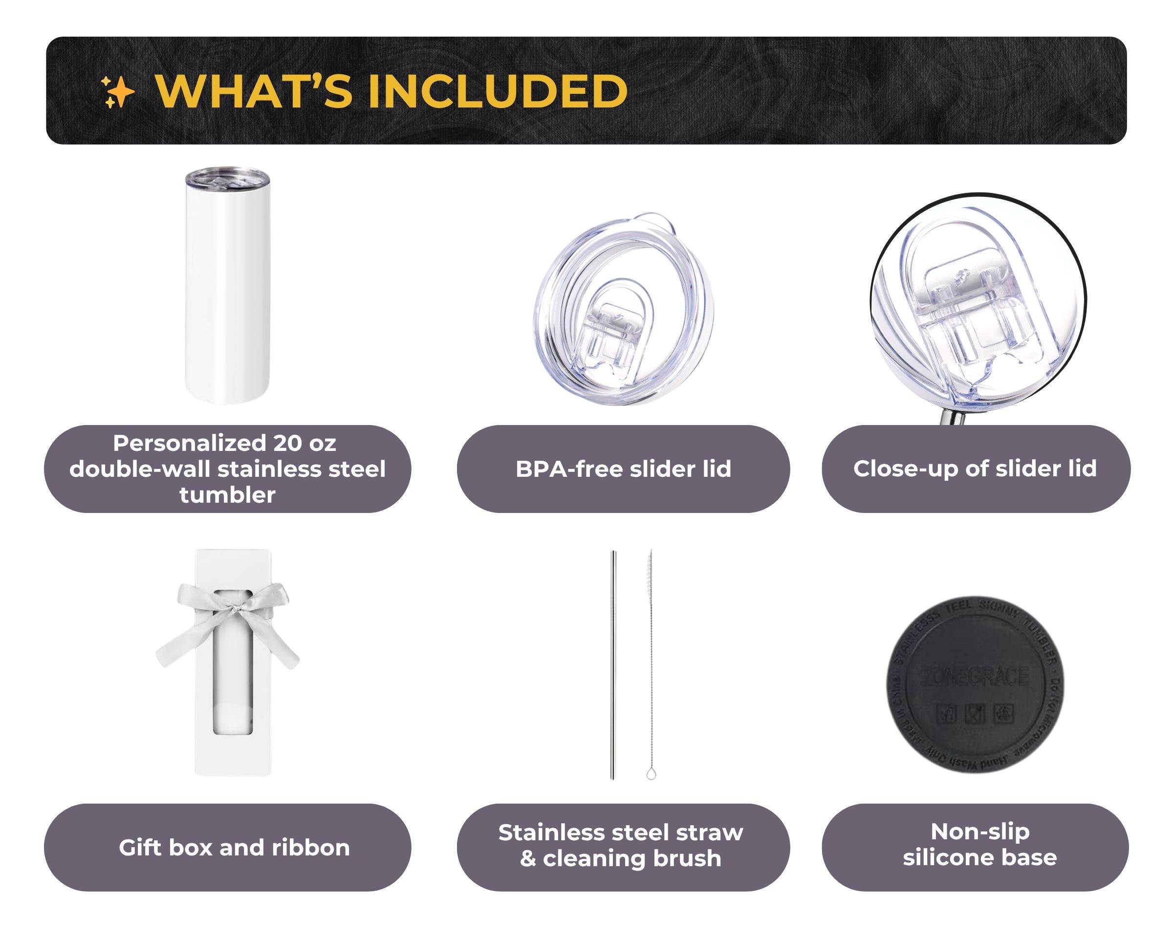 What’s included: 20-oz insulated tumbler, BPA-free slide lid, stainless steel straw, straw cleaning brush, non-slip silicone base, gift box, and care card.