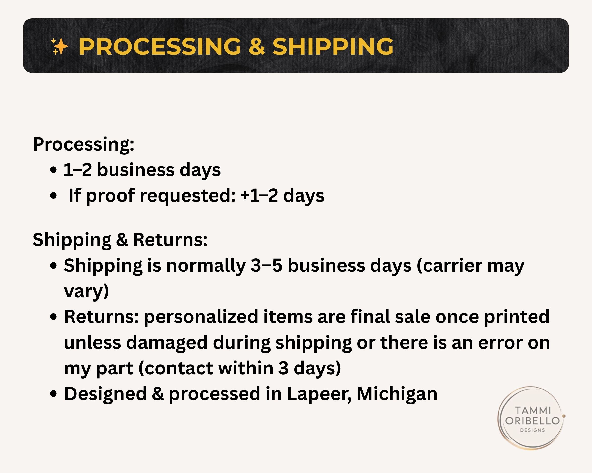 Personalized items can’t be returned. If your order arrives damaged or there’s an error on my end, contact me within 3 days with photos—I'll replace or refund.