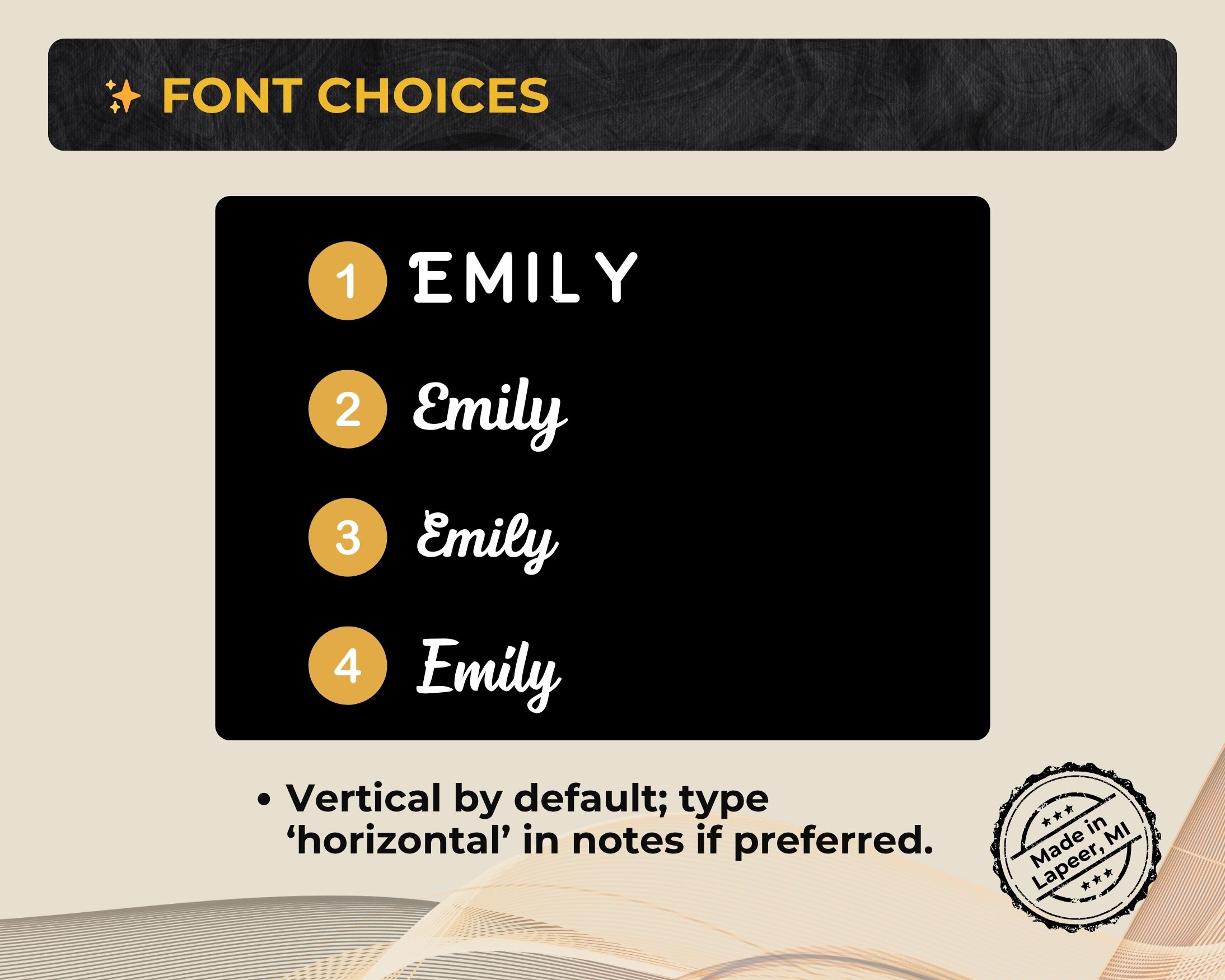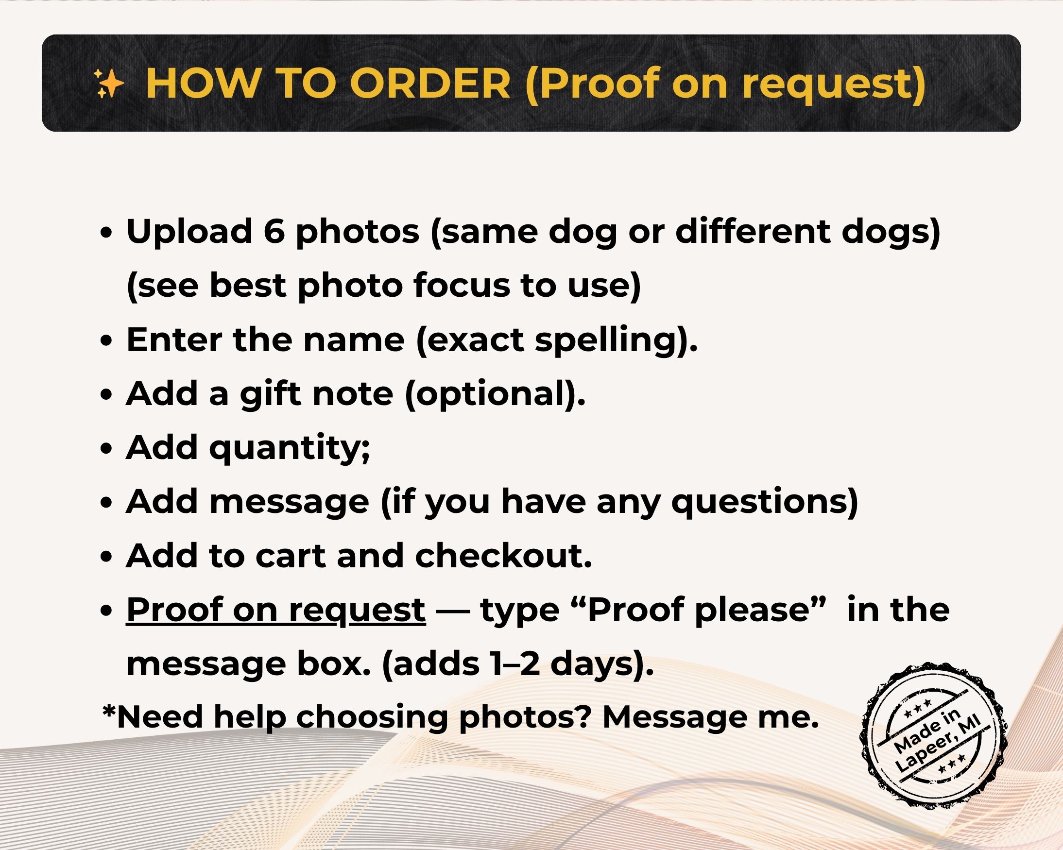 Questions about photos or the name style? Message me and I’ll help you choose the best options.