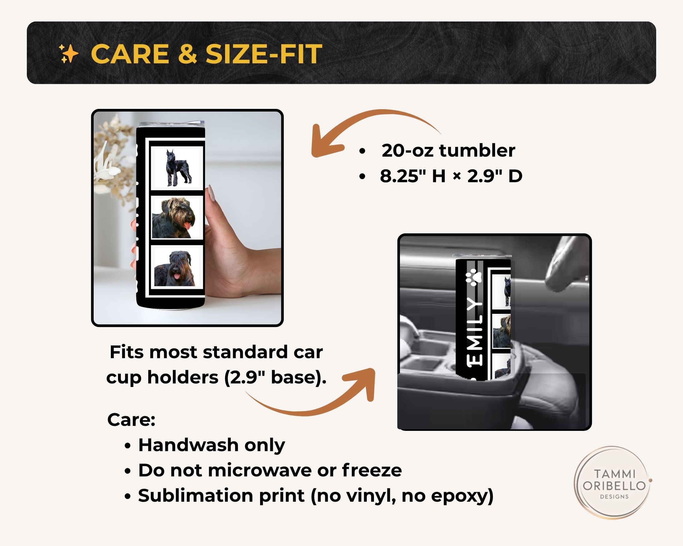 Celebrate your favorite pup every day with a tumbler that’s all yours. Upload six photos and a name, and I’ll crop for the best fit and sublimate the design for a smooth, durable finish. Thoughtful gift-ready packaging makes it easy to surprise a dog mom or treat yourself.