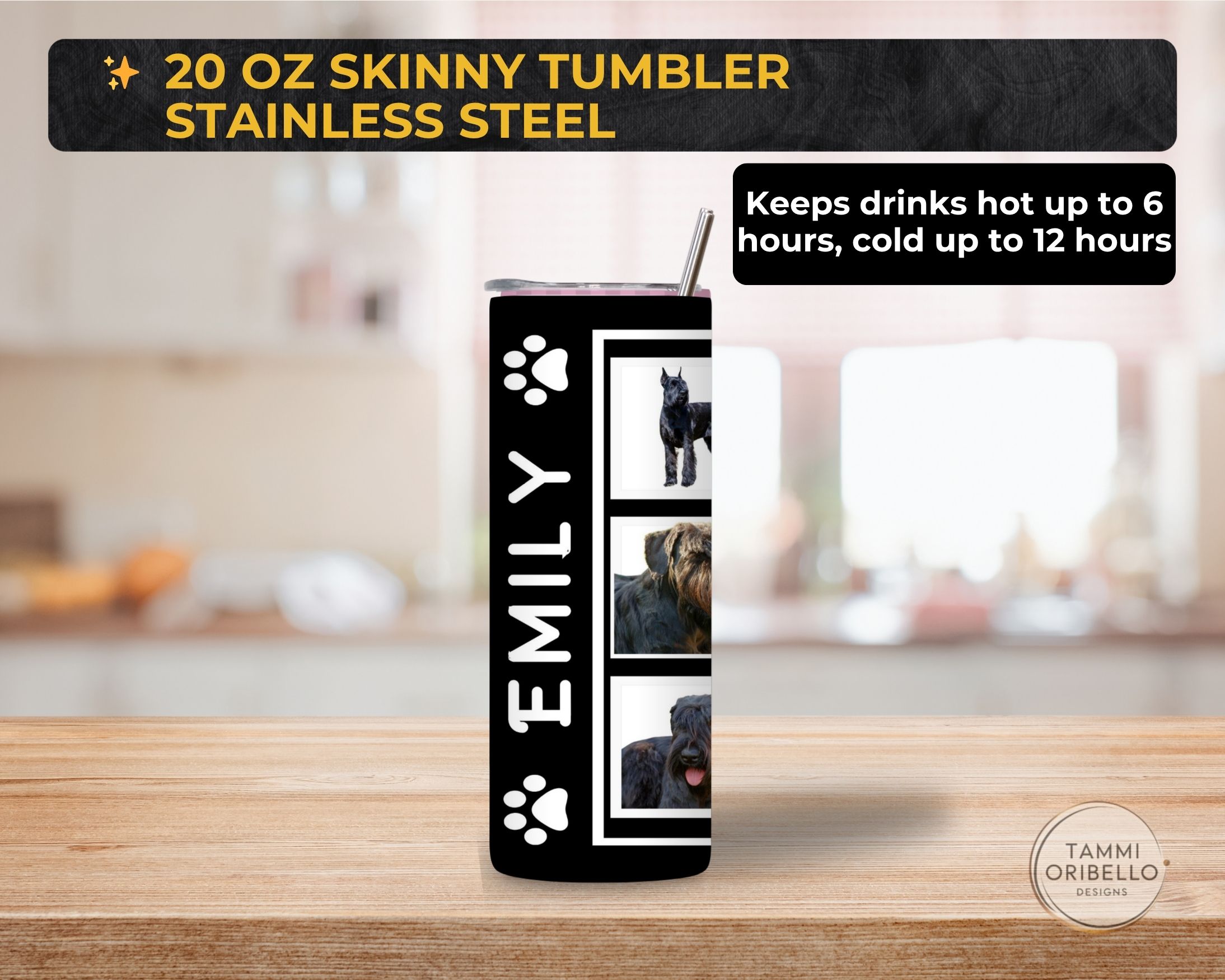 Create a custom 20 oz dog photo tumbler with six photos and a name in a bold black and white LOVE design, handcrafted by Tammi Oribello Designs in Lapeer, MI.
