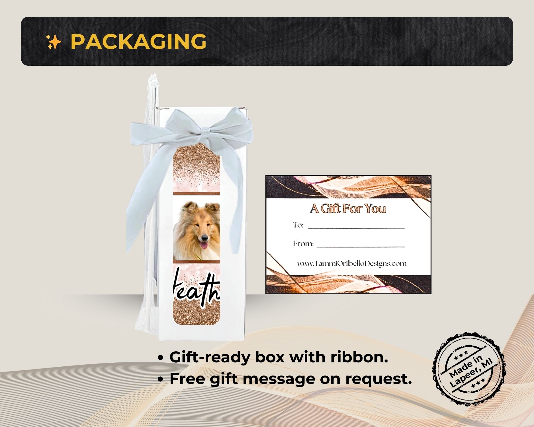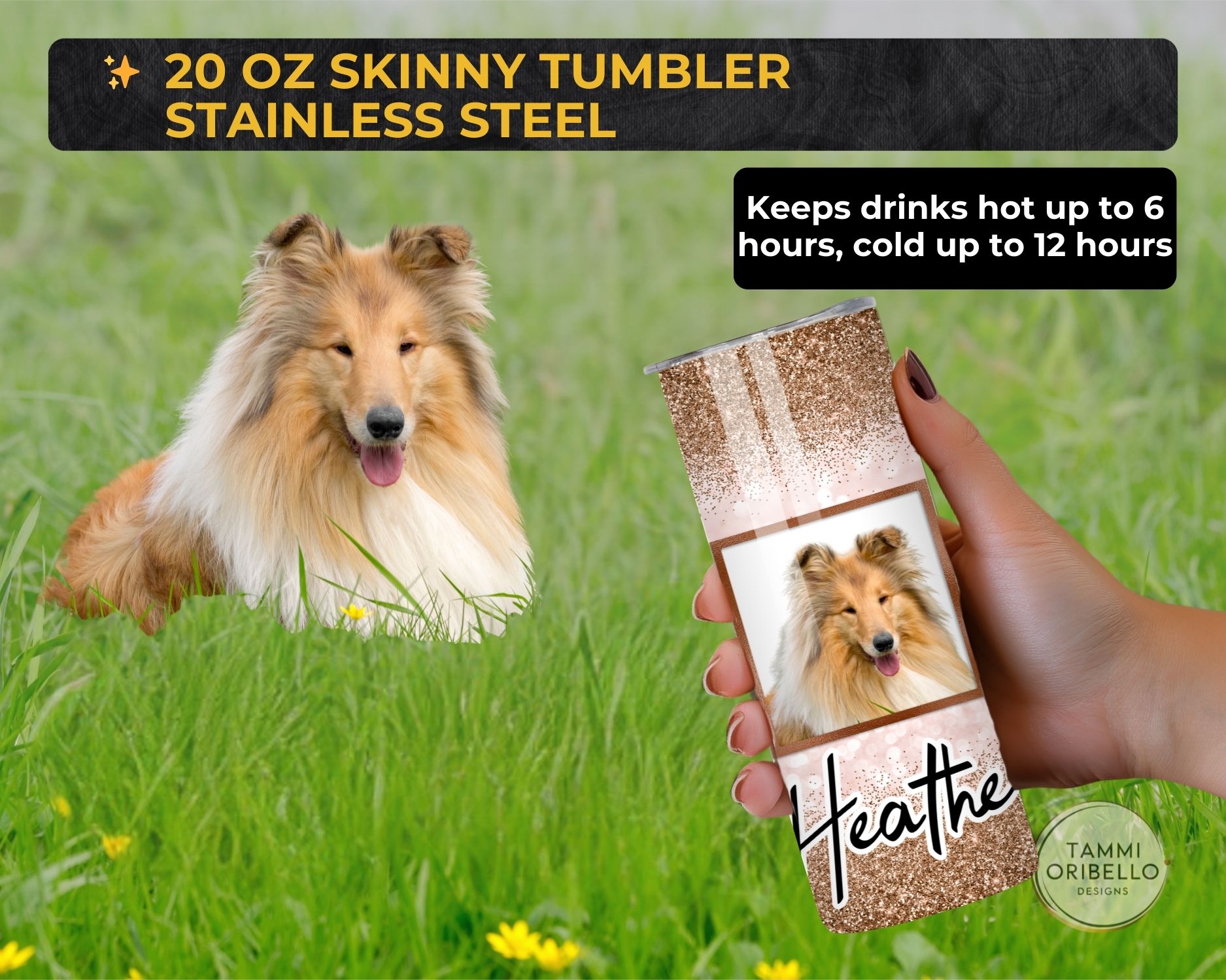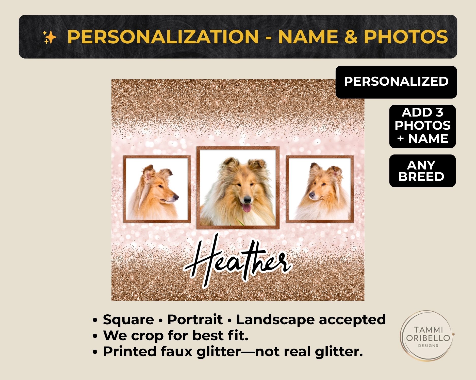 Your dog brings joy to your days, and this tumbler lets you carry that joy with you. It’s designed to celebrate the pet you love with your favorite photos, your pet’s name or your name, and a soft rose-gold glitter look that feels warm and personal.