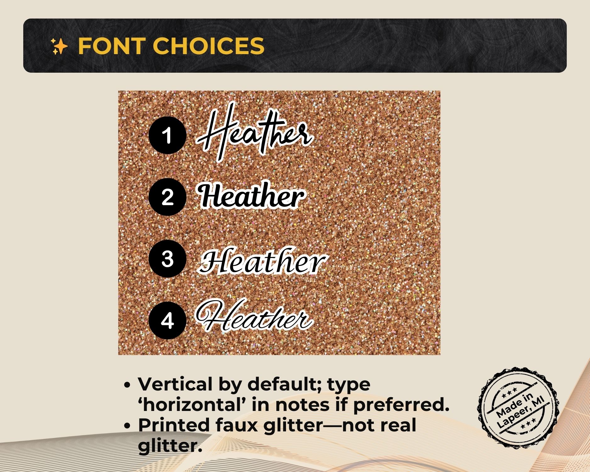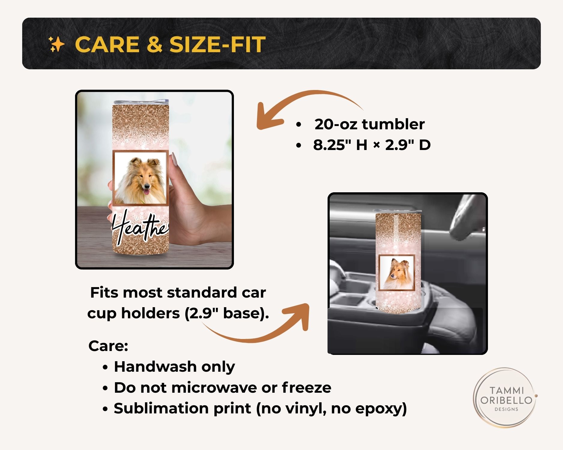 This personalized tumbler is created in my Lapeer, Michigan studio at Tammi Oribello Designs, using your photos and a durable sublimation process so the images stay clear and smooth. Printed faux glitter—no real glitter or texture.