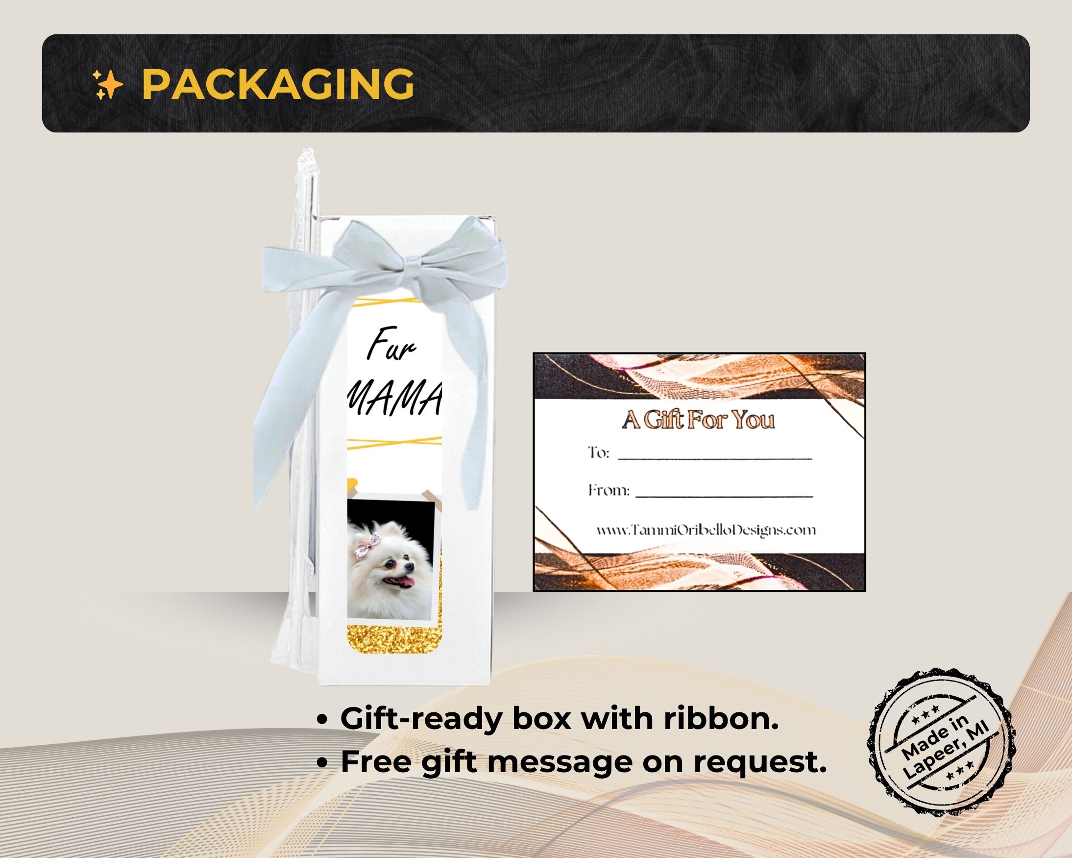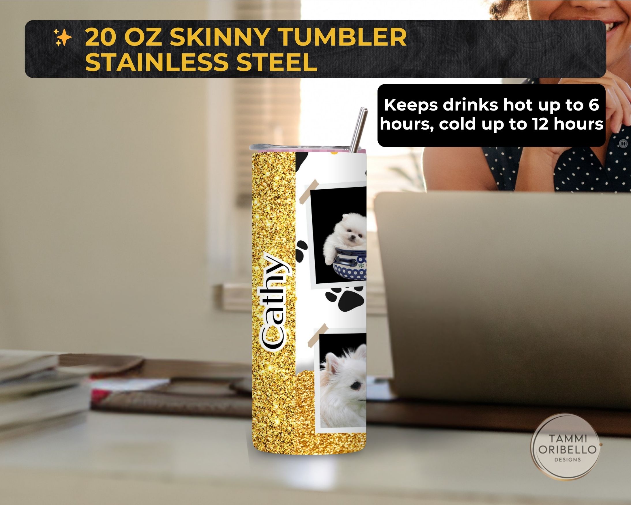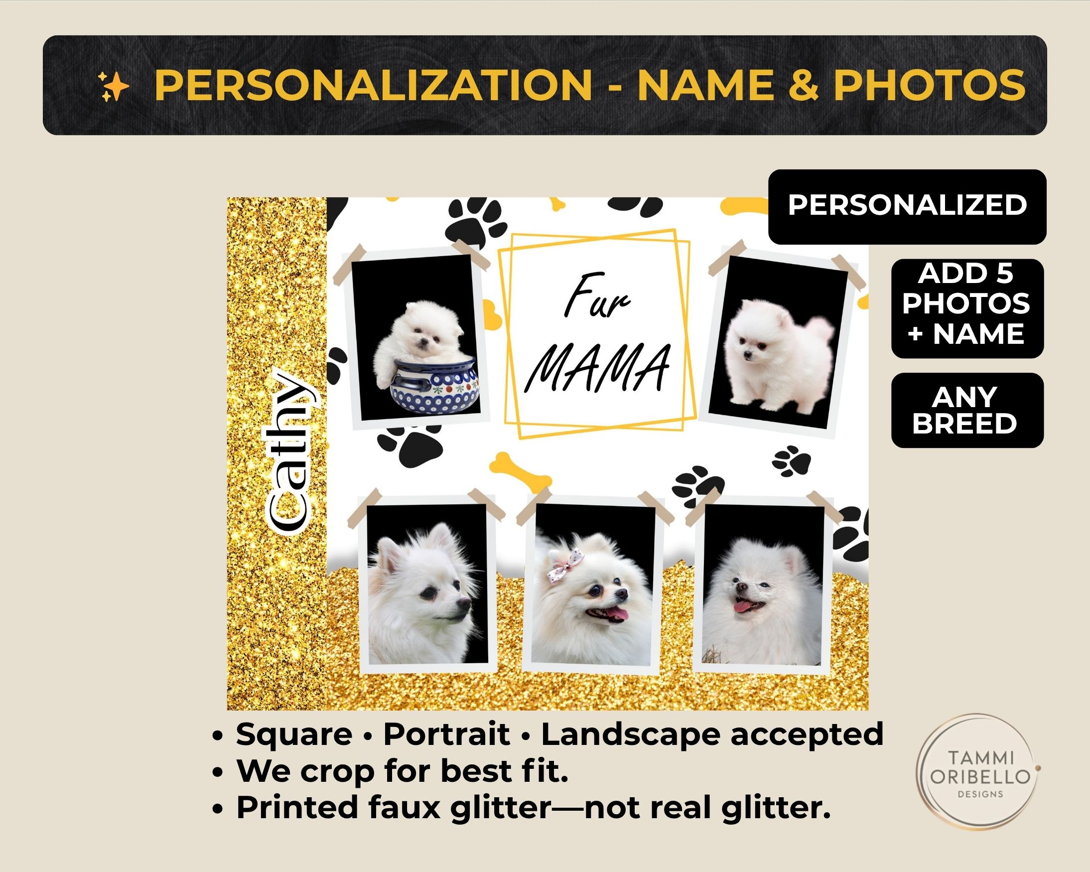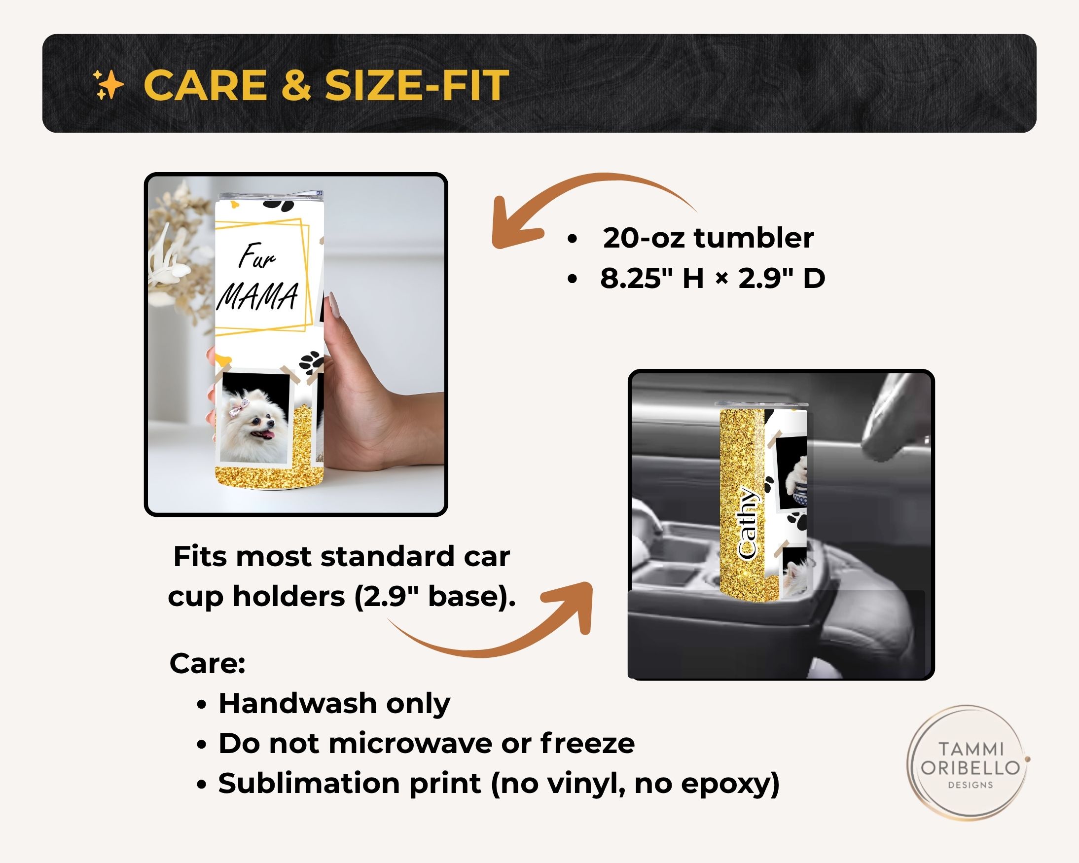 Celebrate your best buddy with a custom Fur Mama 20 oz stainless tumbler. Upload five favorite photos and a name (exact spelling). Printed faux glitter (not real glitter). Made and shipped from Lapeer, Michigan, by Tammi Oribello Designs.