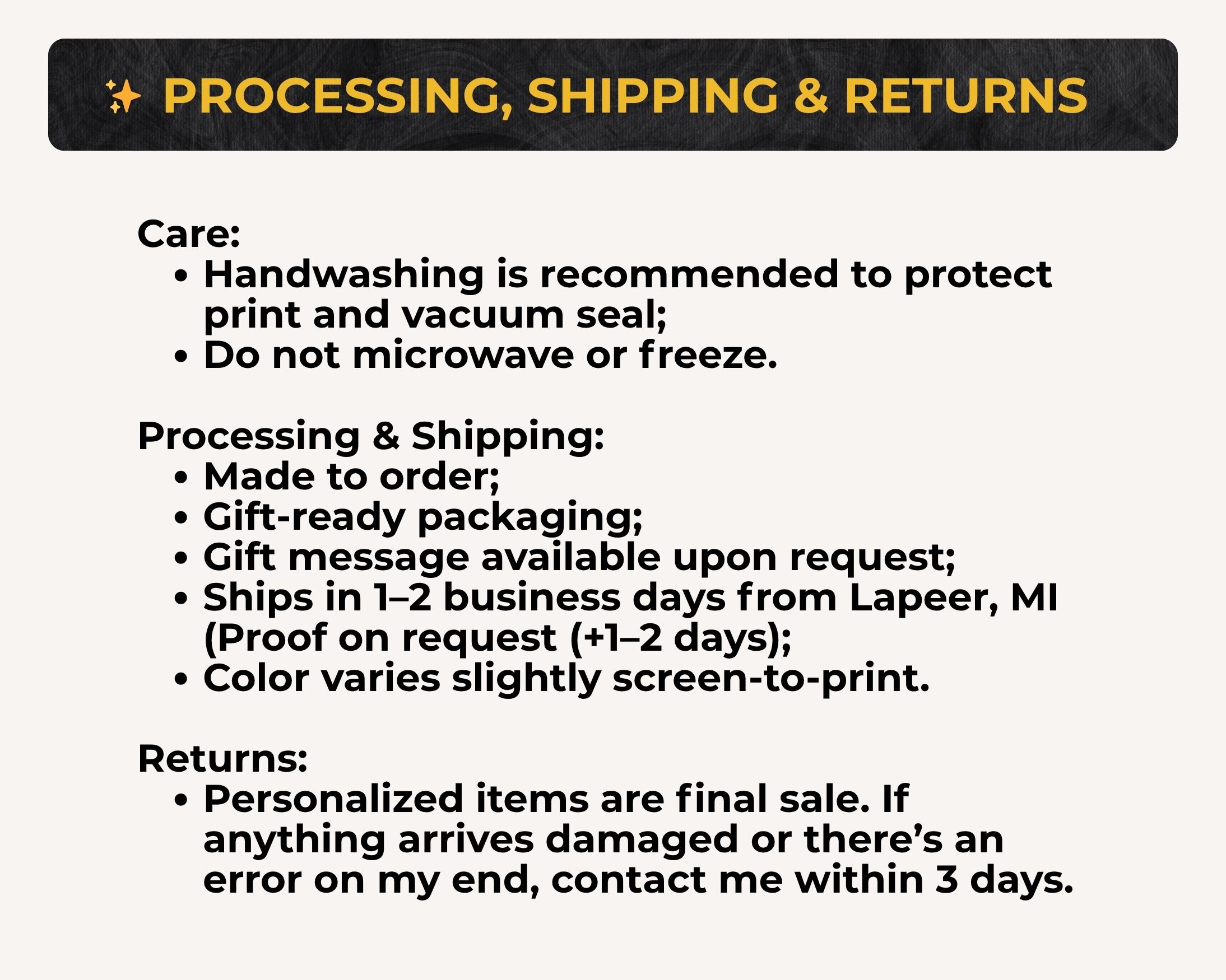 Personalized items are final sale. If your package arrives damaged, please message me within 5 days with clear photos of the item and packaging. I will handle next steps and help you quickly.