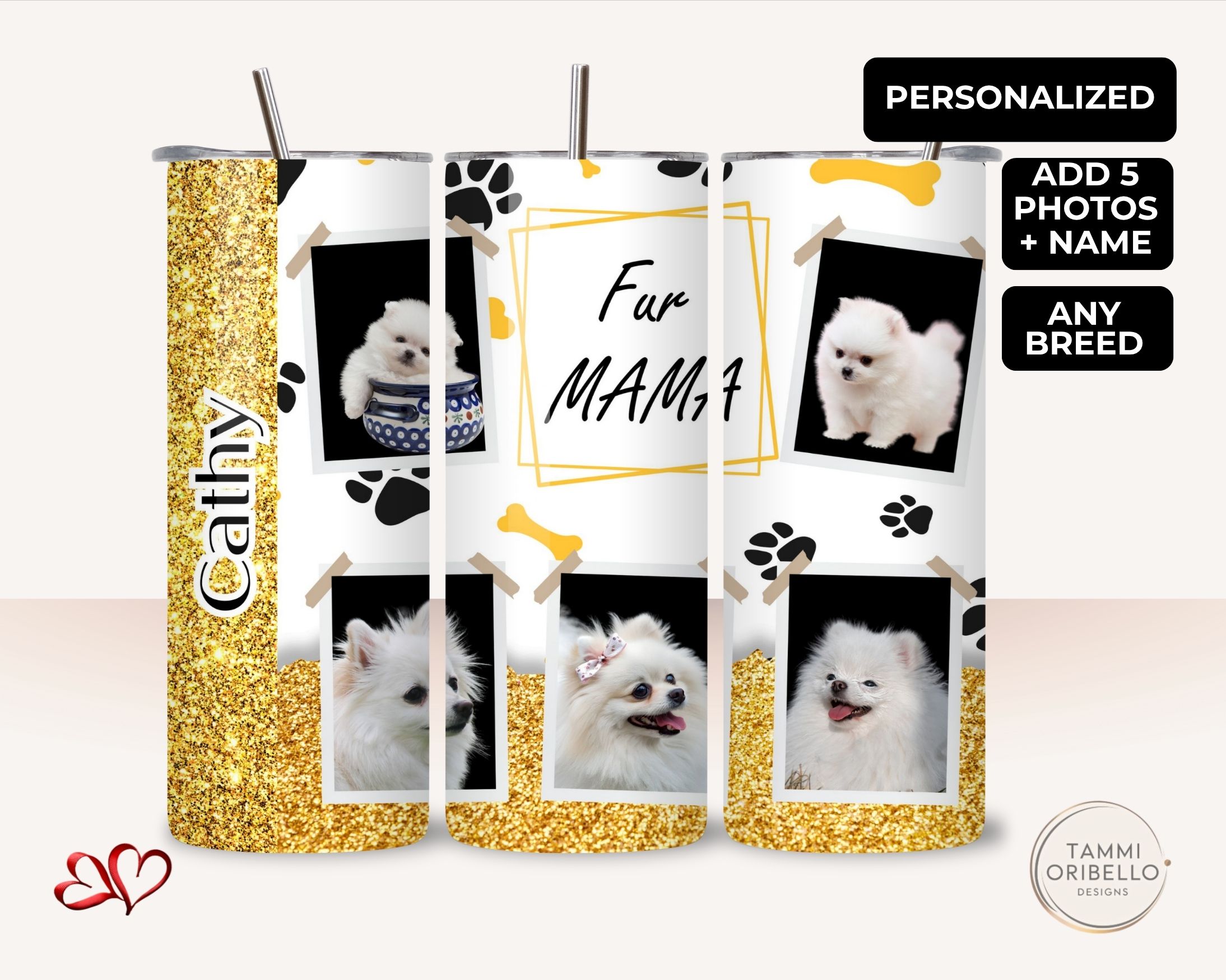 Create a personalized Fur Mama 20 oz tumbler with five dog photos and a name. Stainless steel, faux glitter print, gift-ready from Lapeer, MI