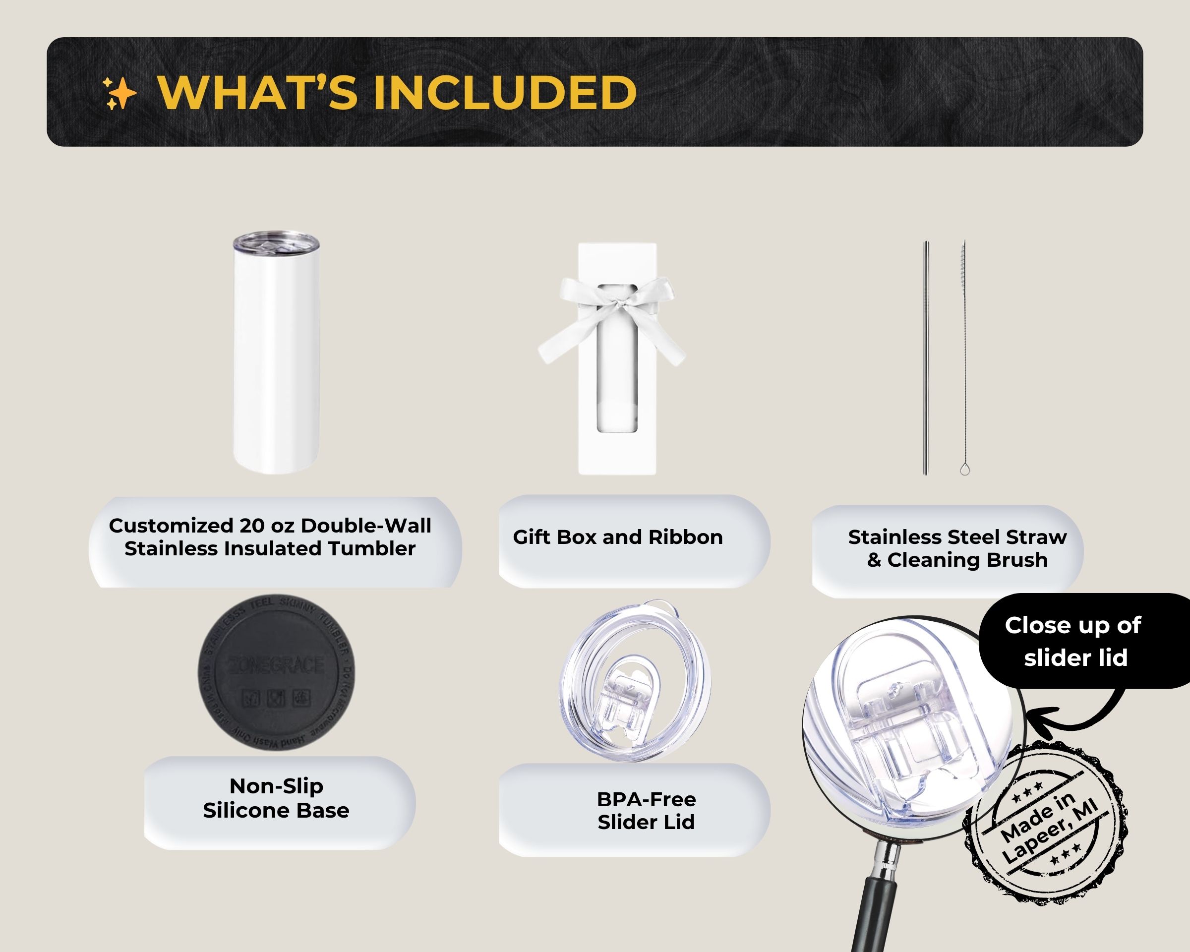 BPA-free slider lid + stainless straw + cleaning brush