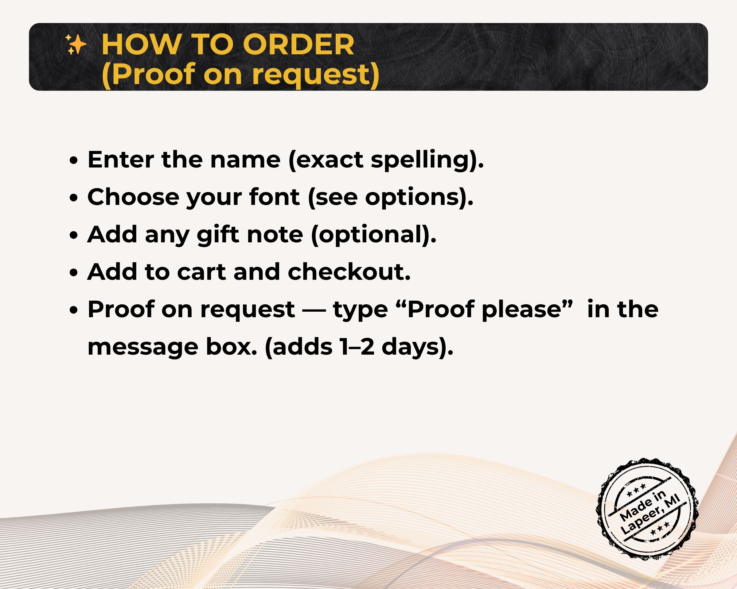 Made to order in 1–2 business days (proof adds 1–2 days)