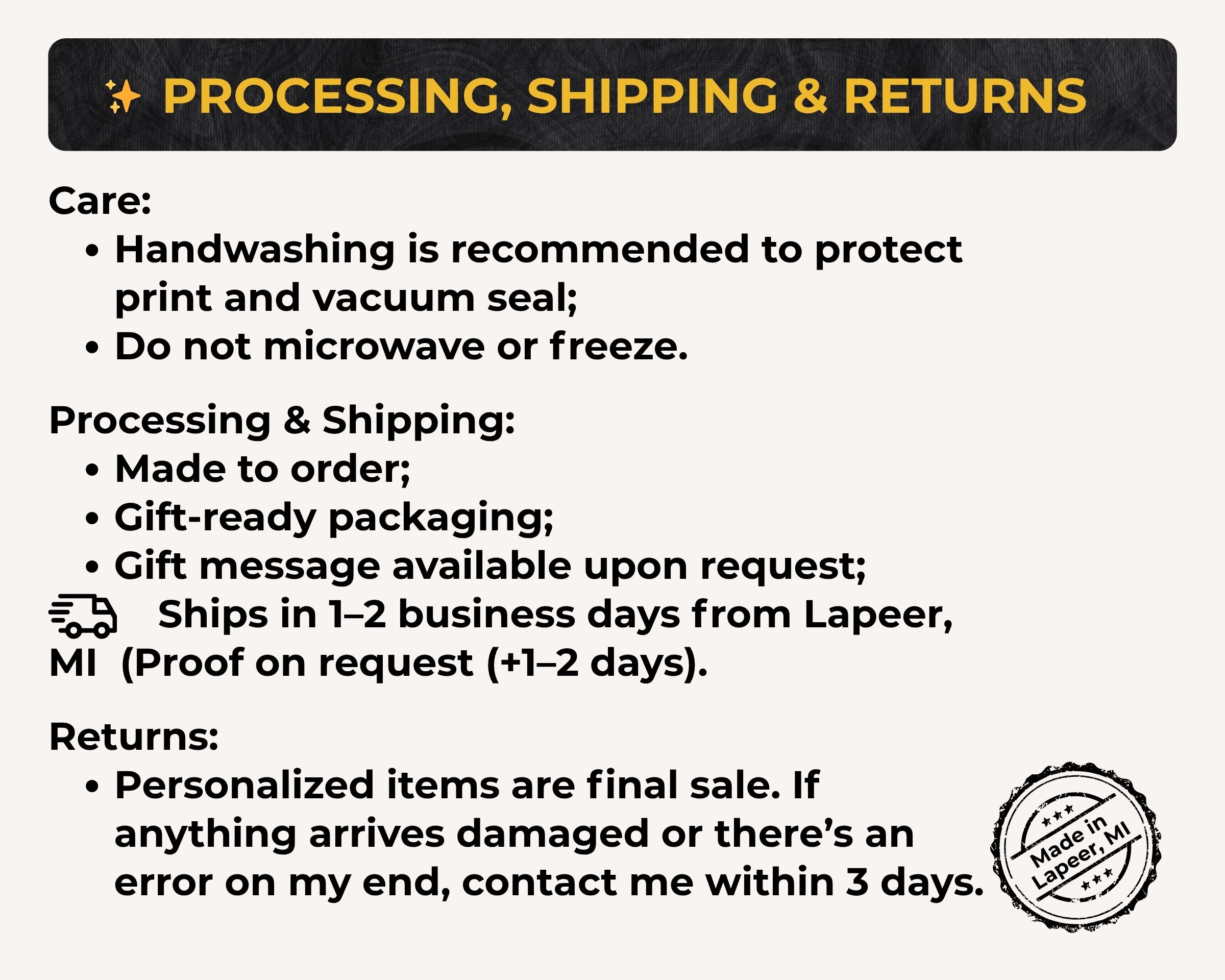 PRODUCTION TIME: Usually, production takes 1-2 business days. Custom and larger orders may take longer.