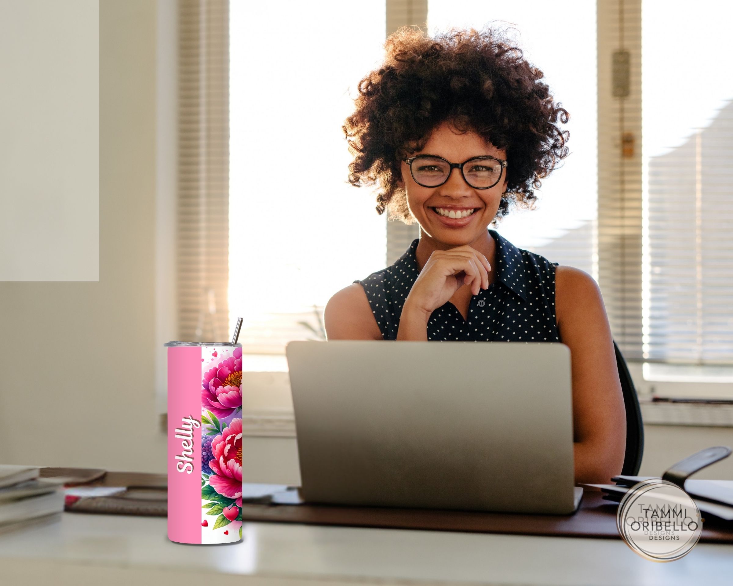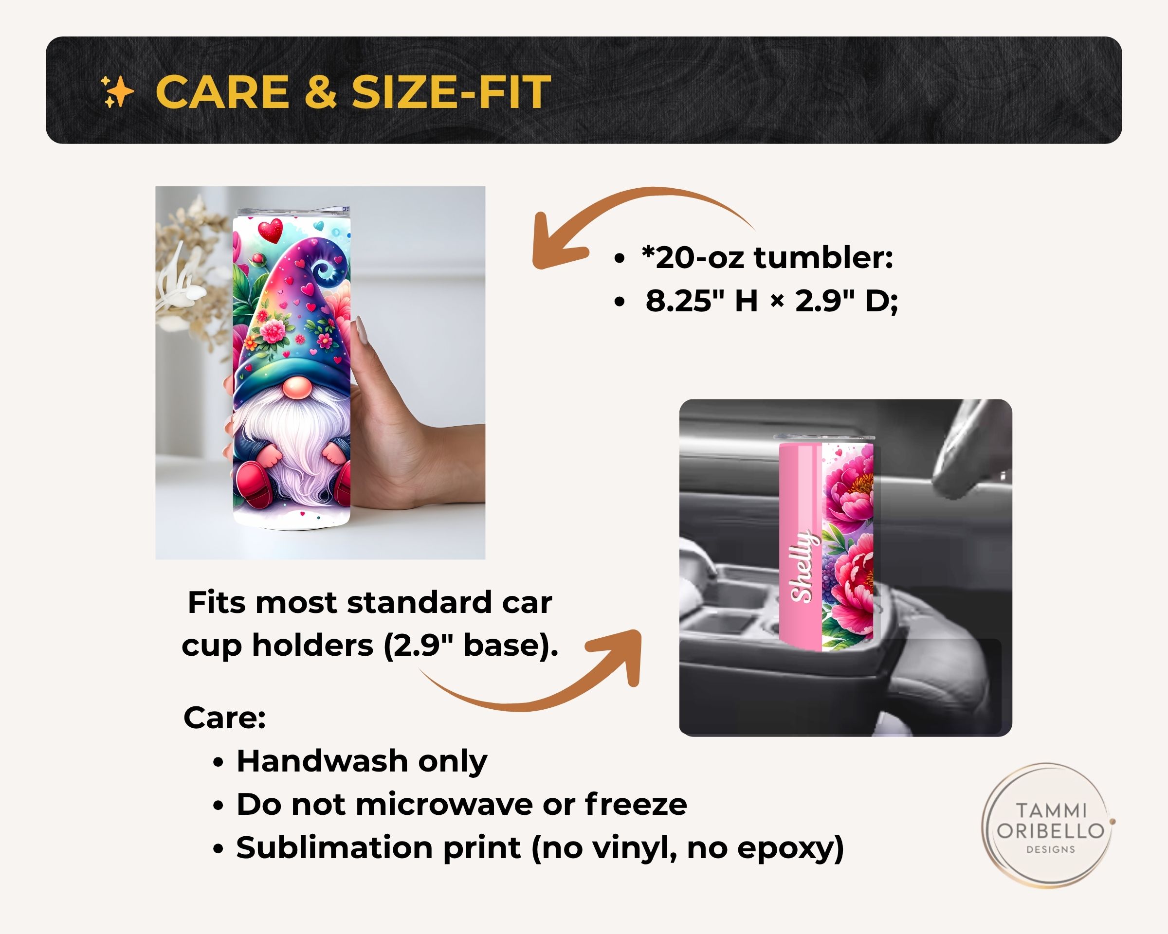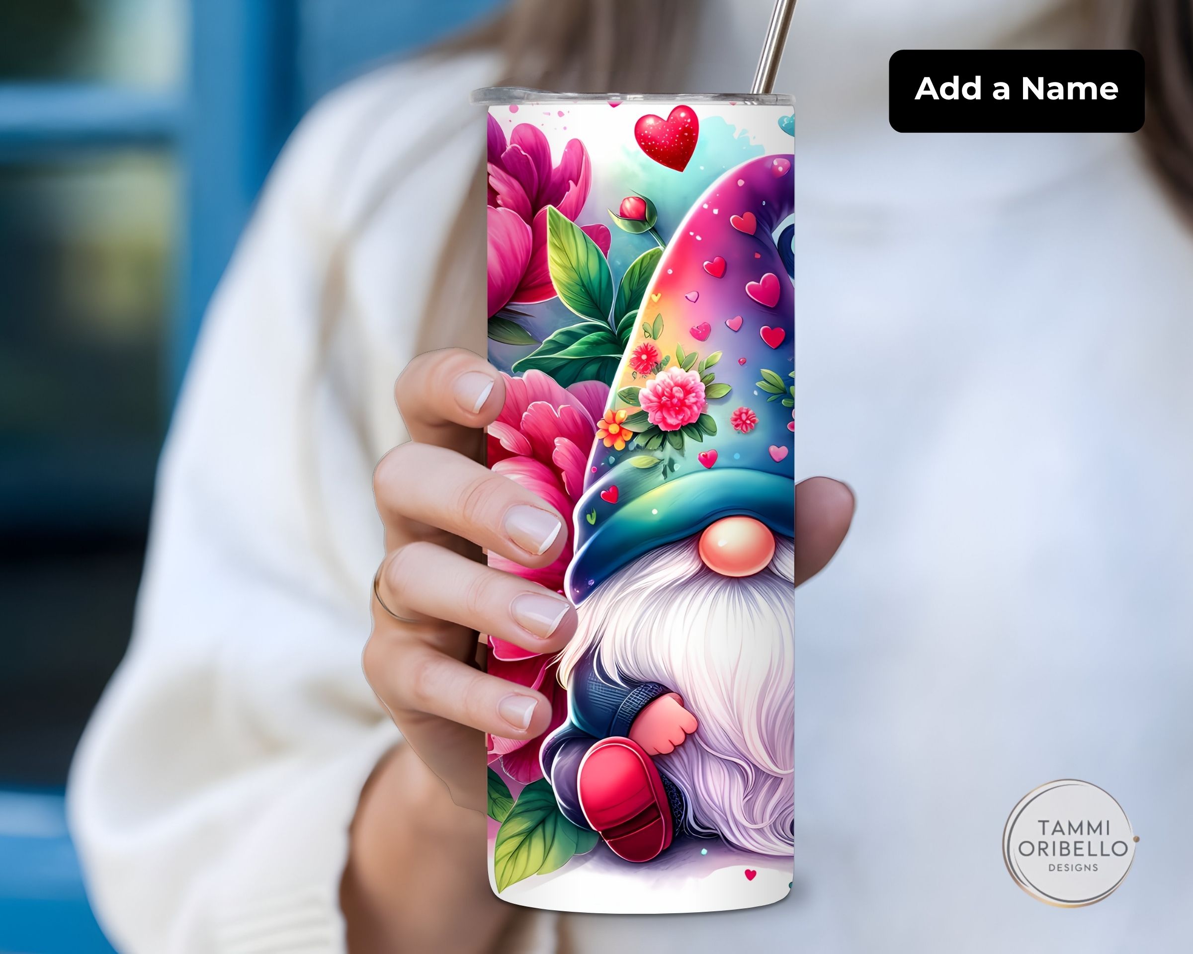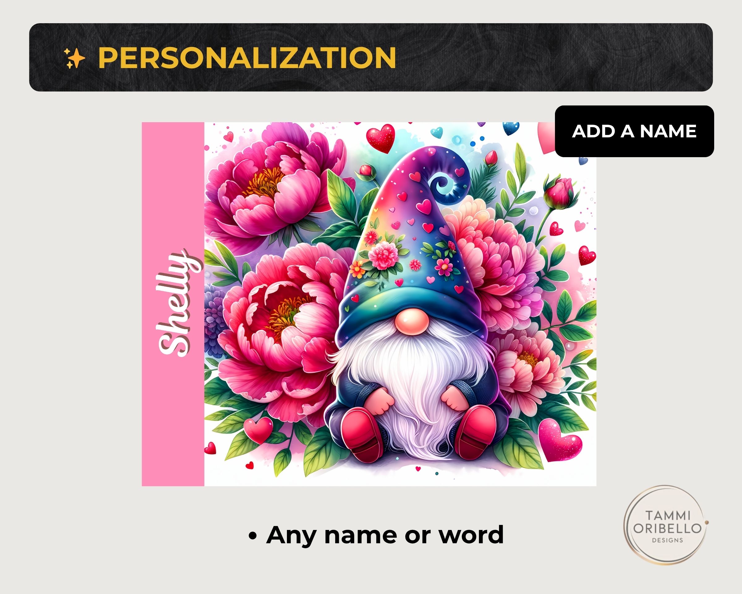Bring a little joy to every sip with this personalized 20-oz tumbler featuring a sweet gnome surrounded by lush pink peonies. Add any name for a gift that feels made just for them.