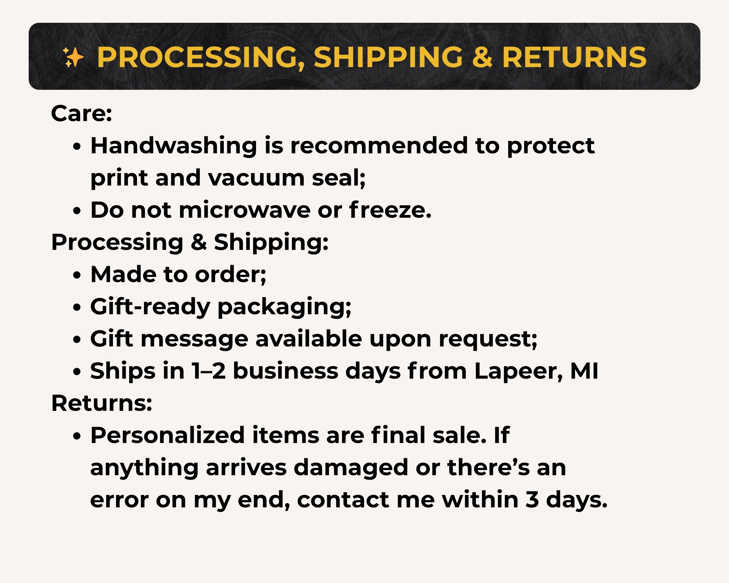 Made & shipped from Michigan Handcrafted by Tammi Oribello Designs in Lapeer, MI and shipped in 1–2 business days (proof adds 1–2 days). Personalized items are final sale; if anything arrives damaged or there’s an error on my end, contact me within 3 days.