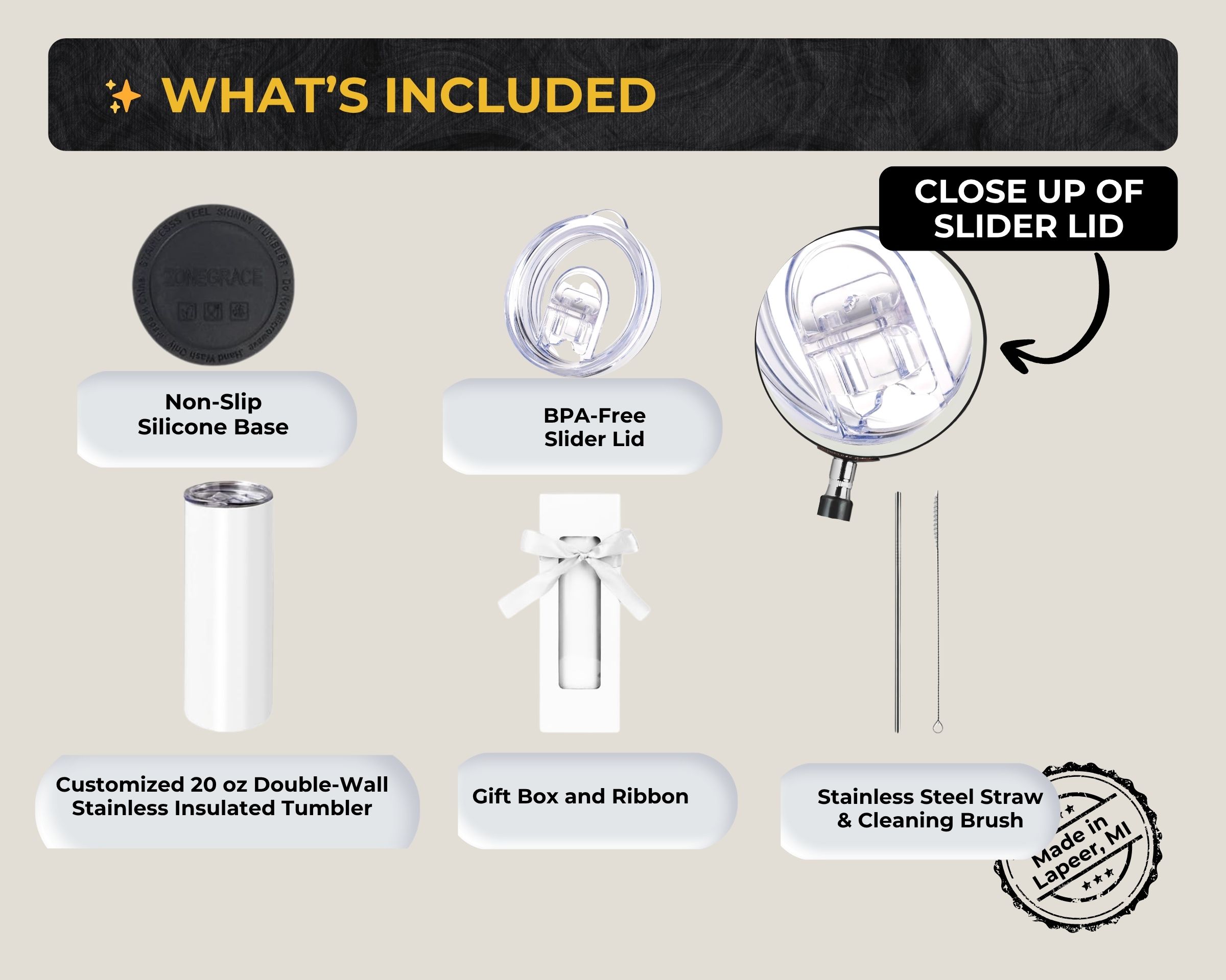 What comes in the box? Tumbler, slider lid, straw, brush, silicone base, and a ribboned gift box.