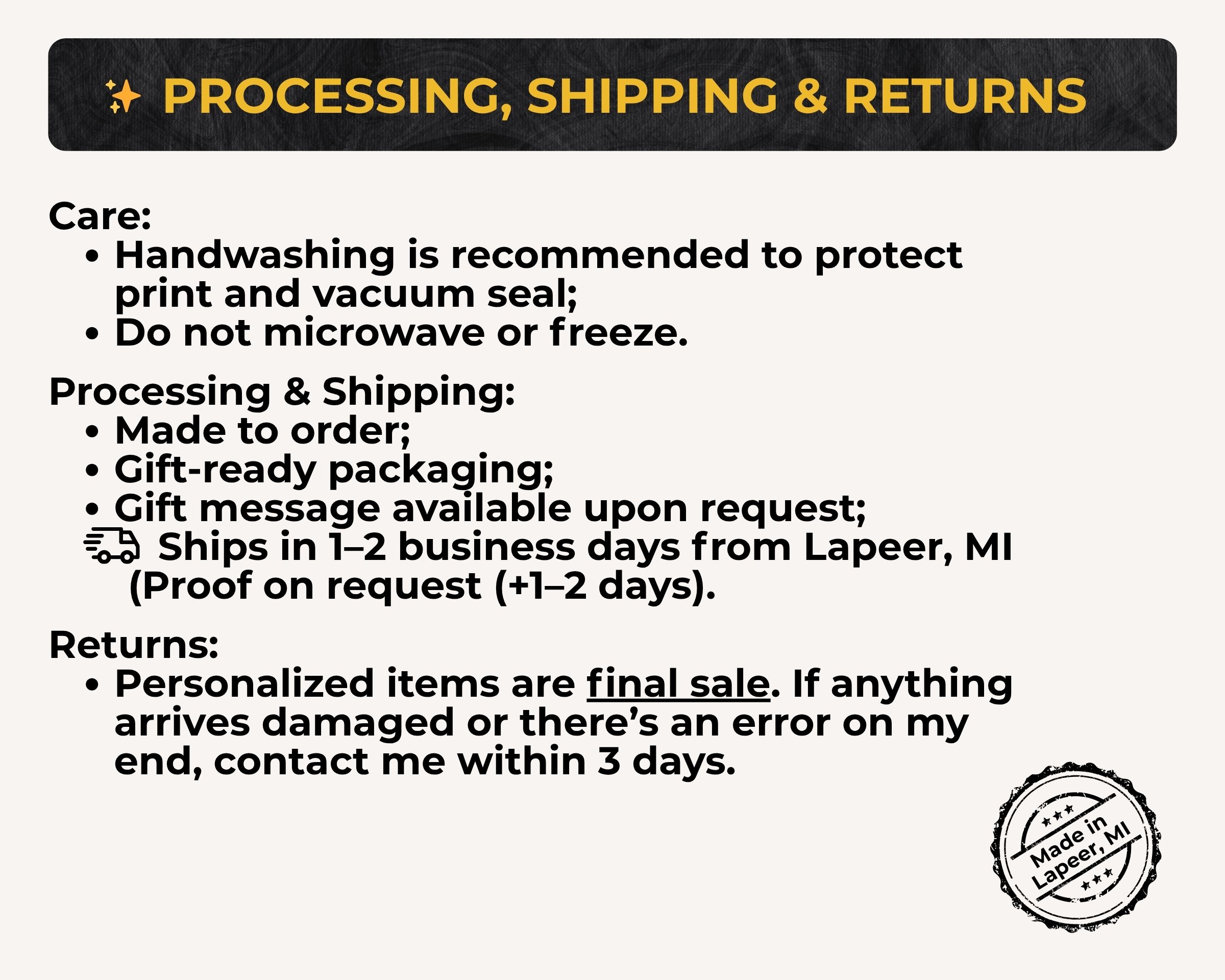 PRODUCTION TIME: Usually, production takes 1-2 business days. Custom and larger orders may take longer.