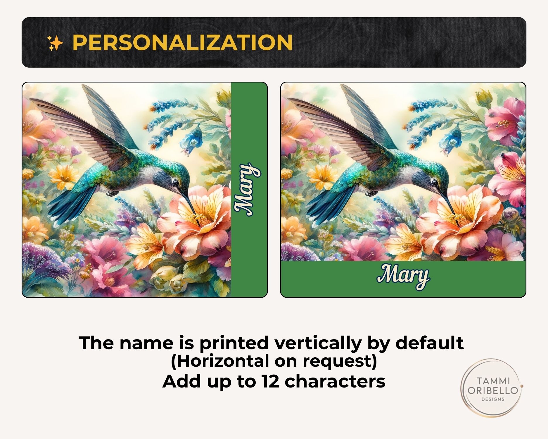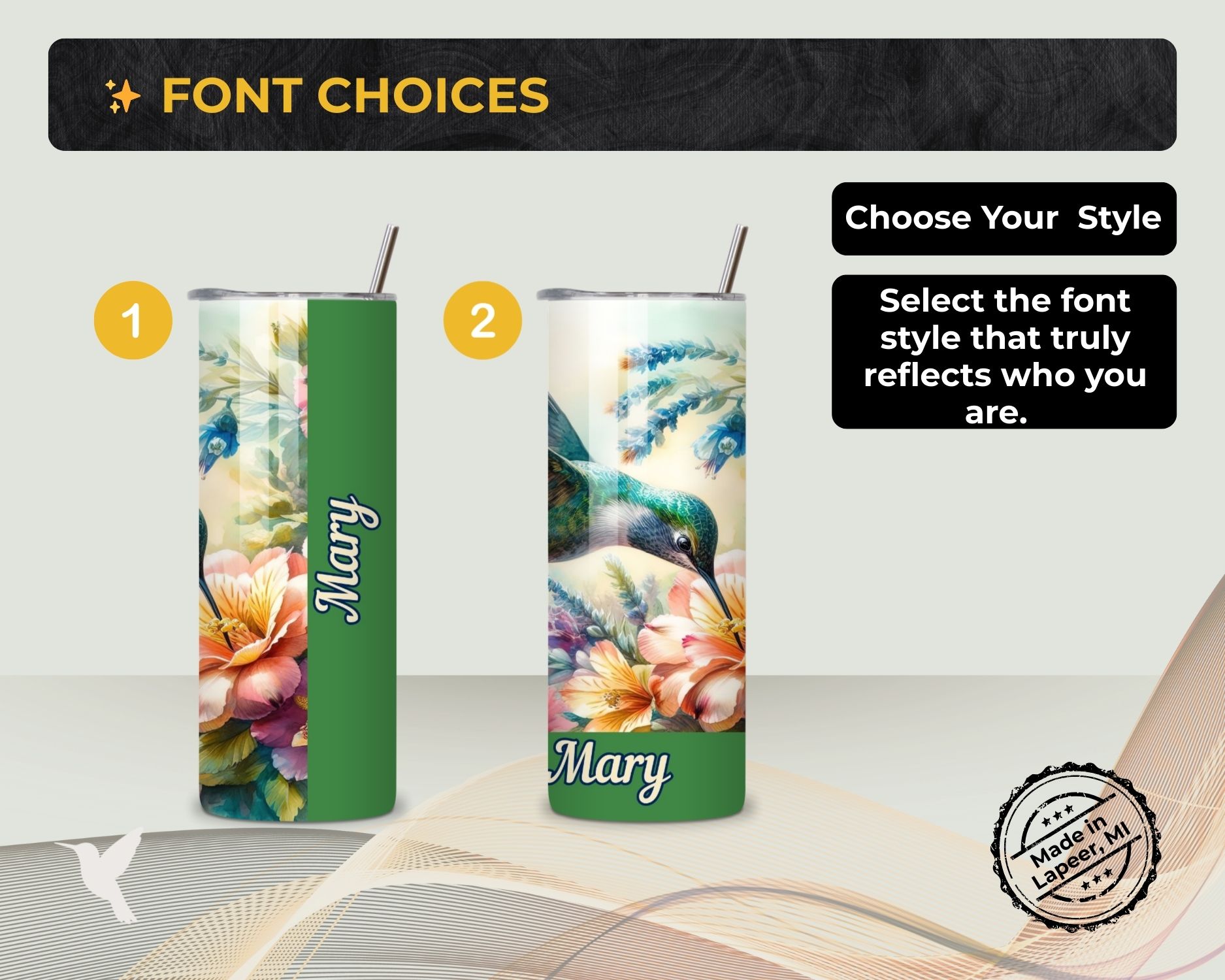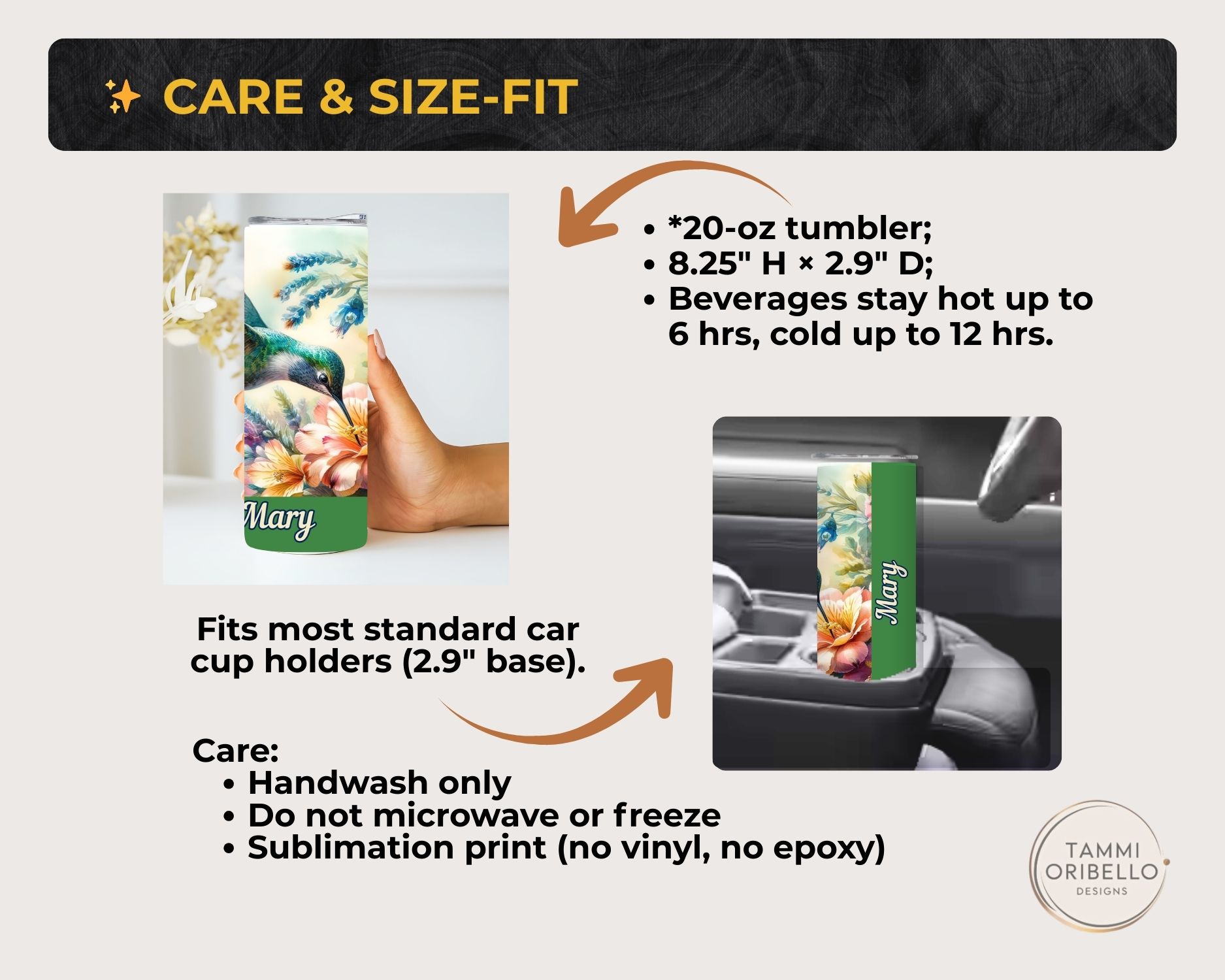 This 20 oz stainless steel insulated tumbler features a hummingbird surrounded by garden flowers and a green name panel that makes it feel like it was created just for you—or someone you love.