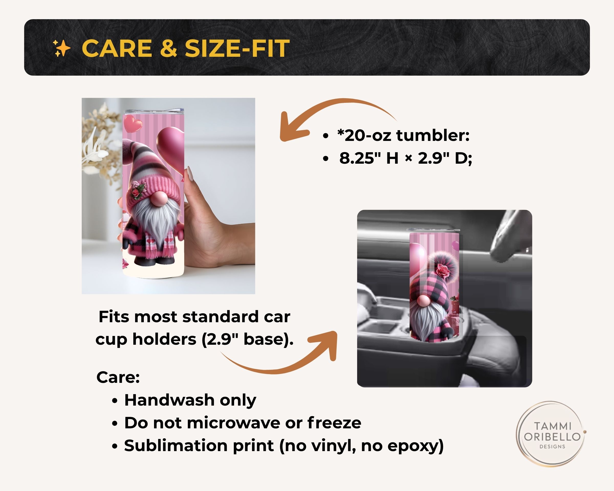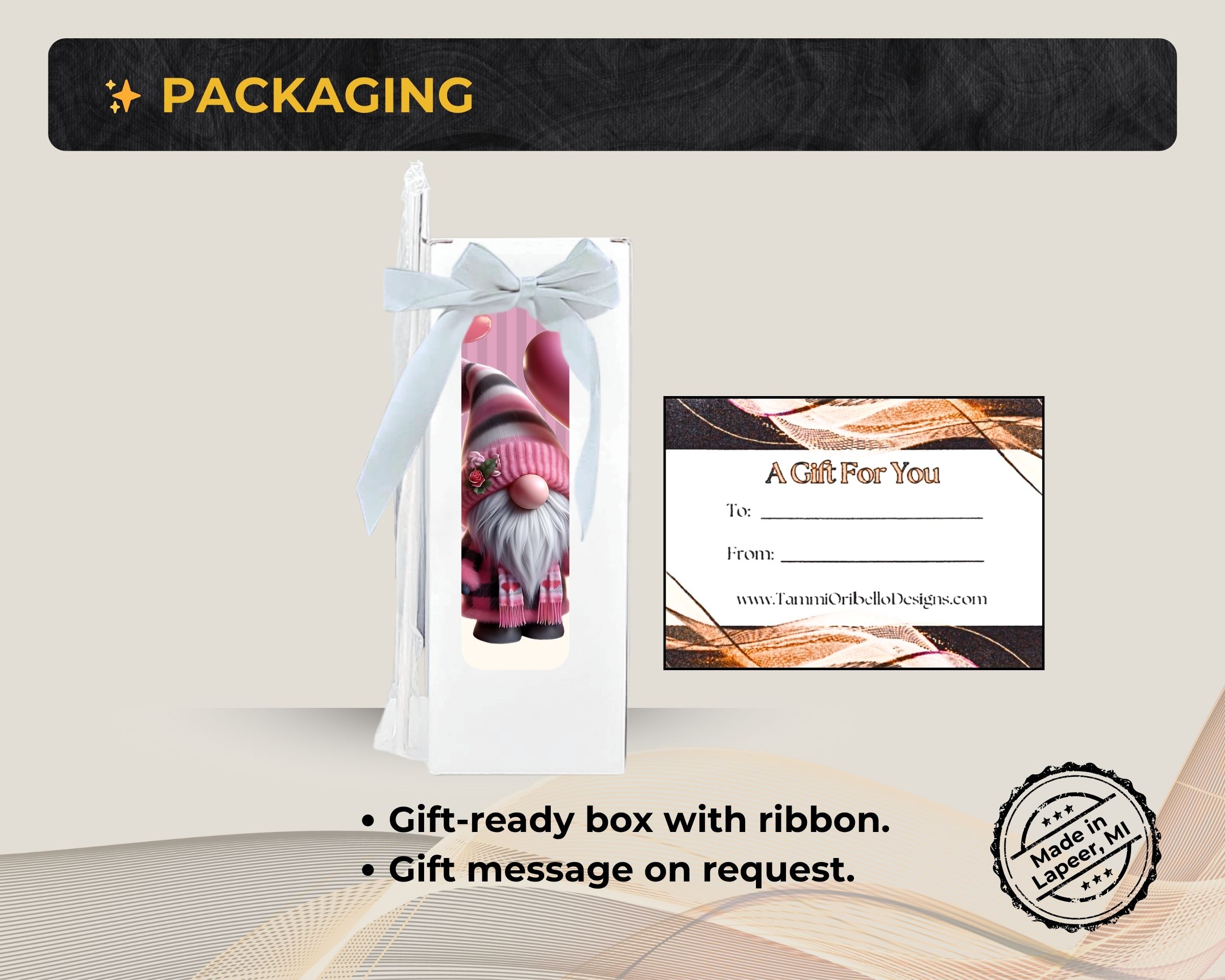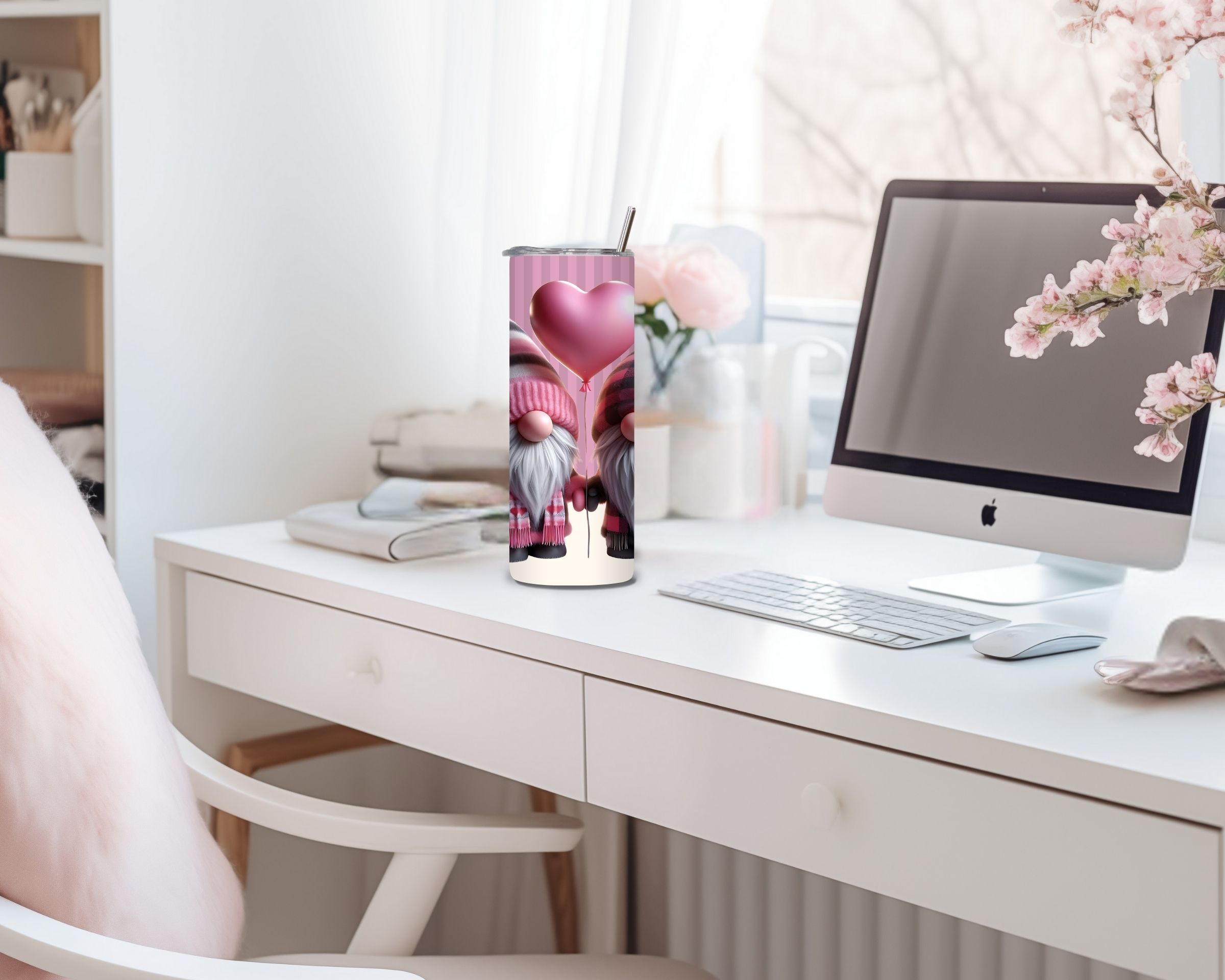 Make someone smile with a cozy, pink gnome couple holding a heart balloon—personalized with any name. This 20-oz stainless tumbler keeps drinks hot or cold and arrives gift-ready with a ribboned box. Handcrafted and shipped from Lapeer, Michigan.