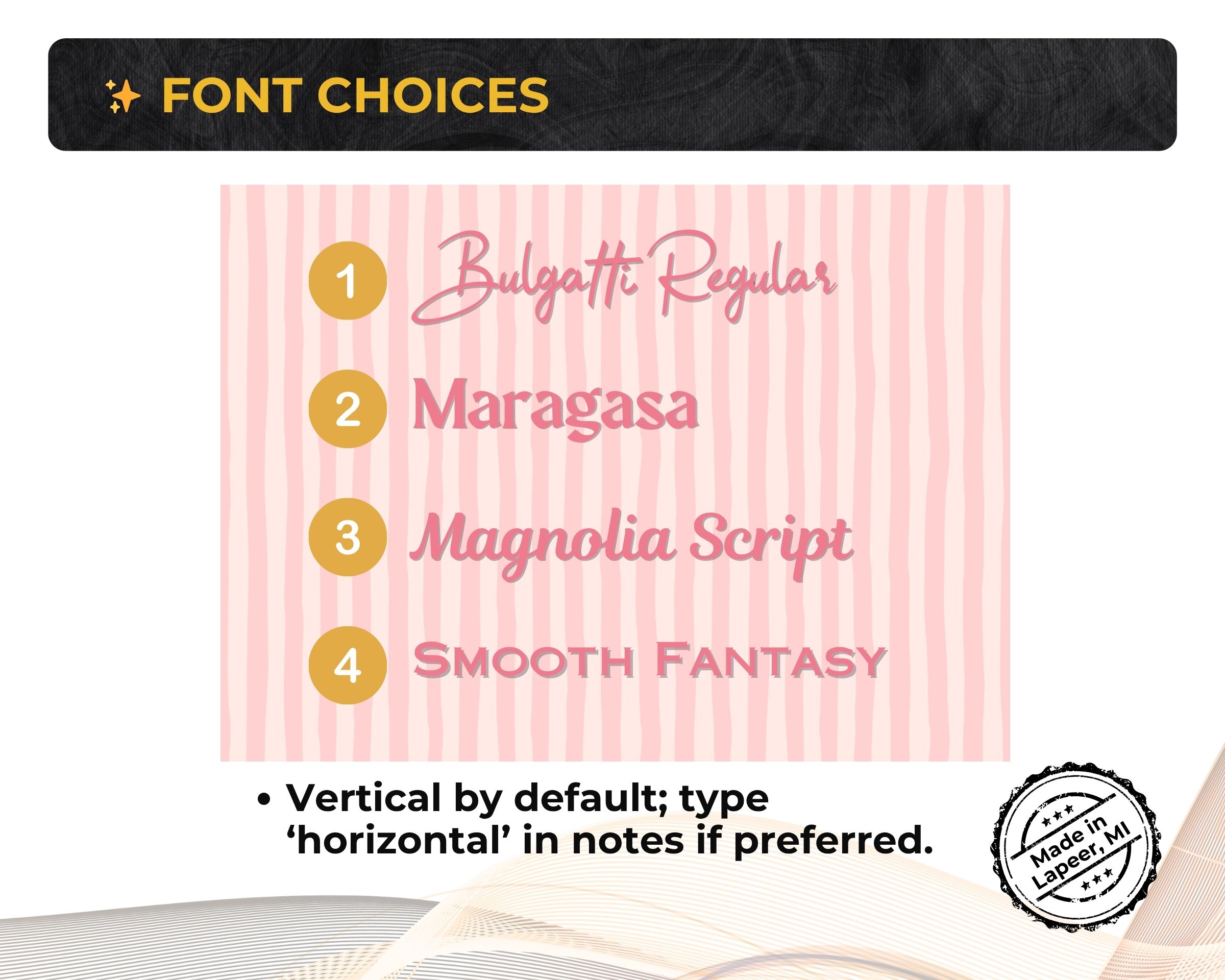 • Font choices: Bulgatti Regular, Maragasa, Magnolia Script, Smooth Fantasy