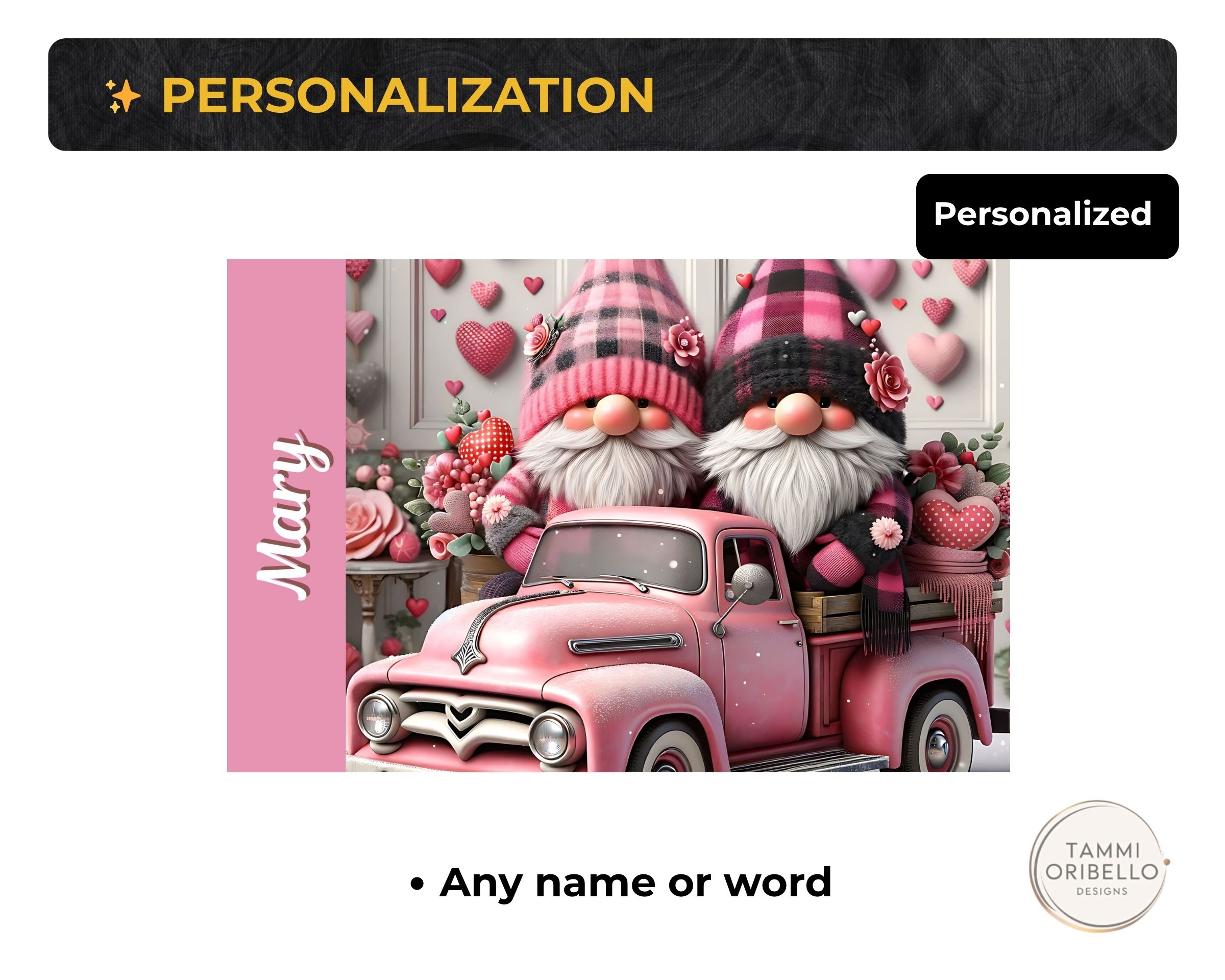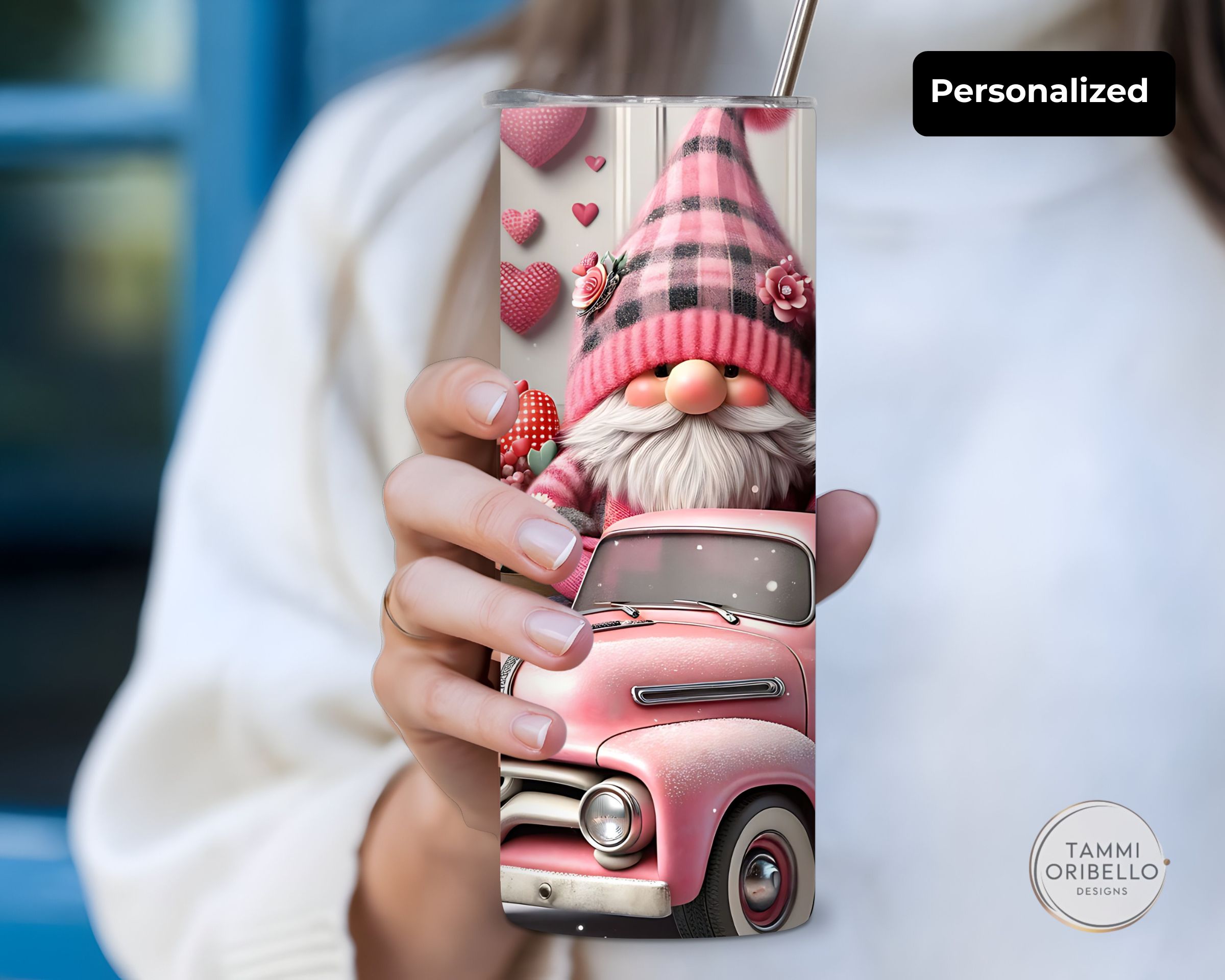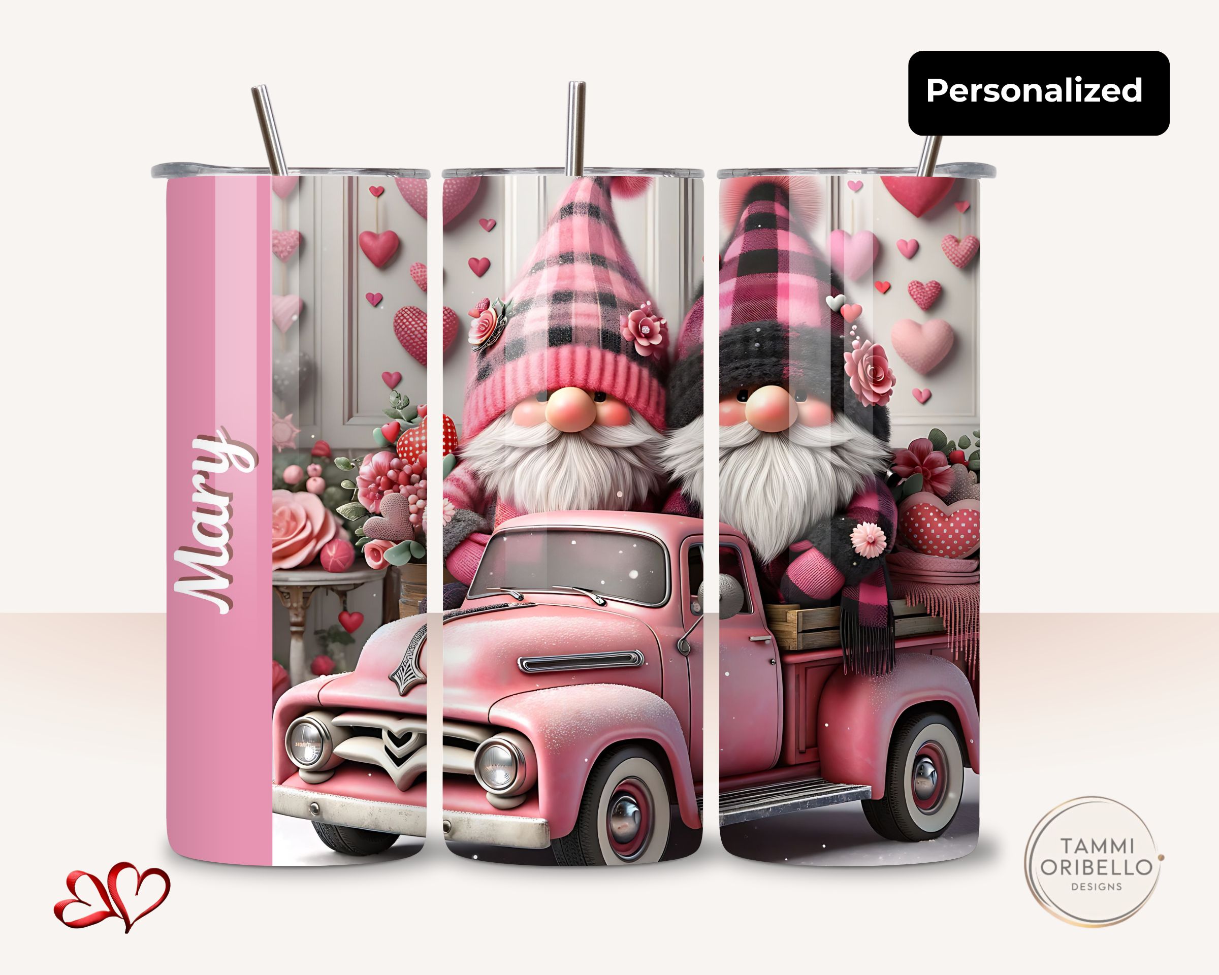 Bring a little cozy love to every sip. This sweet pink gnome couple and vintage truck design tumbler is personalized with any name and made just for you in Lapeer, MI.