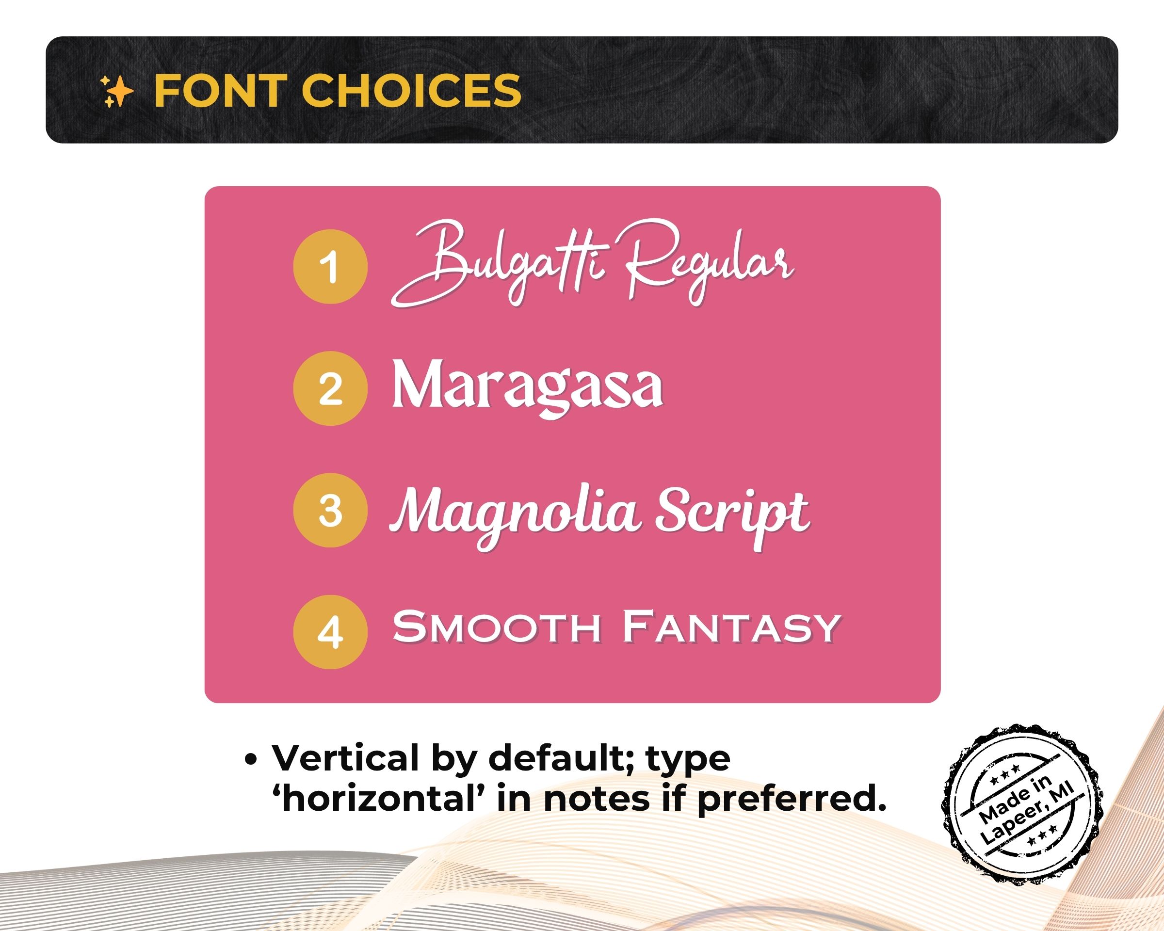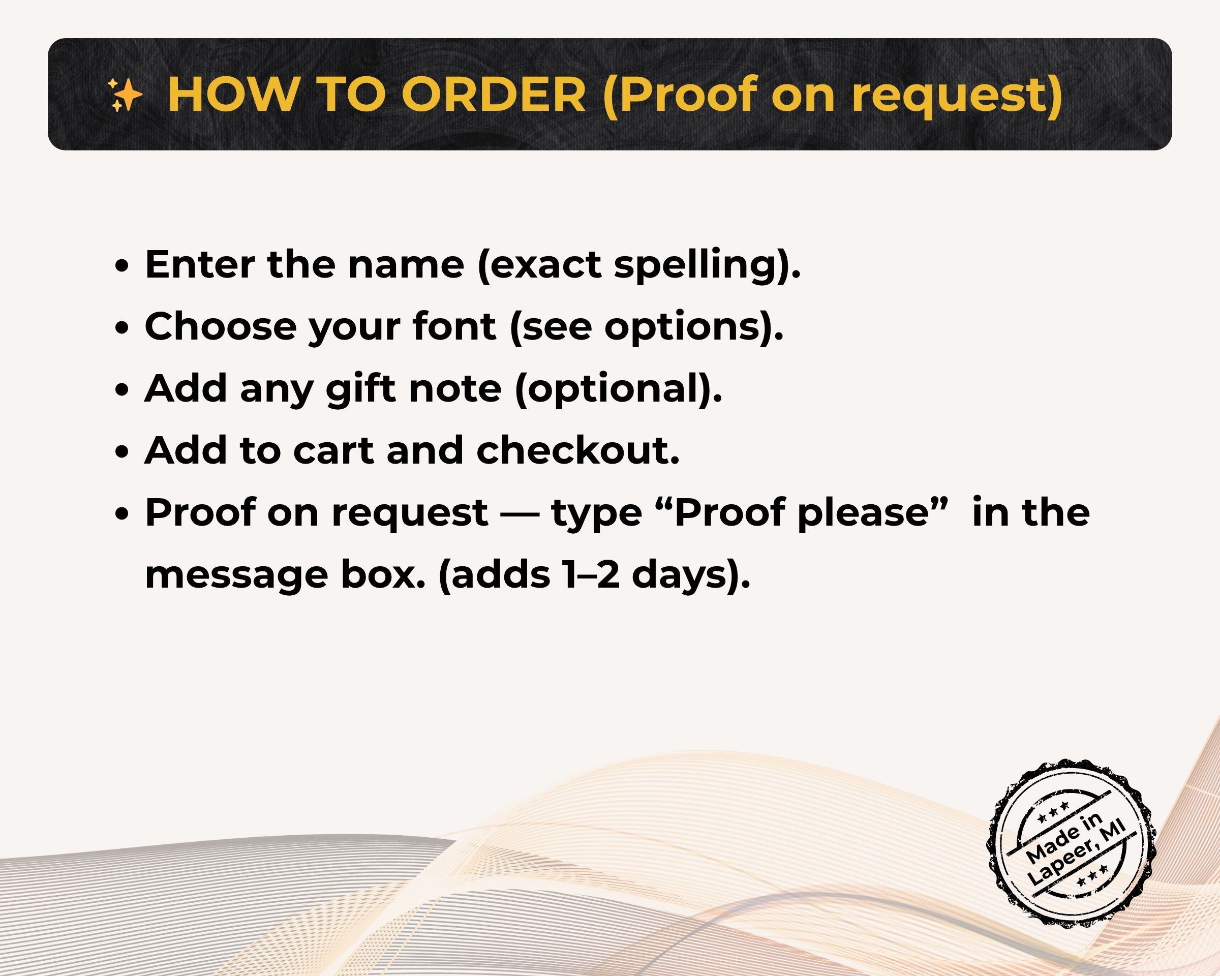 Processing & Shipping Made to order. Ships in 1–2 business days from Lapeer, MI. Need a proof? Type “Proof please” in the message box (adds 1–2 days).