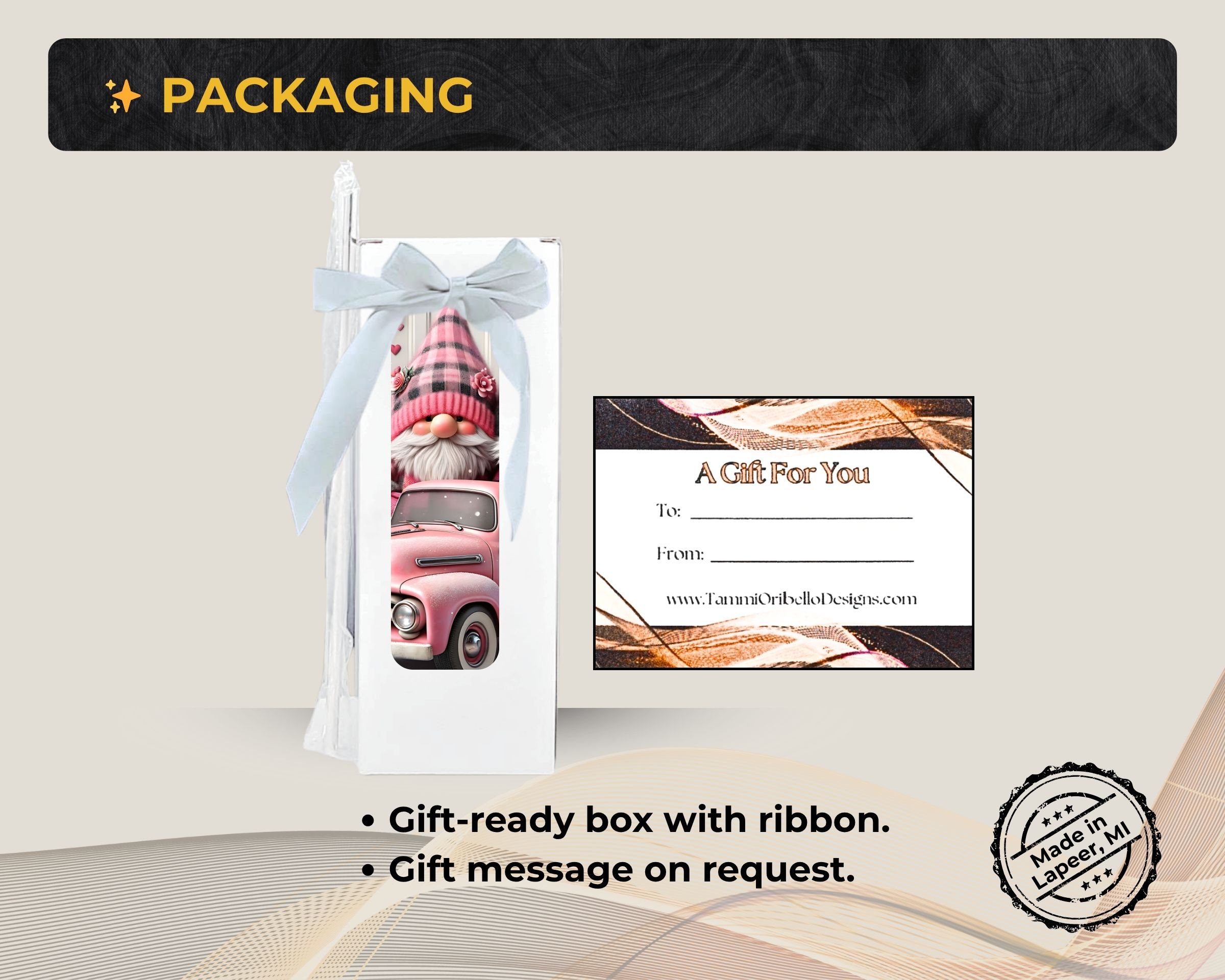 Every item is handmade and shipped from my studio in Lapeer, Michigan — often featuring custom art, your favorite colors, meaningful quotes, names, dates, or even photos.