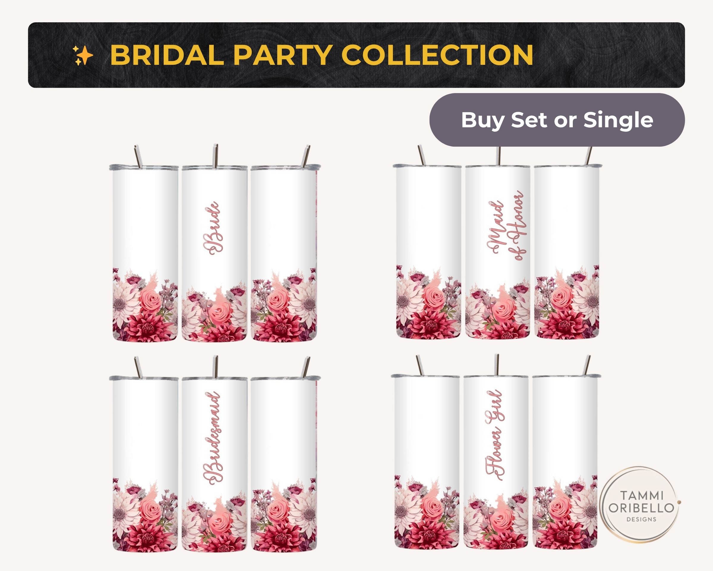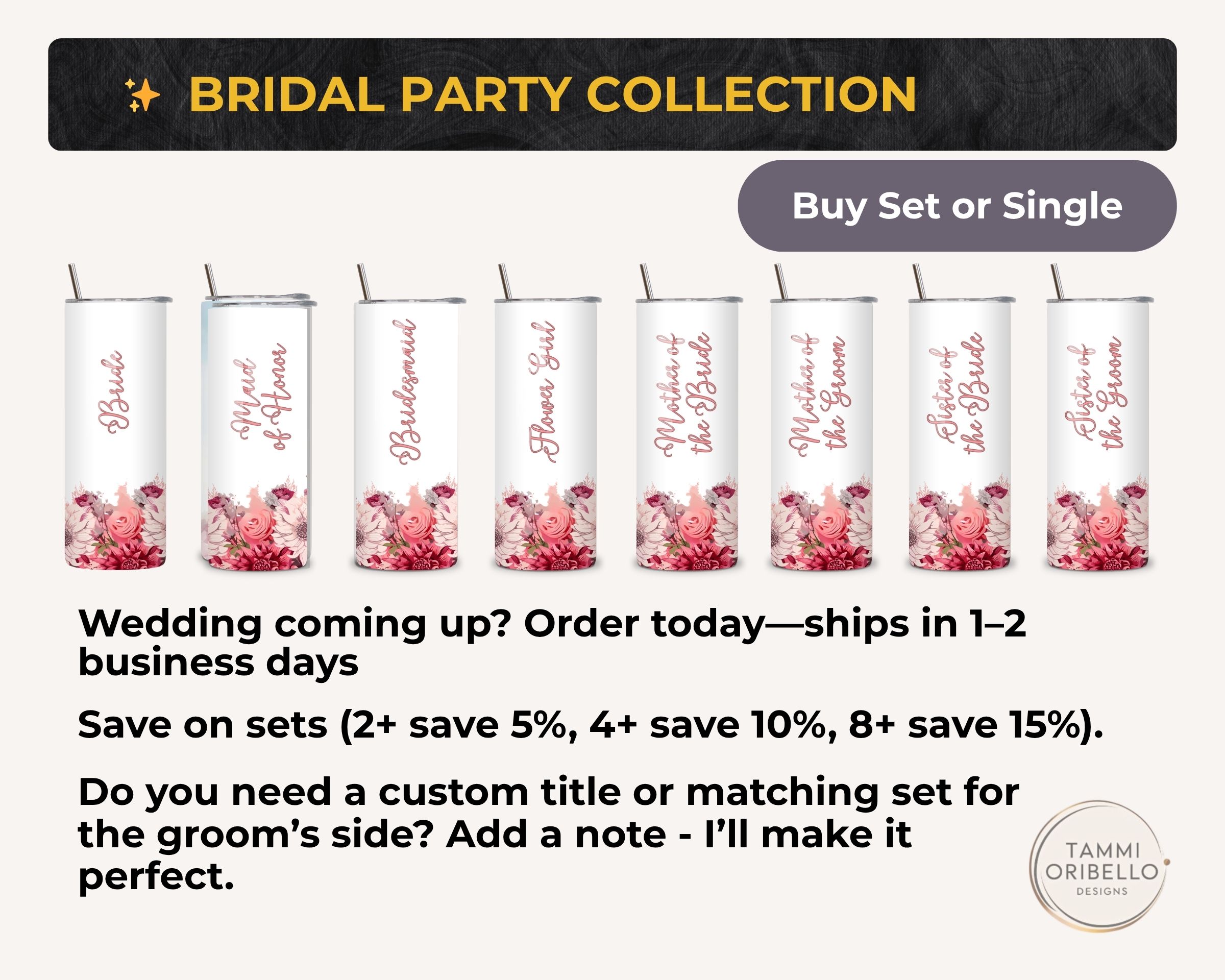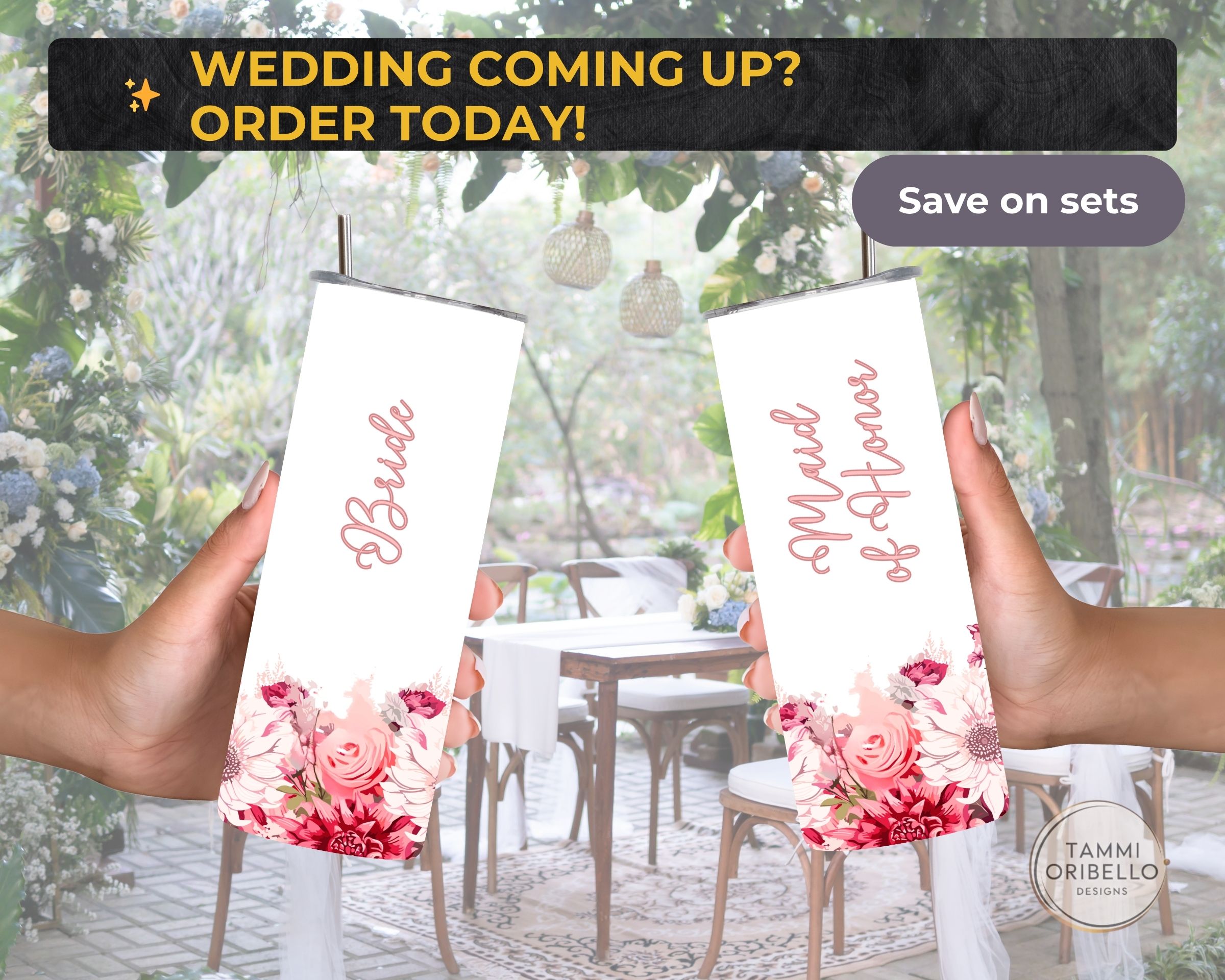 Pink flower bridal party tumblers with elegant script for matching bridal party tumblers. Buy singles or build a set. Optional names. Gift-ready. Ships in 1–2 days.