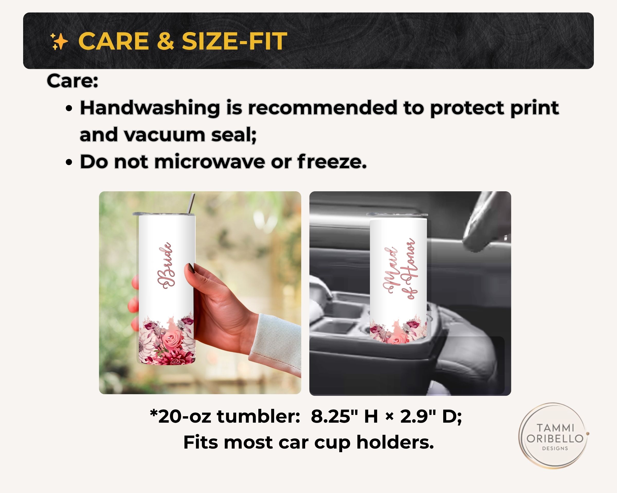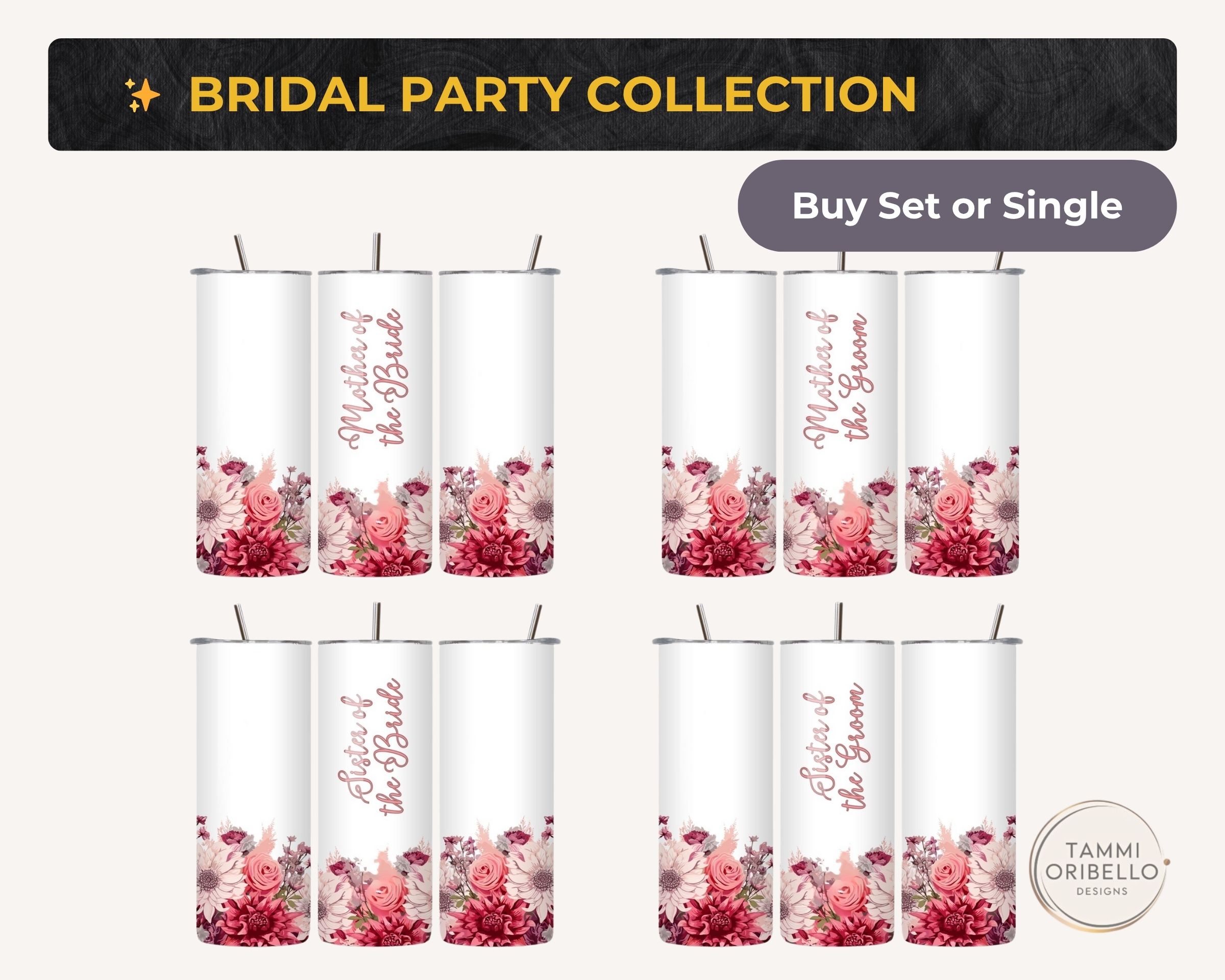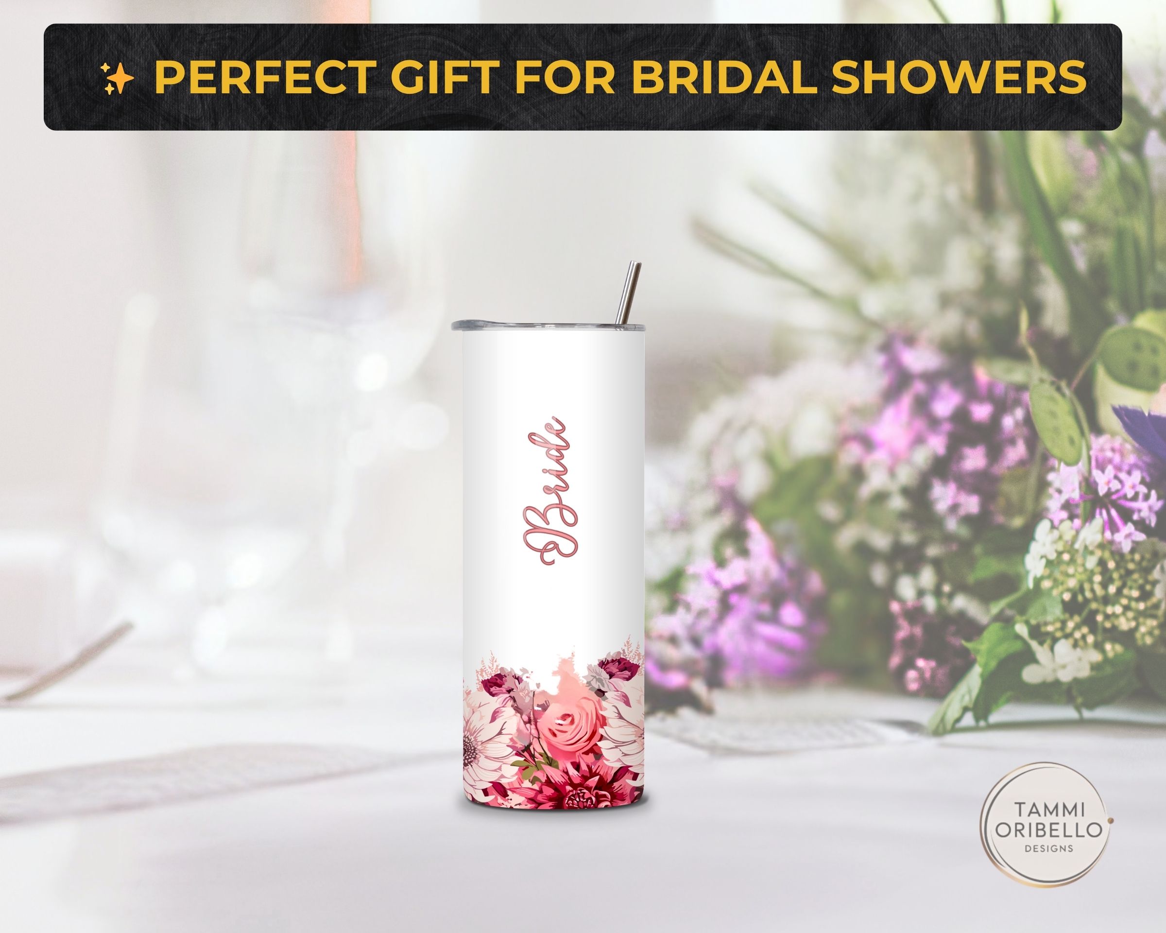 Pink flower bridal party tumblers with elegant script for matching bridal party tumblers. Buy singles or build a set. Optional names. Gift-ready. Ships in 1–2 days.