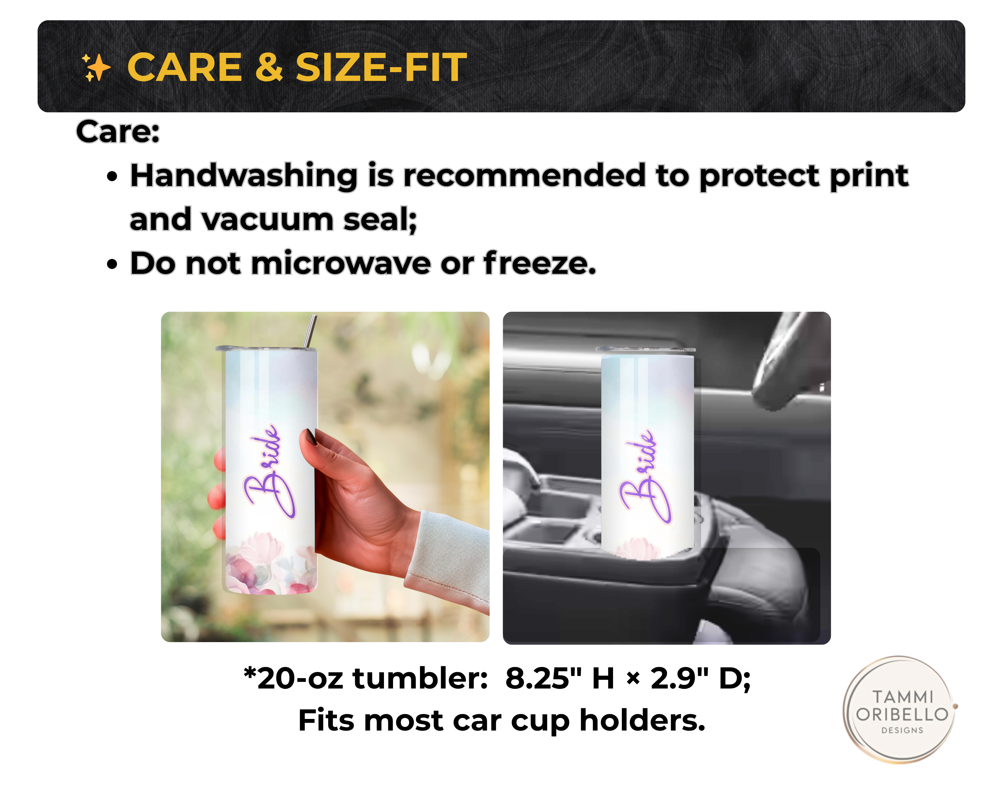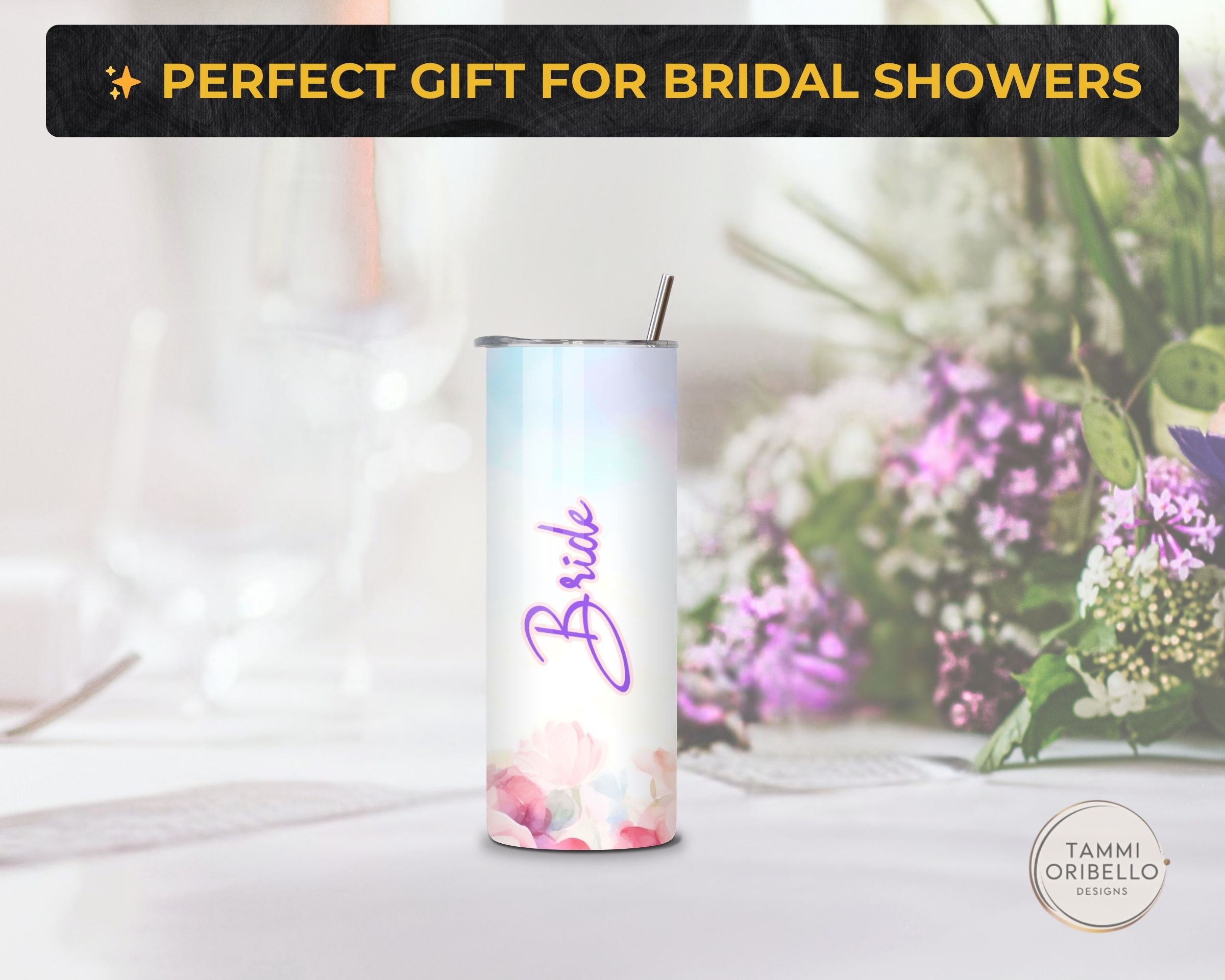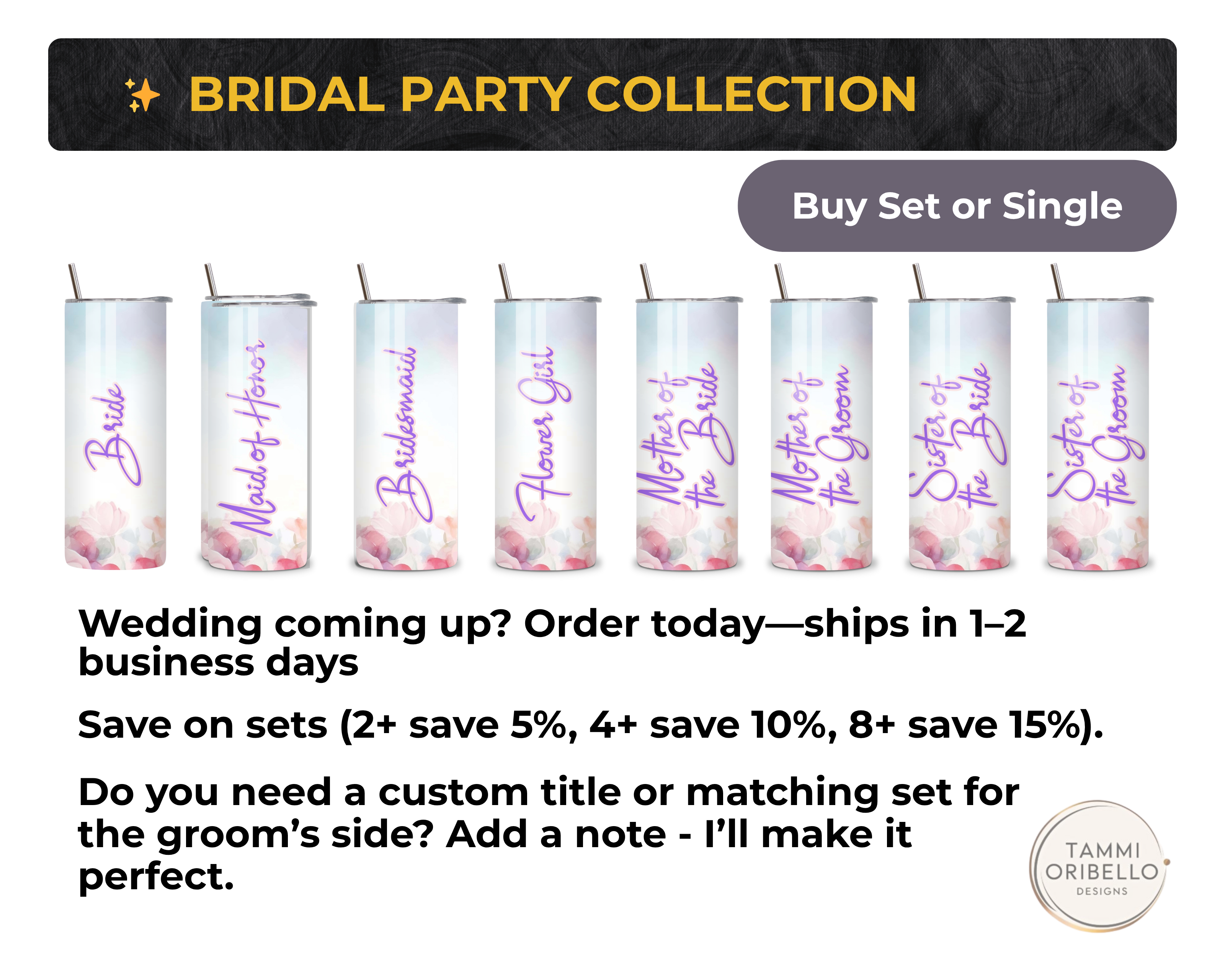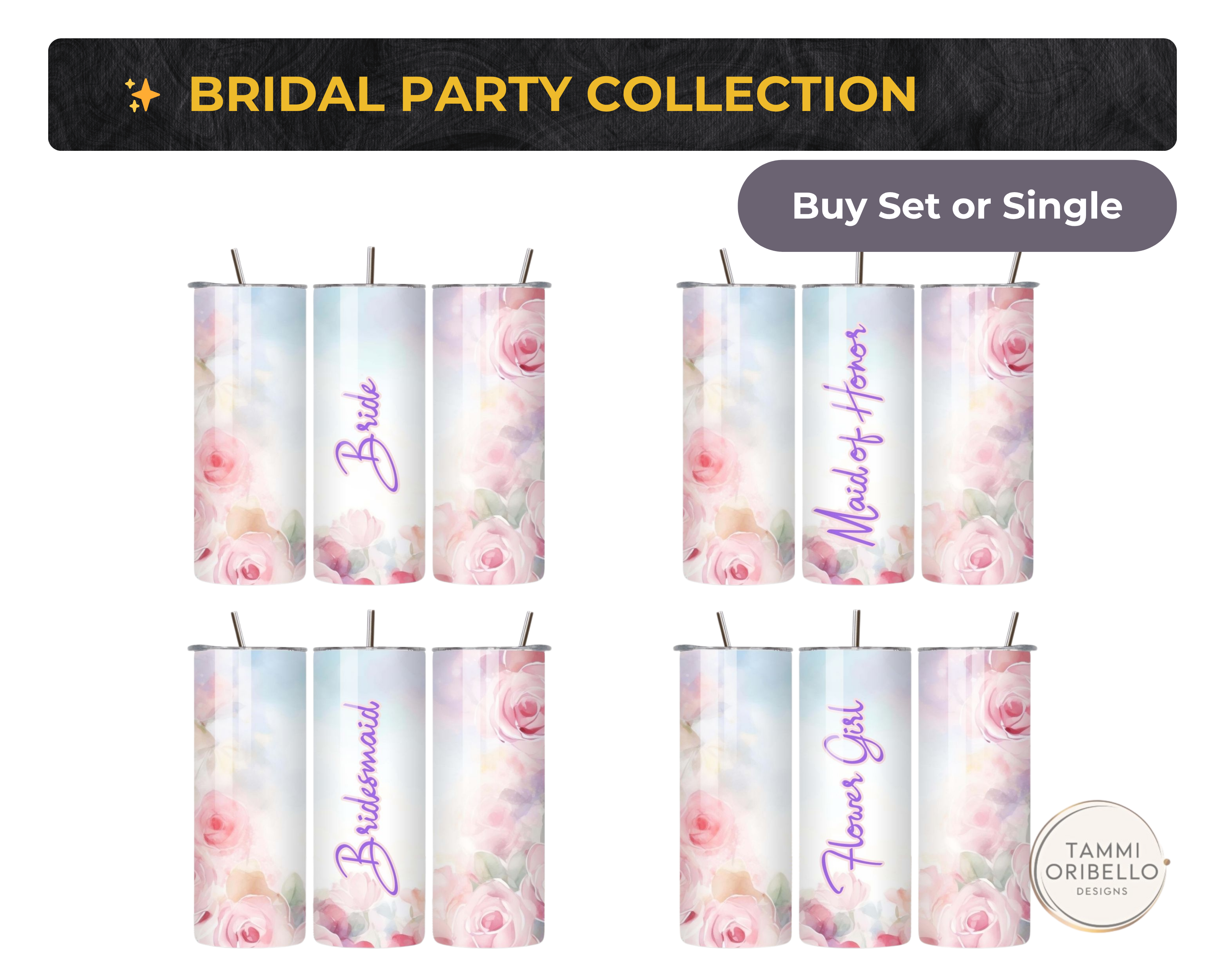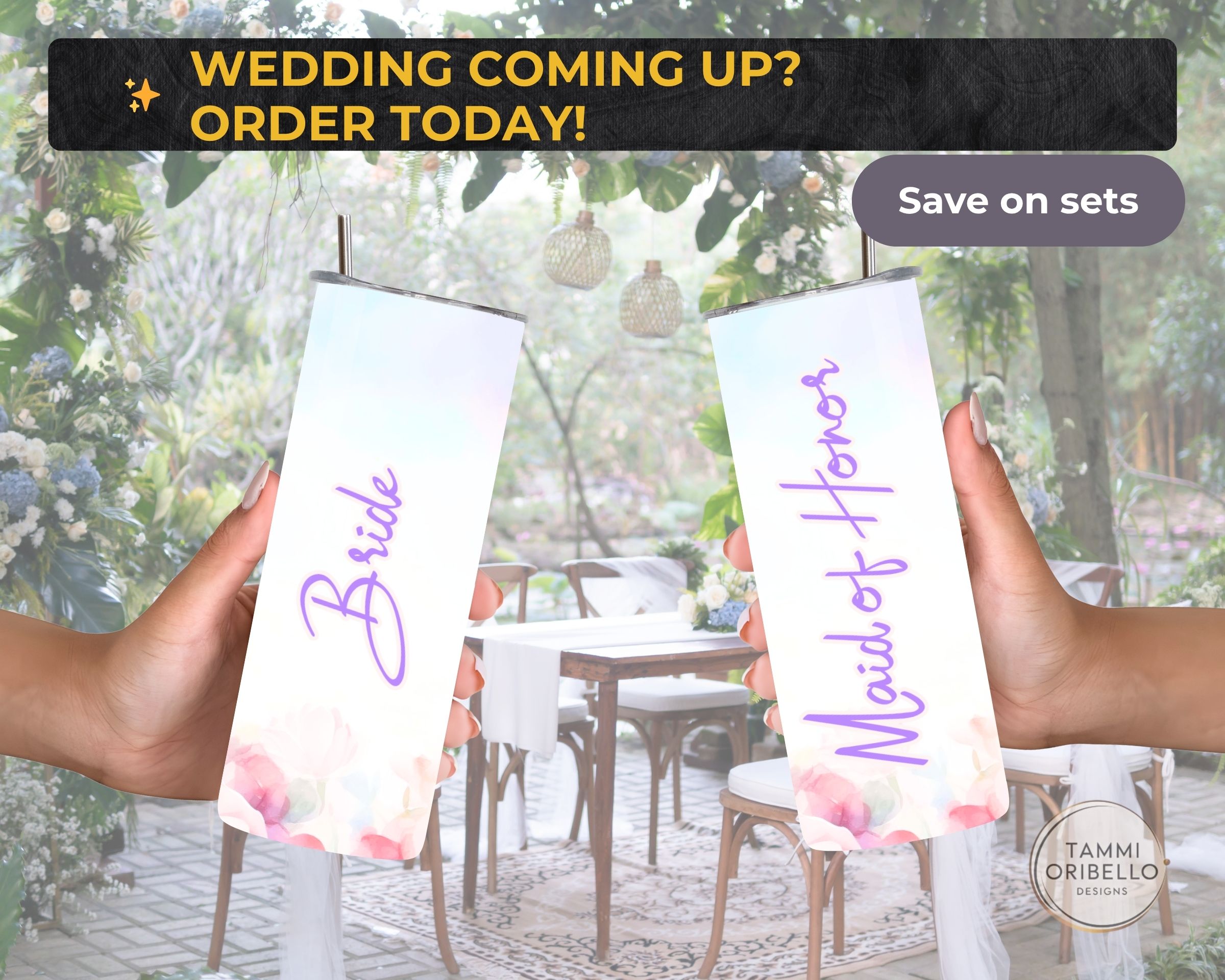 Celebrate your crew with soft pastel pink flower tumblers. Buy a set or a single for Bride, Bridesmaid, Maid of Honor, Flower Girl, Mother/Sister of the Bride or Groom. 20-oz stainless keeps drinks hot or cold, and the watercolor look blends with pastel wedding décor—and works for everyday use after the big day.