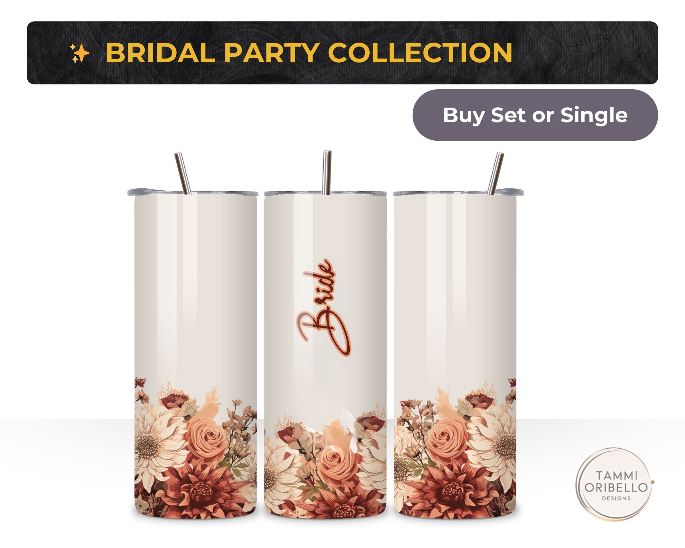 Warm fall floral artwork on 20 oz stainless bridal party tumblers. Buy singles or sets. Optional names. Gift-ready. Ships in 1–2 days.