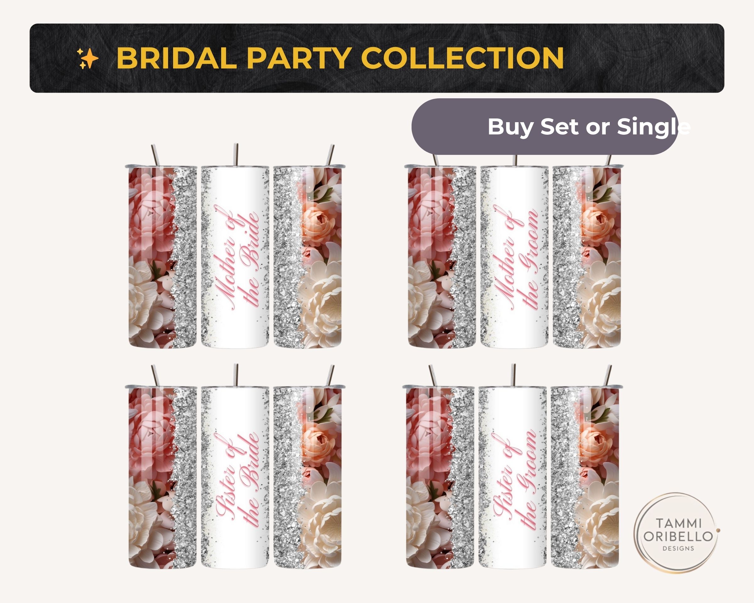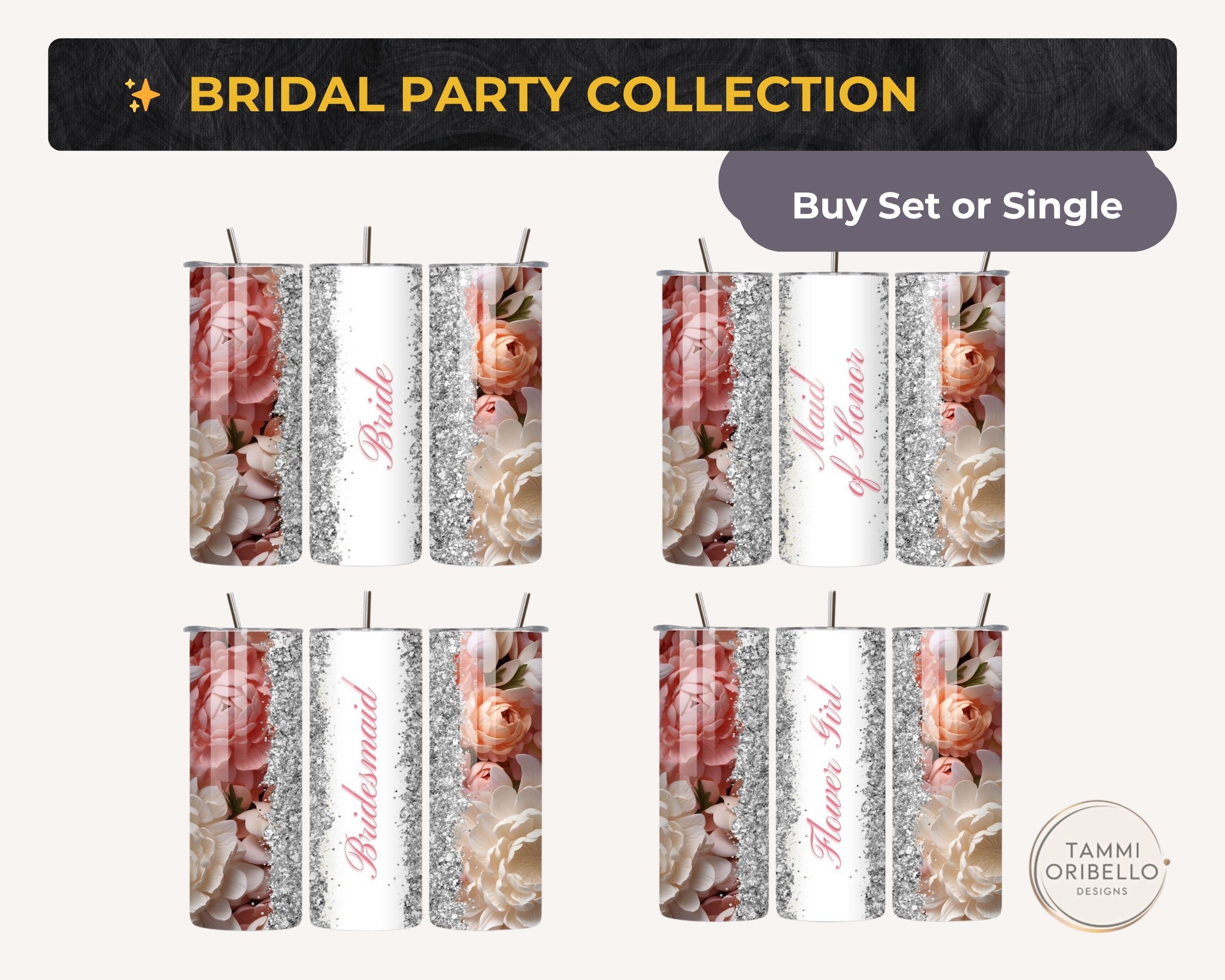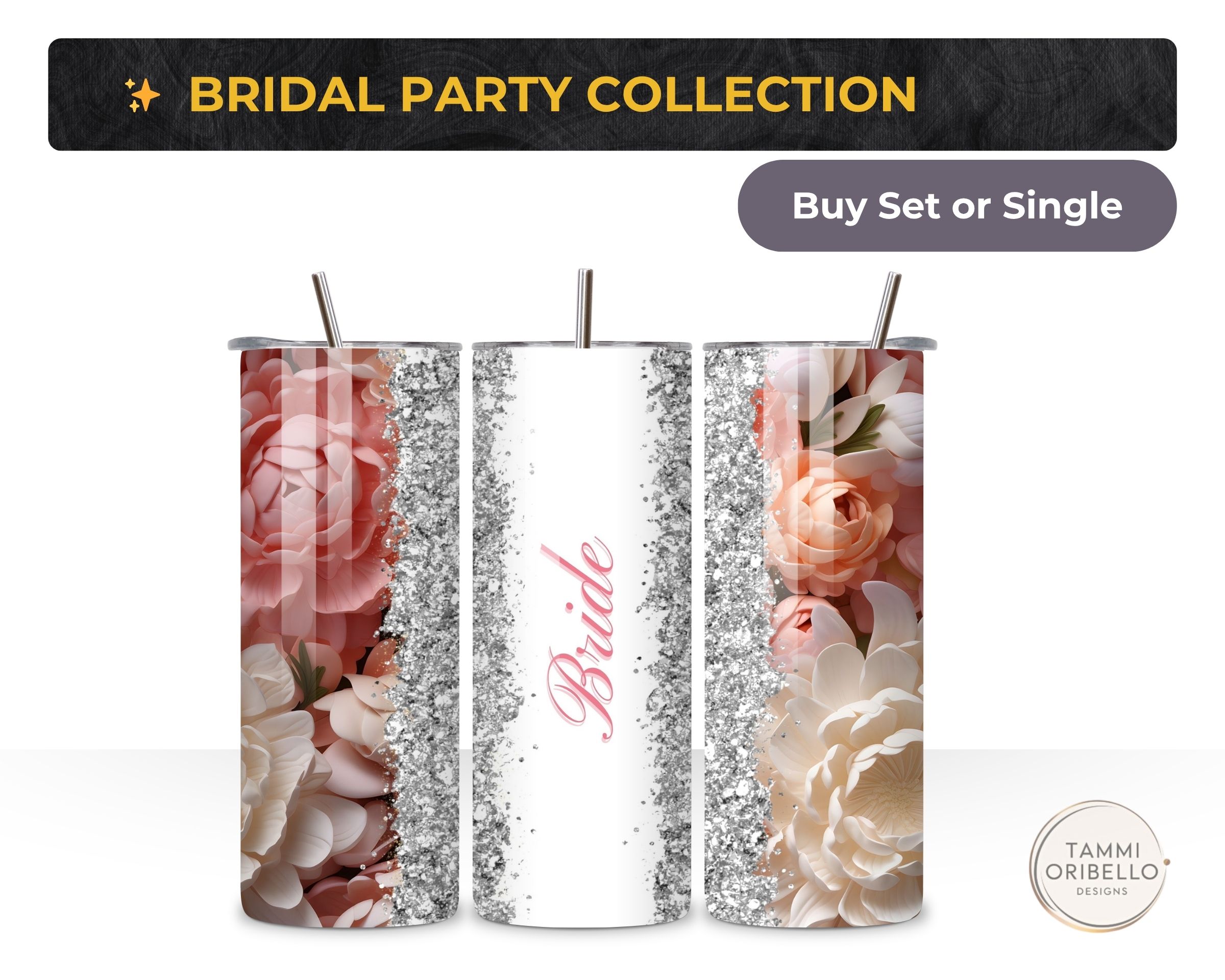 Warm fall floral artwork on 20 oz stainless bridal party tumblers. Buy singles or sets. Optional names. Gift-ready. Ships in 1–2 days.