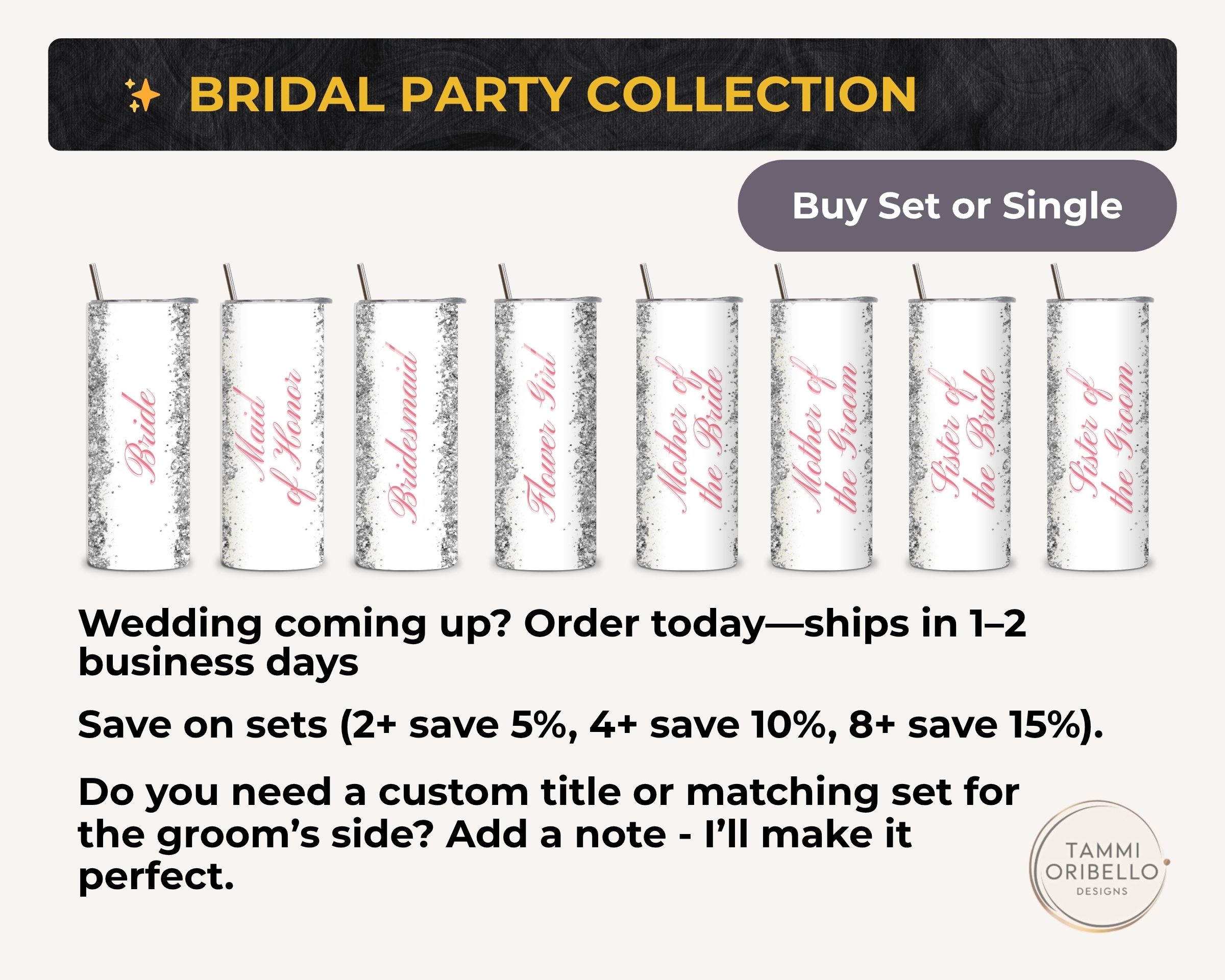 Available titles: Bride • Maid of Honor • Bridesmaid • Flower Girl • Mother of the Bride • Mother of the Groom • Sister of the Bride • Sister of the Groom