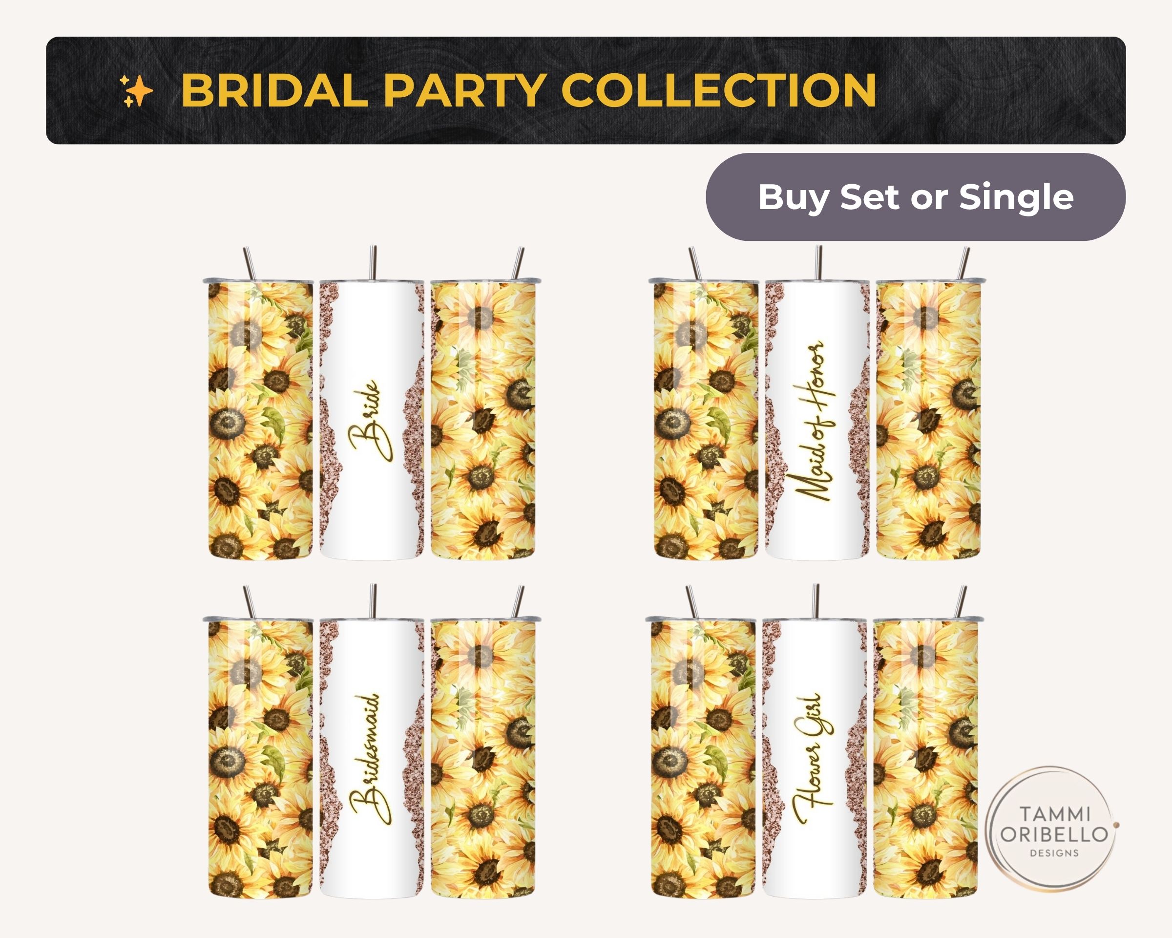 Bright sunflower artwork with a faux glitter-look band. Buy singles or create a set for your whole bridal party. Optional names. Ships in 1–2 days.