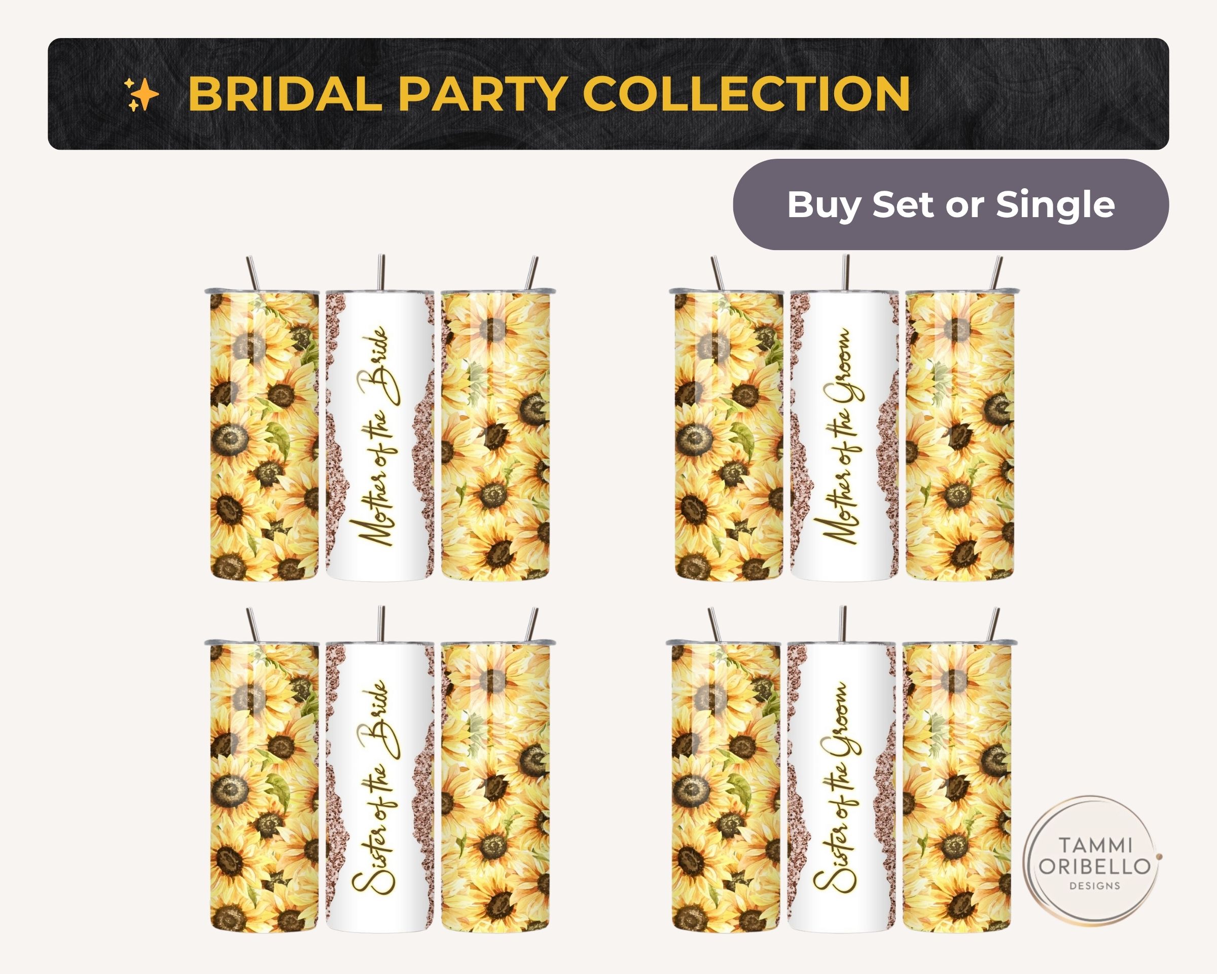 Cheerful sunflower art and a clean name area make a lively, gift-ready cup for every role. Order singles or build a full set (Bridesmaids, MOH, Flower Girl, Moms, Sisters). Add names to make them keepsakes long after the big day.